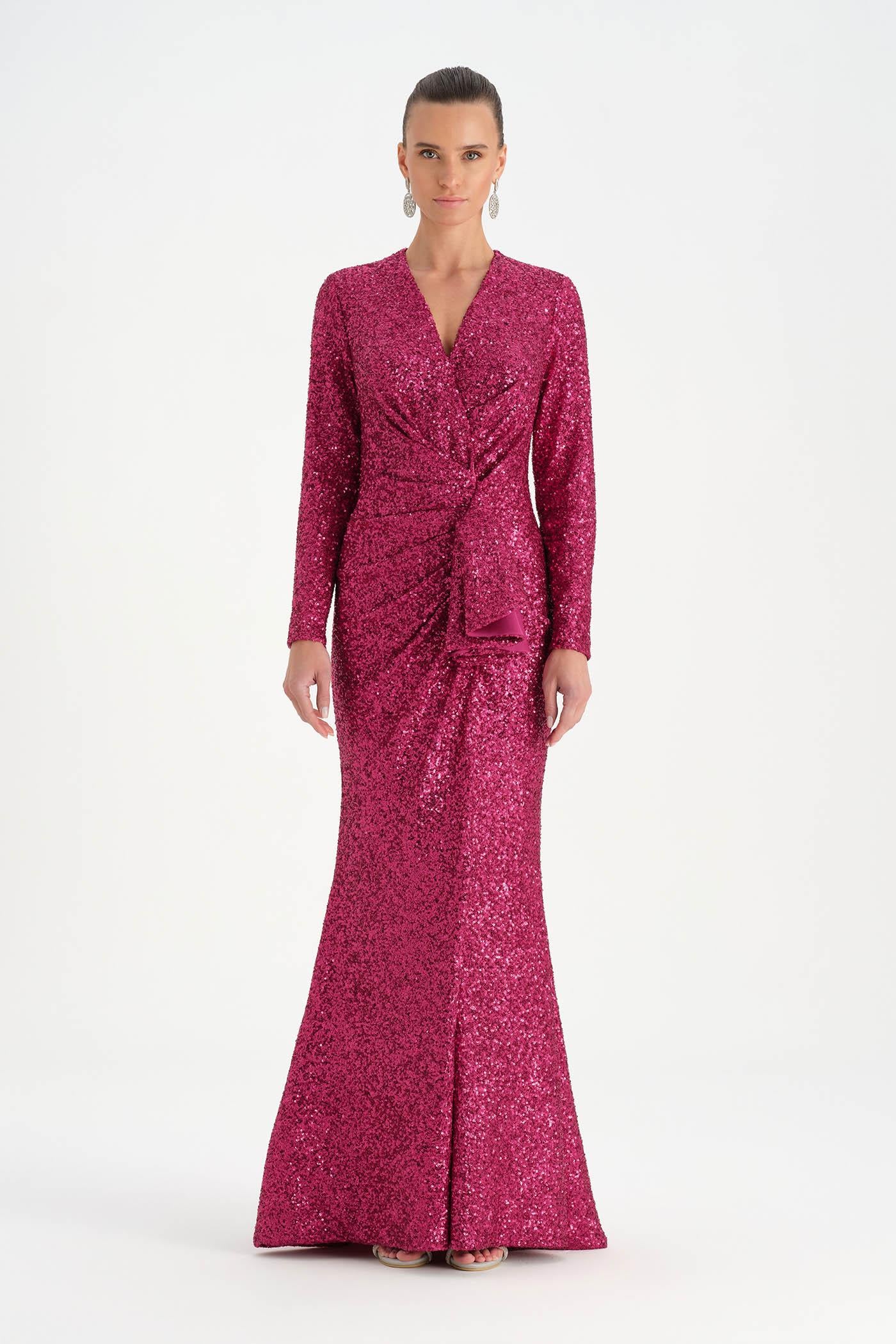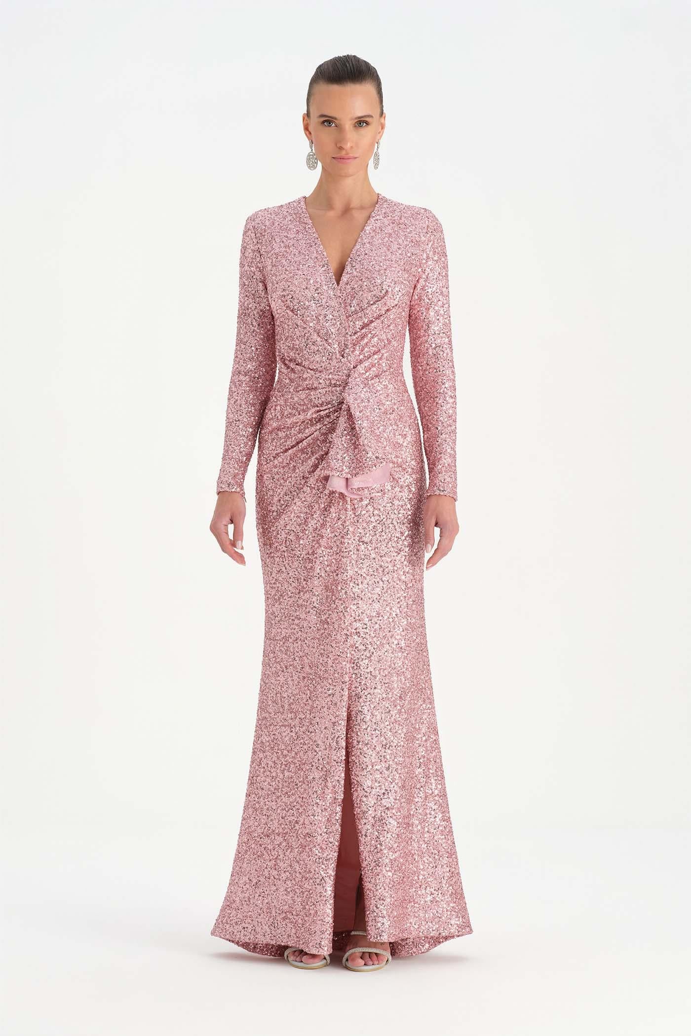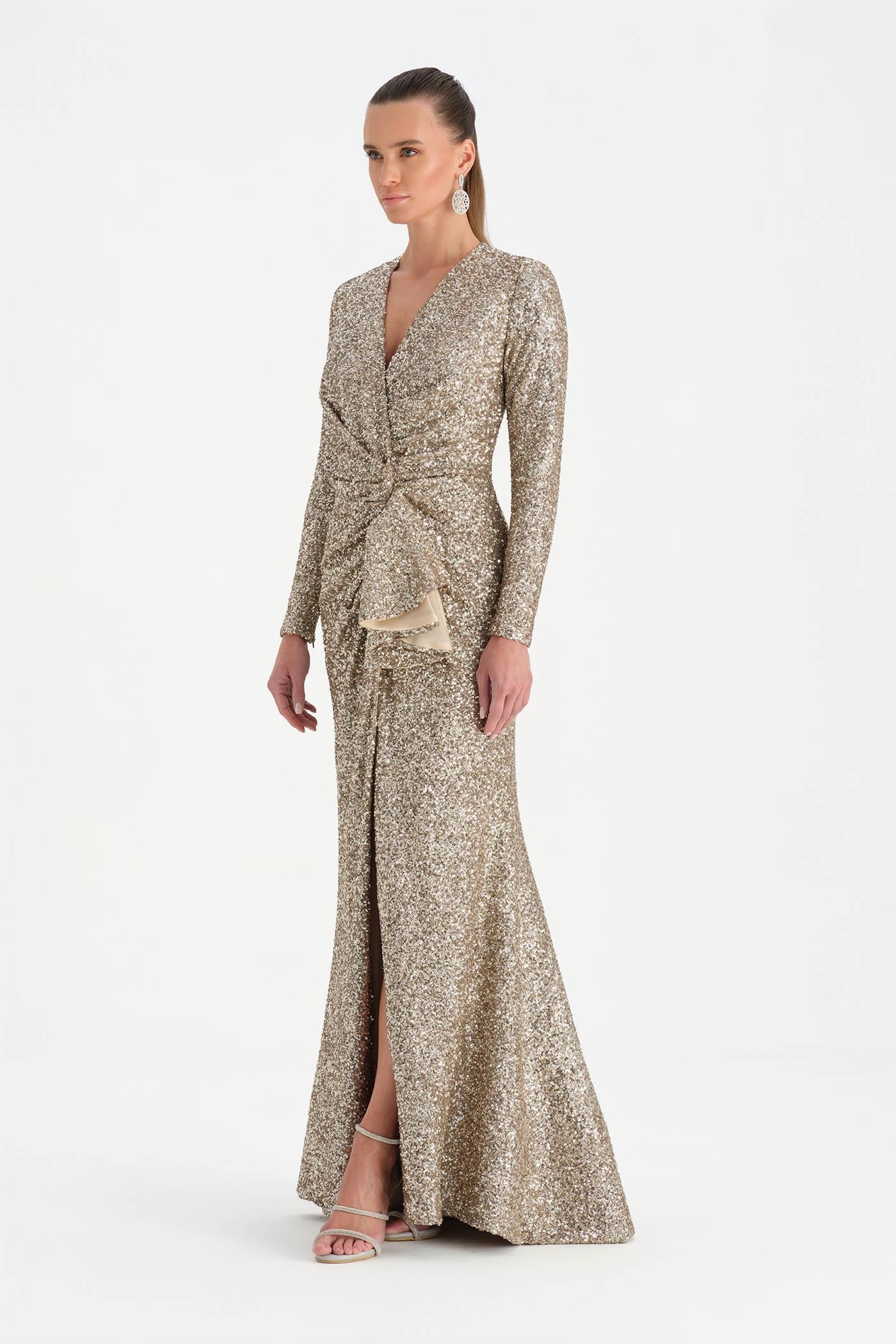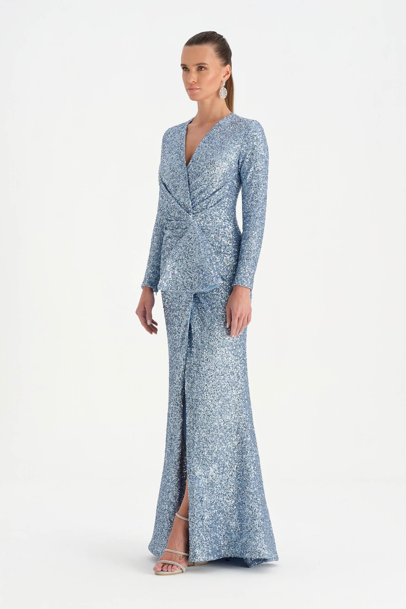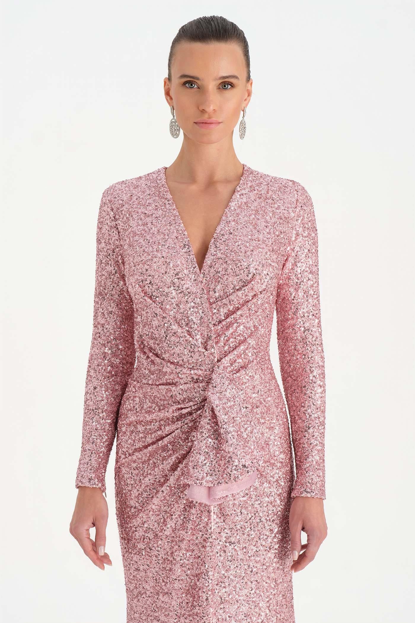 Payetli V Yaka Yırtmaçlı Drapeli Abiye Elbise – 26065C , Işıltılı payet dokusu ve zarif drapeleriyle tasarlanan bu abiye elbise, feminen ve etkileyici bir siluet sunar. V yaka formu üst bedeni zarif biçimde vurgularken, bel çevresindeki drape detayları tasarıma hareket kazandırır. Etek kısmındaki yırtmaç yürüyüşe zarif bir dinamizm katarken, özel davetler ve gece organizasyonları için sofistike ve dikkat çekici bir stil sunar.