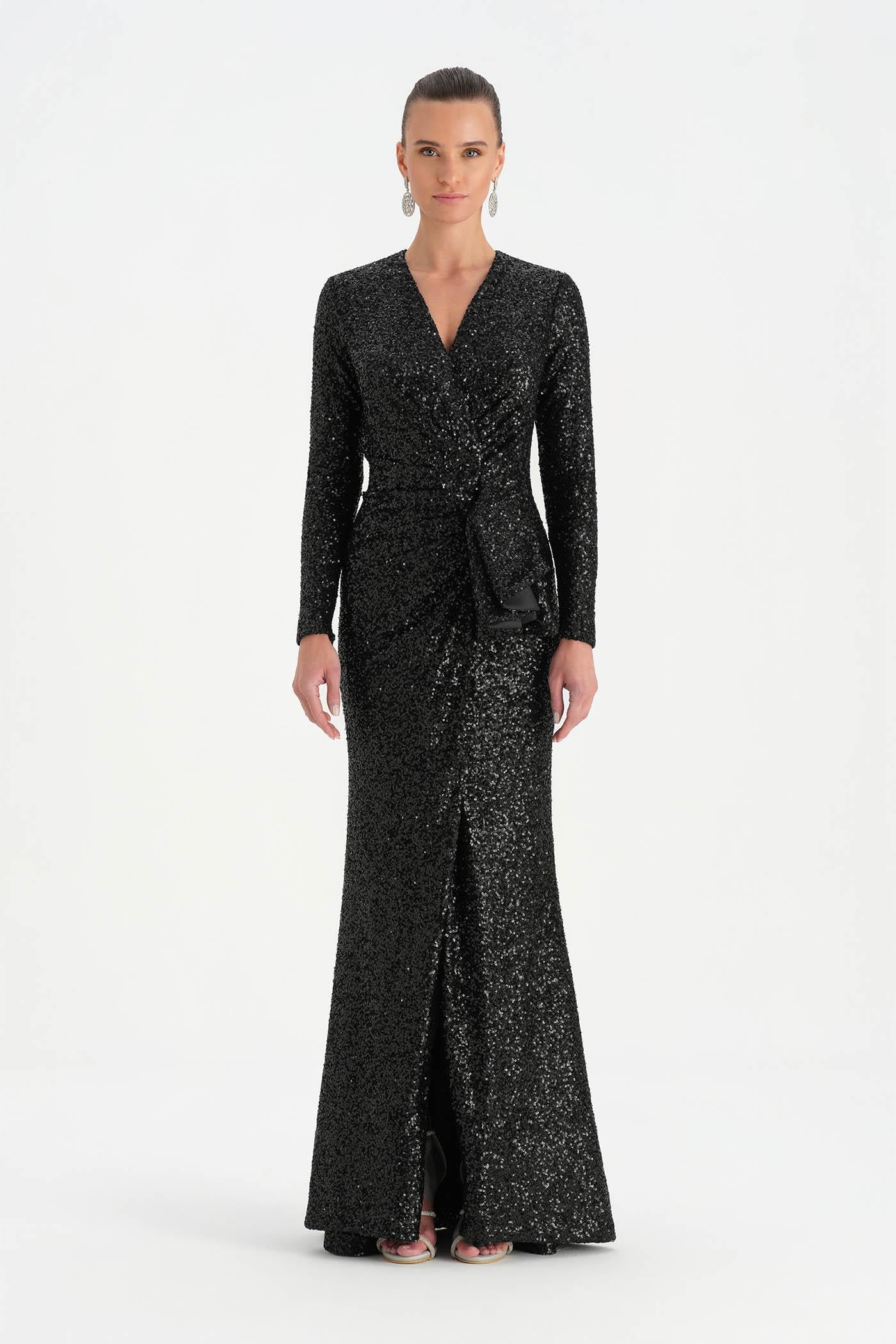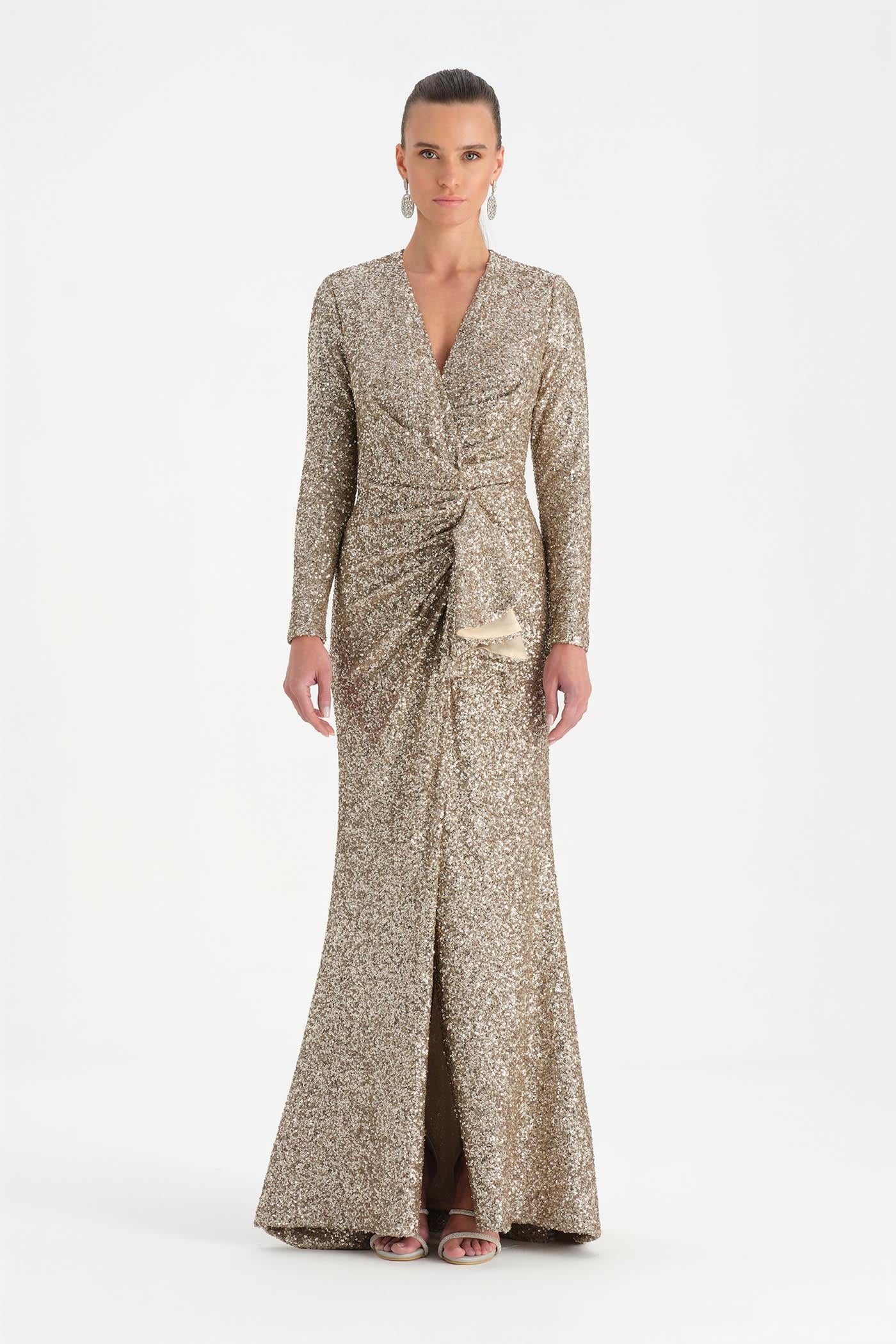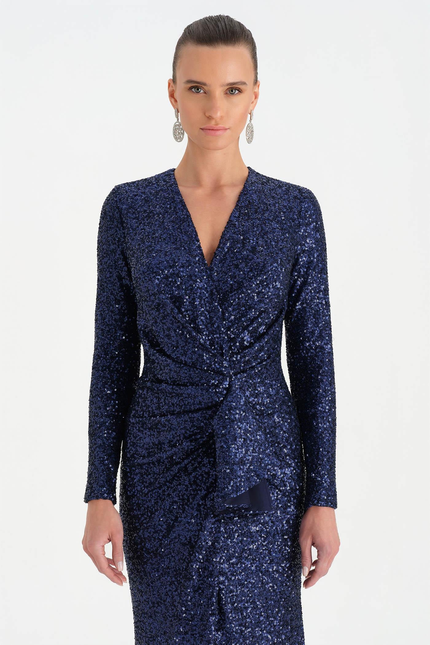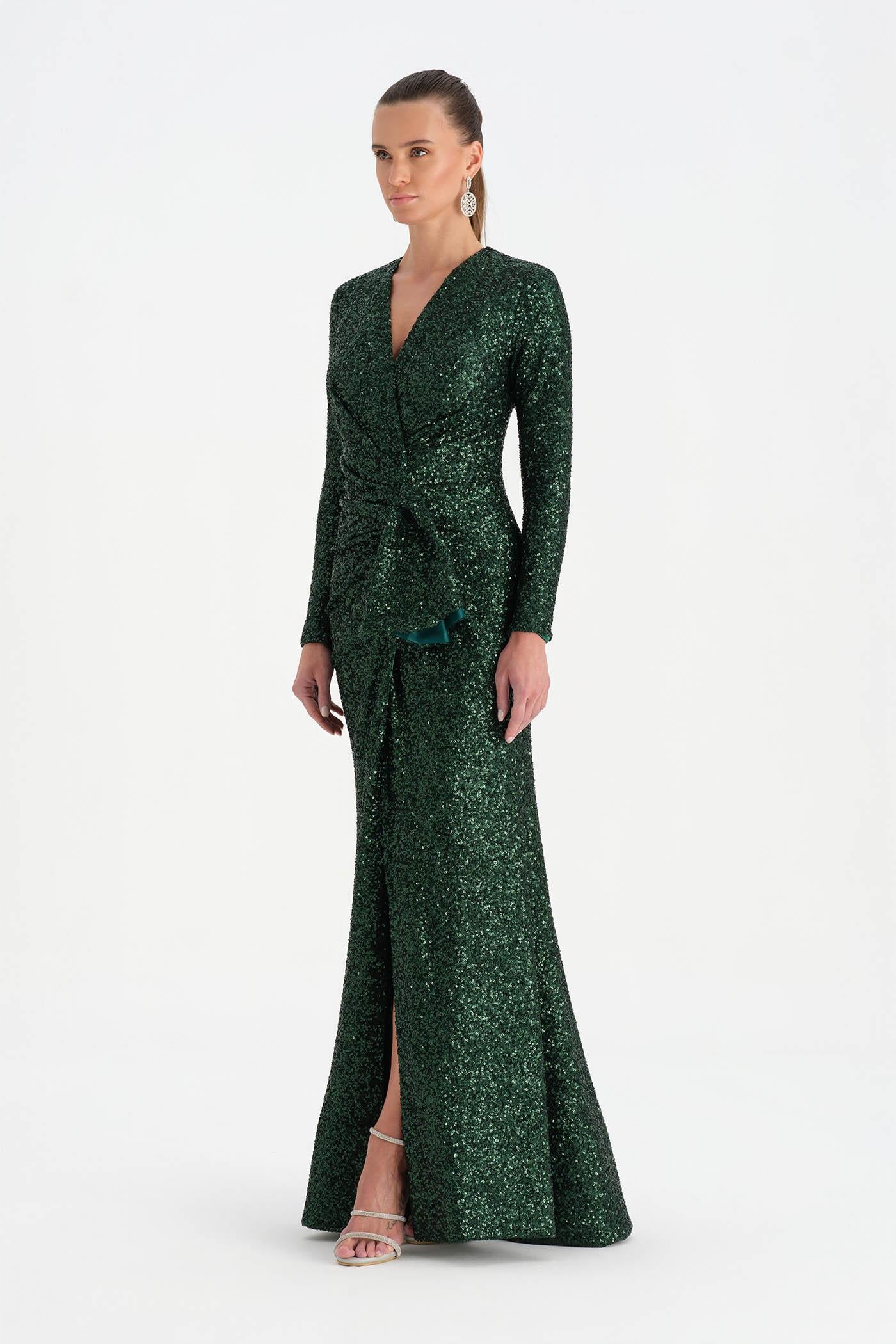 Payetli V Yaka Yırtmaçlı Drapeli Abiye Elbise – 26065C , Işıltılı payet dokusu ve zarif drapeleriyle tasarlanan bu abiye elbise, feminen ve etkileyici bir siluet sunar. V yaka formu üst bedeni zarif biçimde vurgularken, bel çevresindeki drape detayları tasarıma hareket kazandırır. Etek kısmındaki yırtmaç yürüyüşe zarif bir dinamizm katarken, özel davetler ve gece organizasyonları için sofistike ve dikkat çekici bir stil sunar.