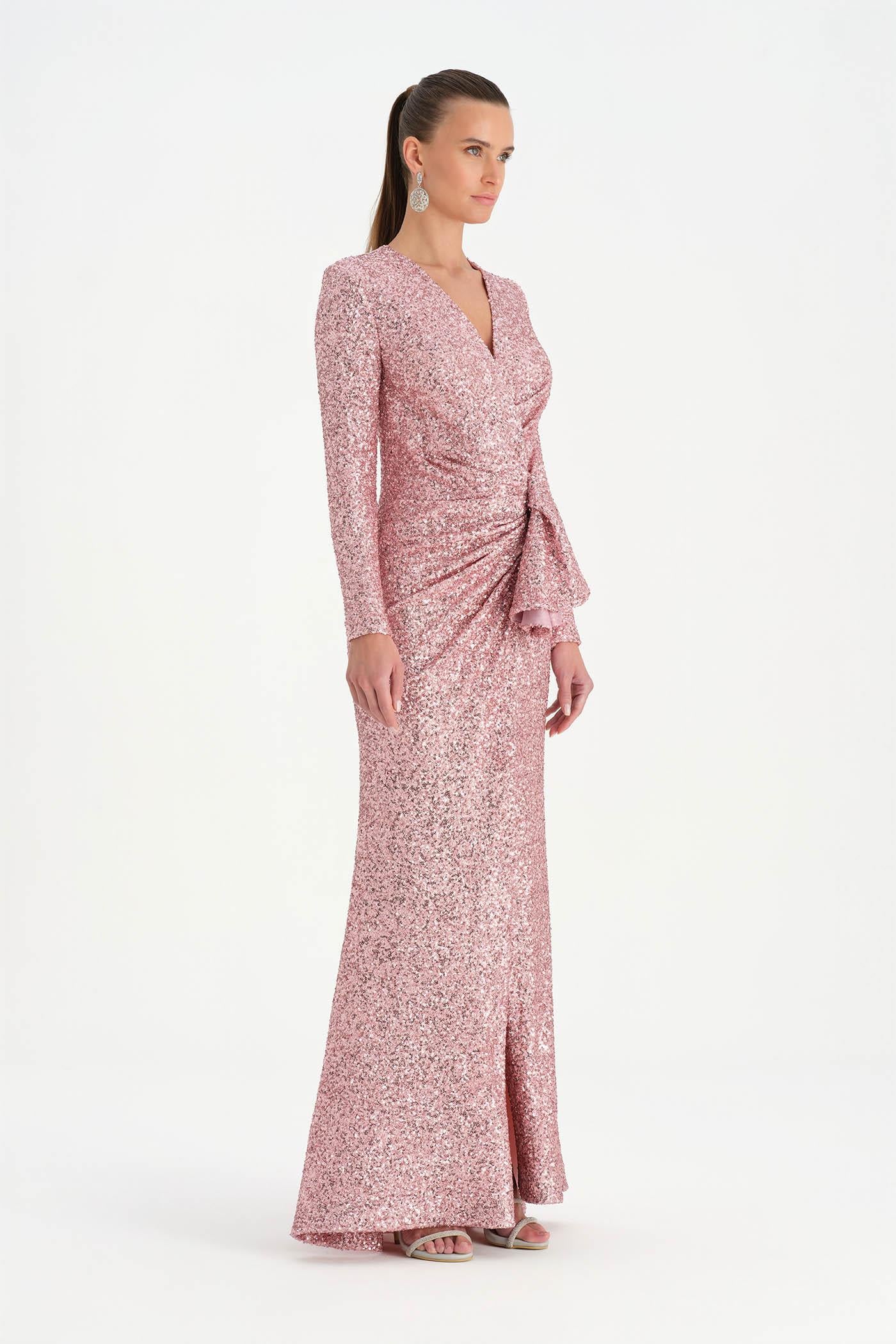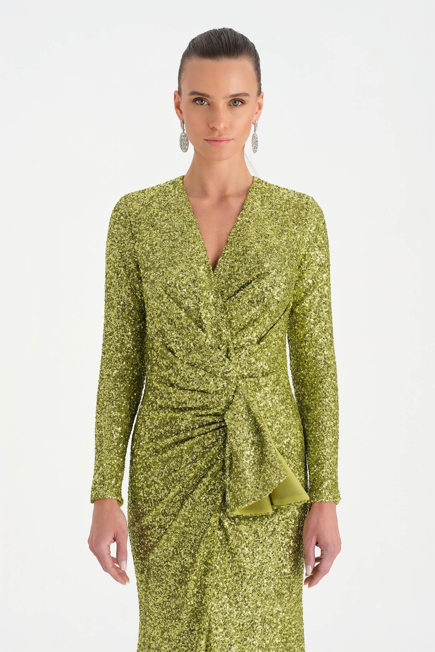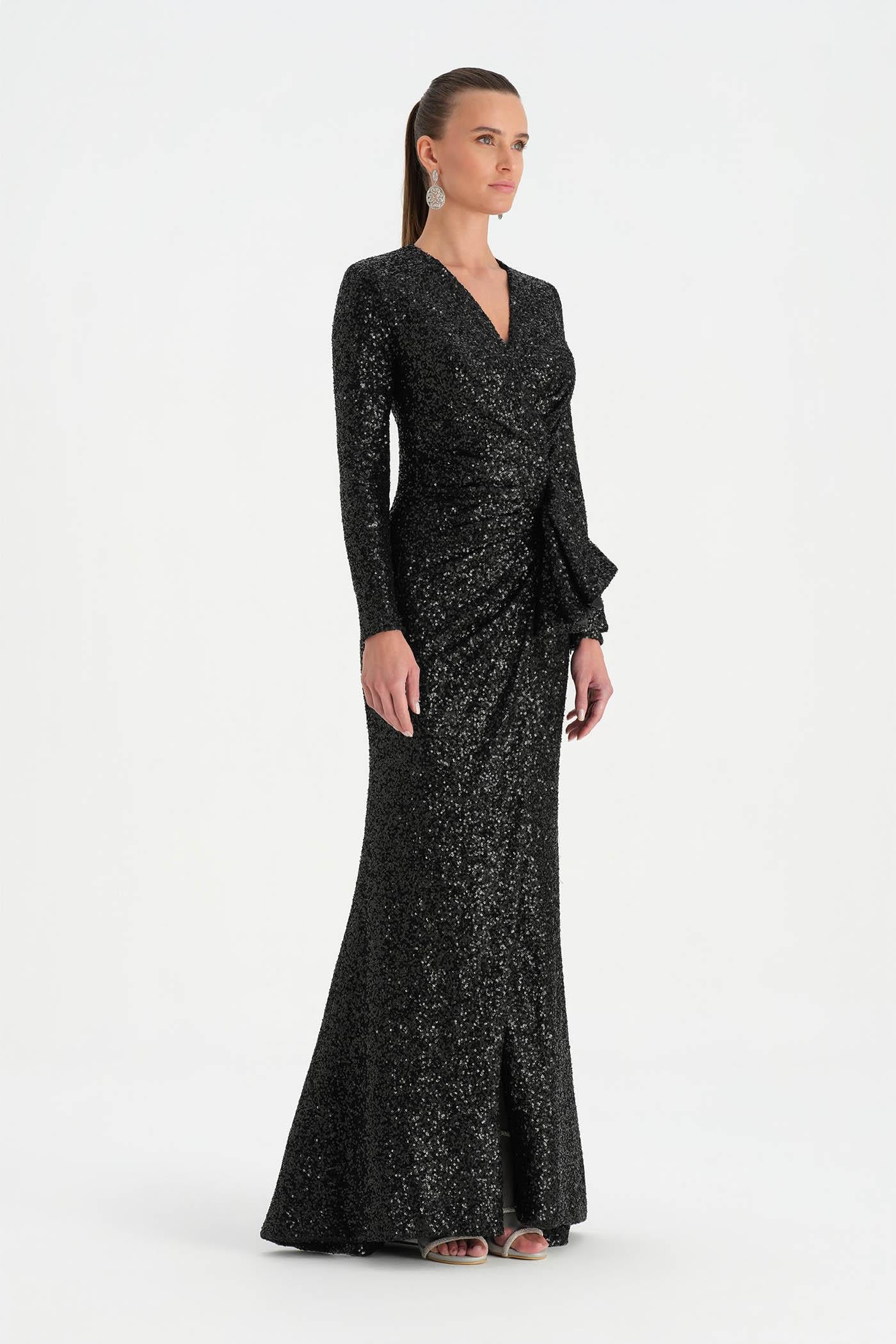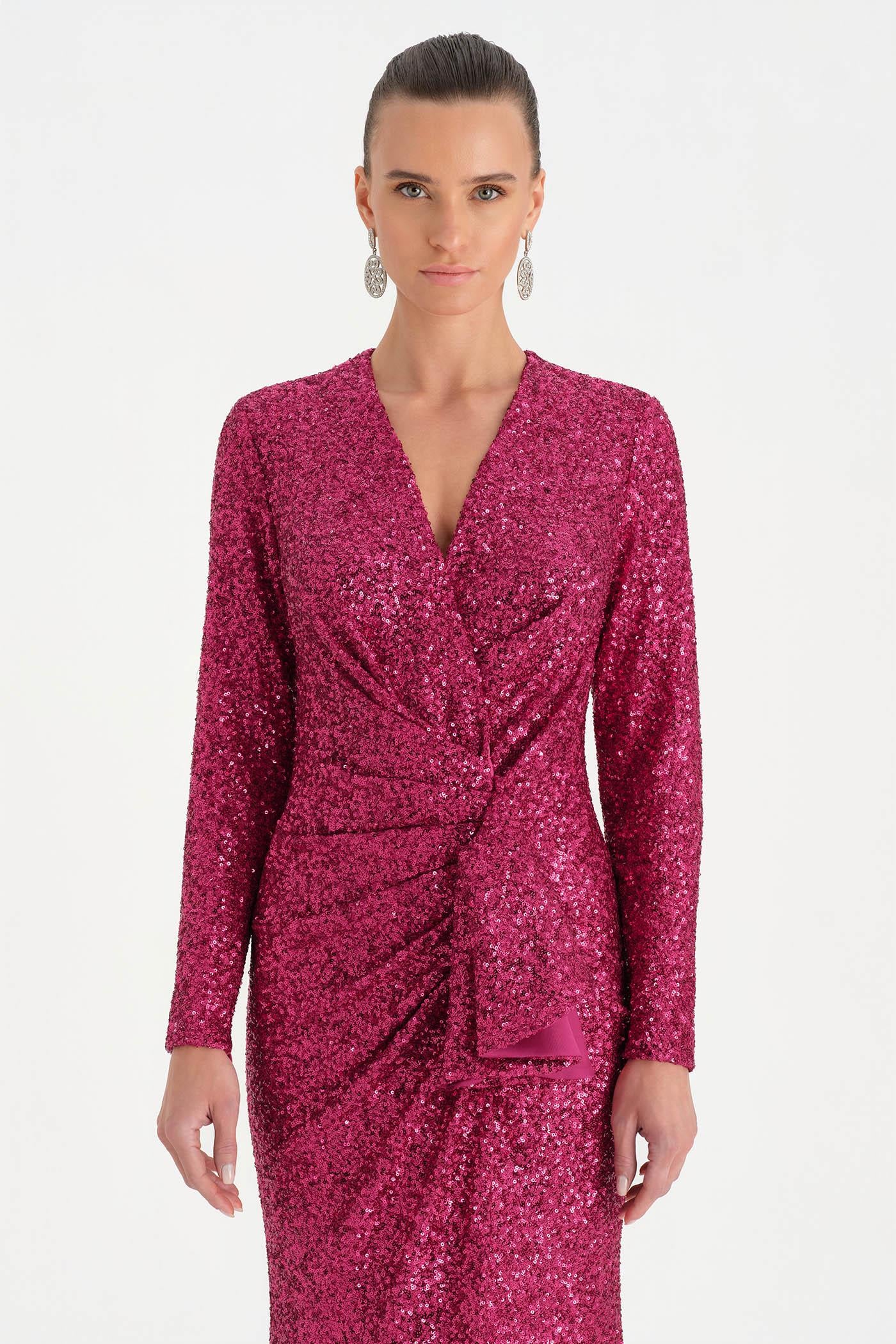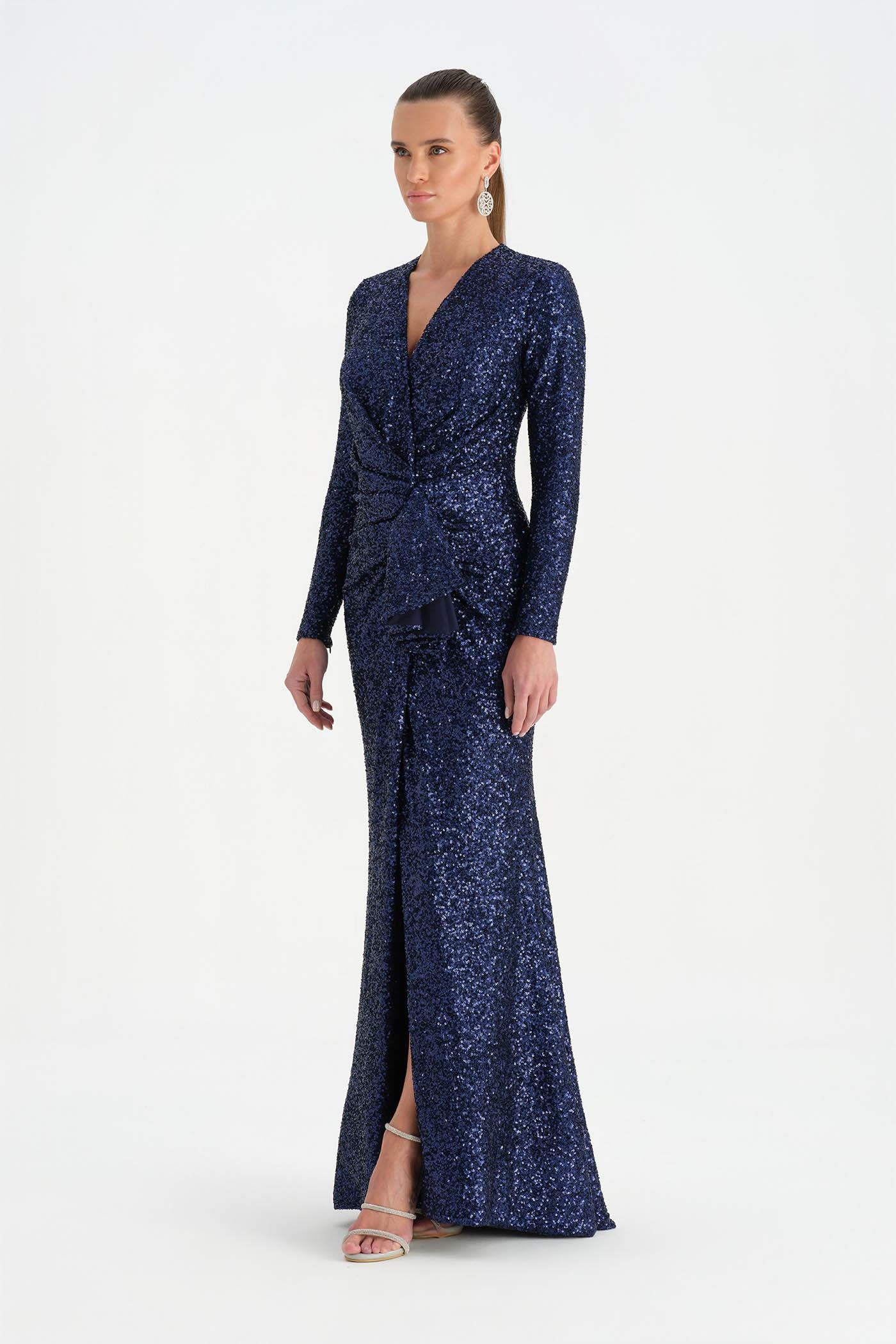Payetli V Yaka Yırtmaçlı Drapeli Abiye Elbise – 26065C , Işıltılı payet dokusu ve zarif drapeleriyle tasarlanan bu abiye elbise, feminen ve etkileyici bir siluet sunar. V yaka formu üst bedeni zarif biçimde vurgularken, bel çevresindeki drape detayları tasarıma hareket kazandırır. Etek kısmındaki yırtmaç yürüyüşe zarif bir dinamizm katarken, özel davetler ve gece organizasyonları için sofistike ve dikkat çekici bir stil sunar.