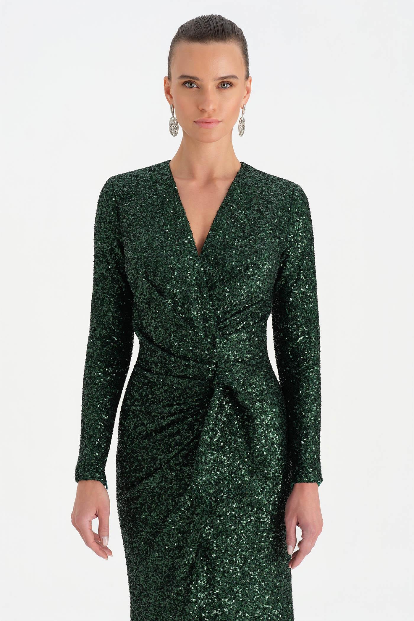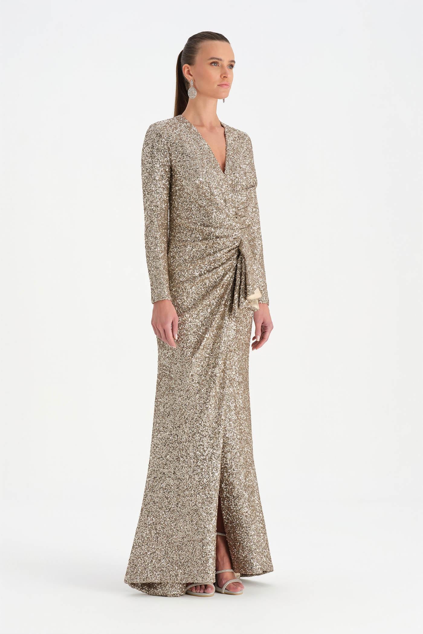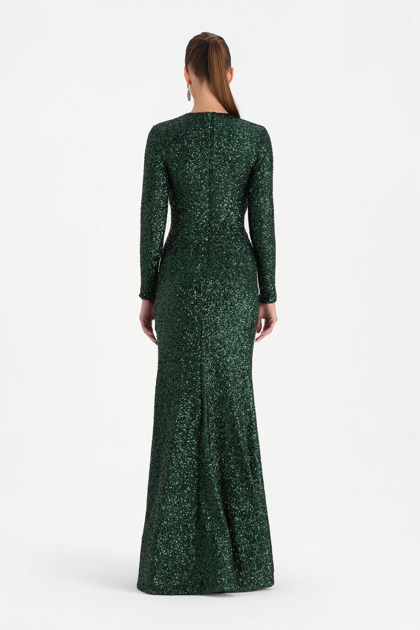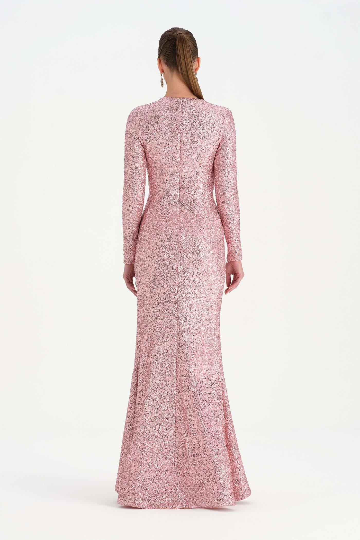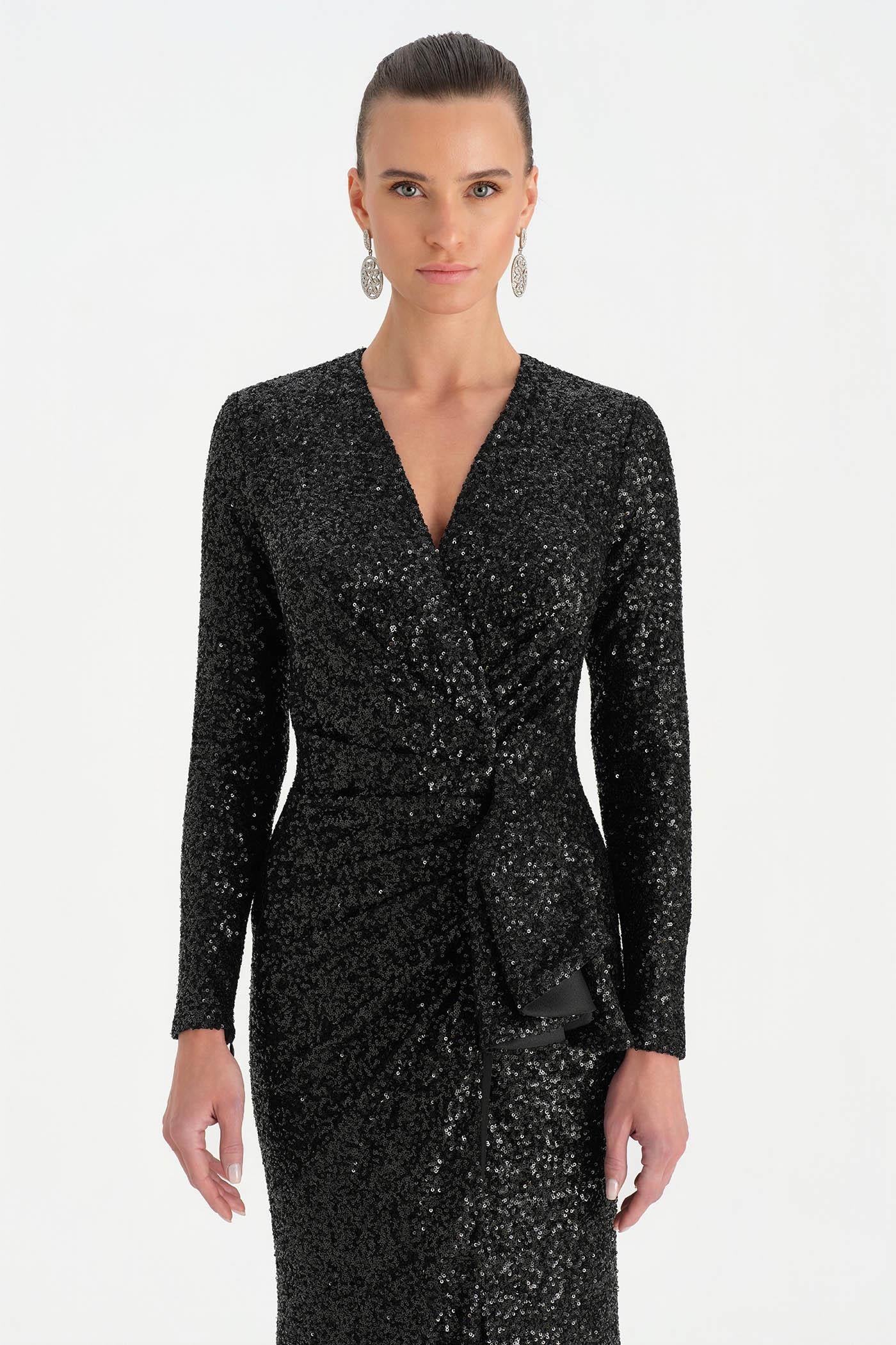 Payetli V Yaka Yırtmaçlı Drapeli Abiye Elbise – 26065C , Işıltılı payet dokusu ve zarif drapeleriyle tasarlanan bu abiye elbise, feminen ve etkileyici bir siluet sunar. V yaka formu üst bedeni zarif biçimde vurgularken, bel çevresindeki drape detayları tasarıma hareket kazandırır. Etek kısmındaki yırtmaç yürüyüşe zarif bir dinamizm katarken, özel davetler ve gece organizasyonları için sofistike ve dikkat çekici bir stil sunar.