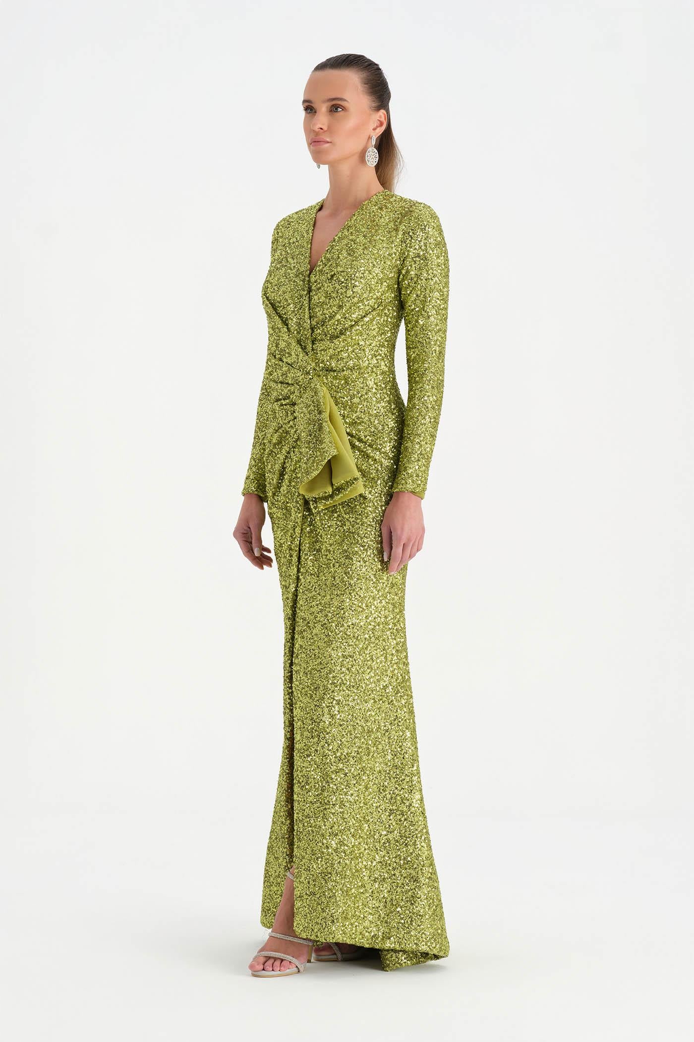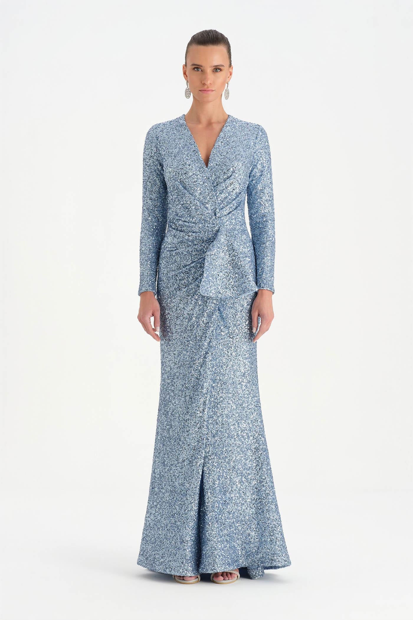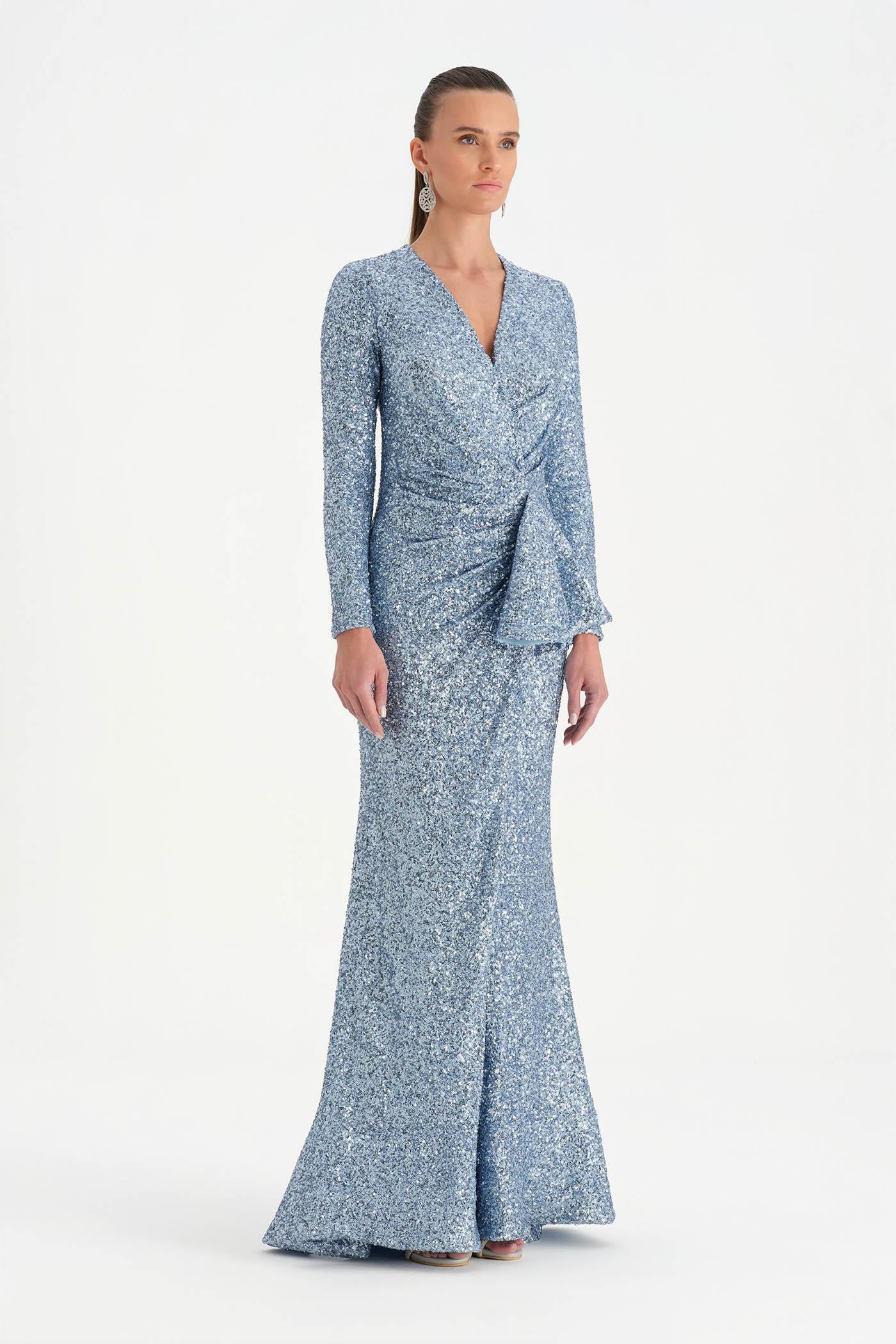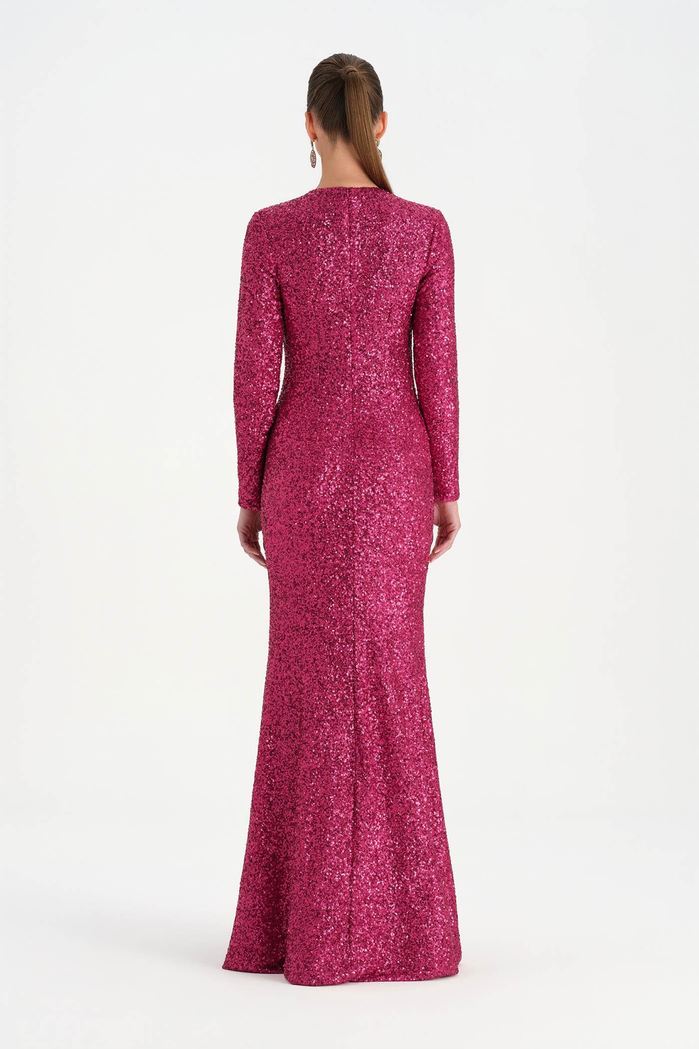 Payetli V Yaka Yırtmaçlı Drapeli Abiye Elbise – 26065C , Işıltılı payet dokusu ve zarif drapeleriyle tasarlanan bu abiye elbise, feminen ve etkileyici bir siluet sunar. V yaka formu üst bedeni zarif biçimde vurgularken, bel çevresindeki drape detayları tasarıma hareket kazandırır. Etek kısmındaki yırtmaç yürüyüşe zarif bir dinamizm katarken, özel davetler ve gece organizasyonları için sofistike ve dikkat çekici bir stil sunar.