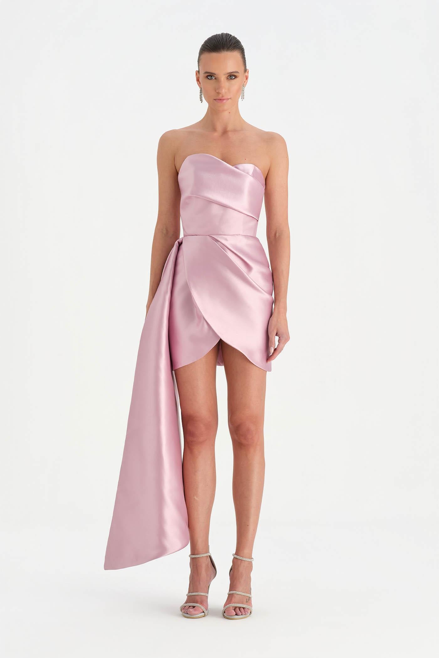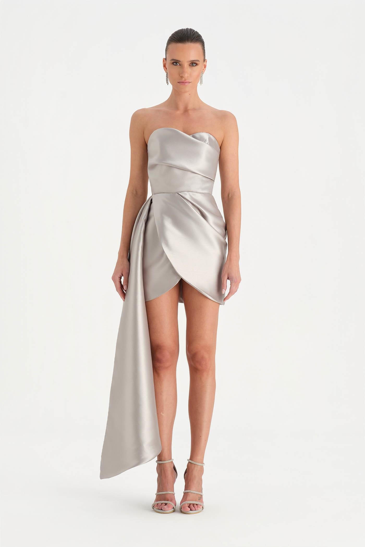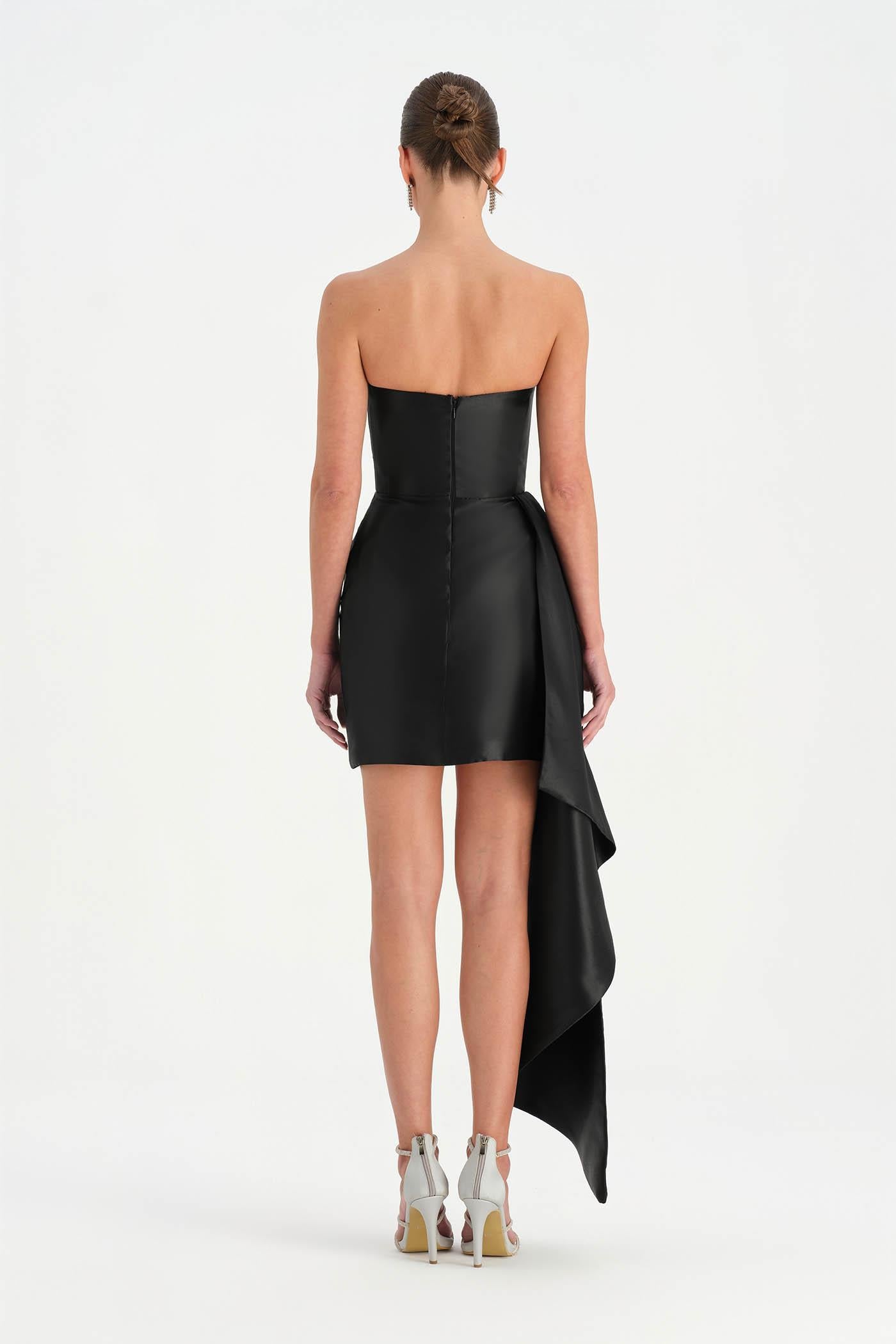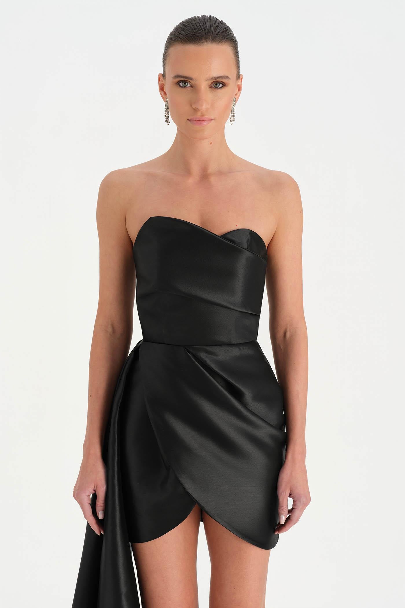 Belden Kuyruklu Mini Kısa Abiye Elbise – 26137C , Modern ve iddialı tasarımıyla dikkat çeken bu mini abiye elbise, straplez kesimi ve heykelsi formuyla güçlü bir siluet sunar. Bel kısmından uzanan kuyruk detayı tasarıma dramatik bir hareket kazandırırken, kısa etek formu dinamik ve modern bir görünüm oluşturur. Vücuda uyum sağlayan yapısı sayesinde özel davetler ve gece organizasyonlarında dikkat çekici bir stil sunar.