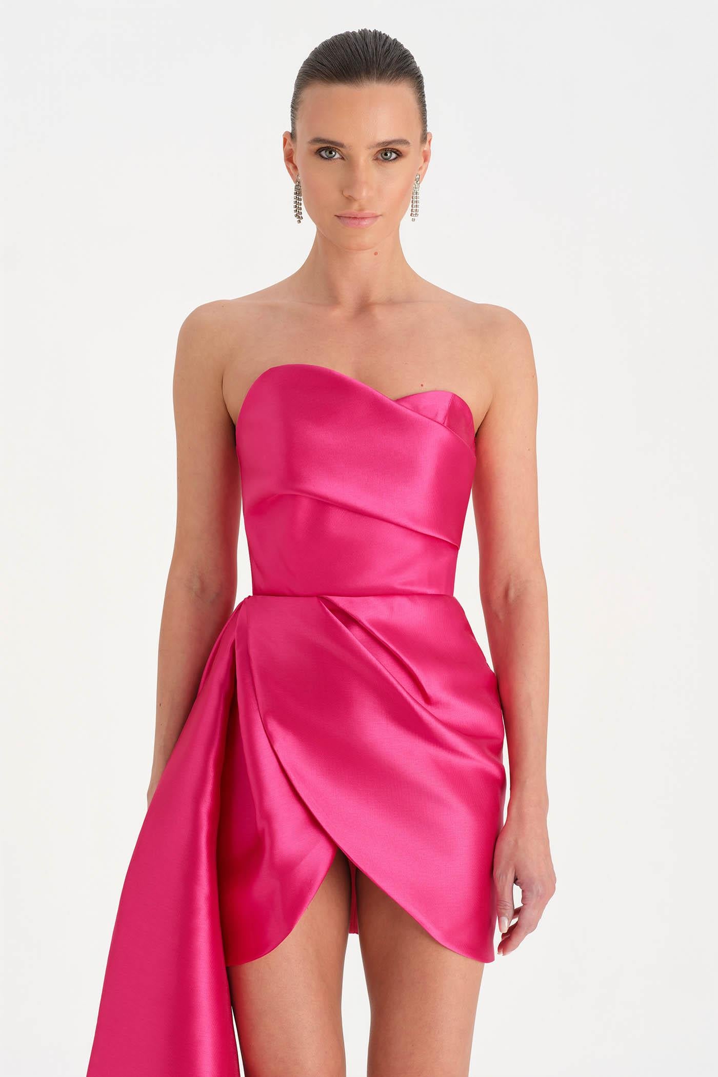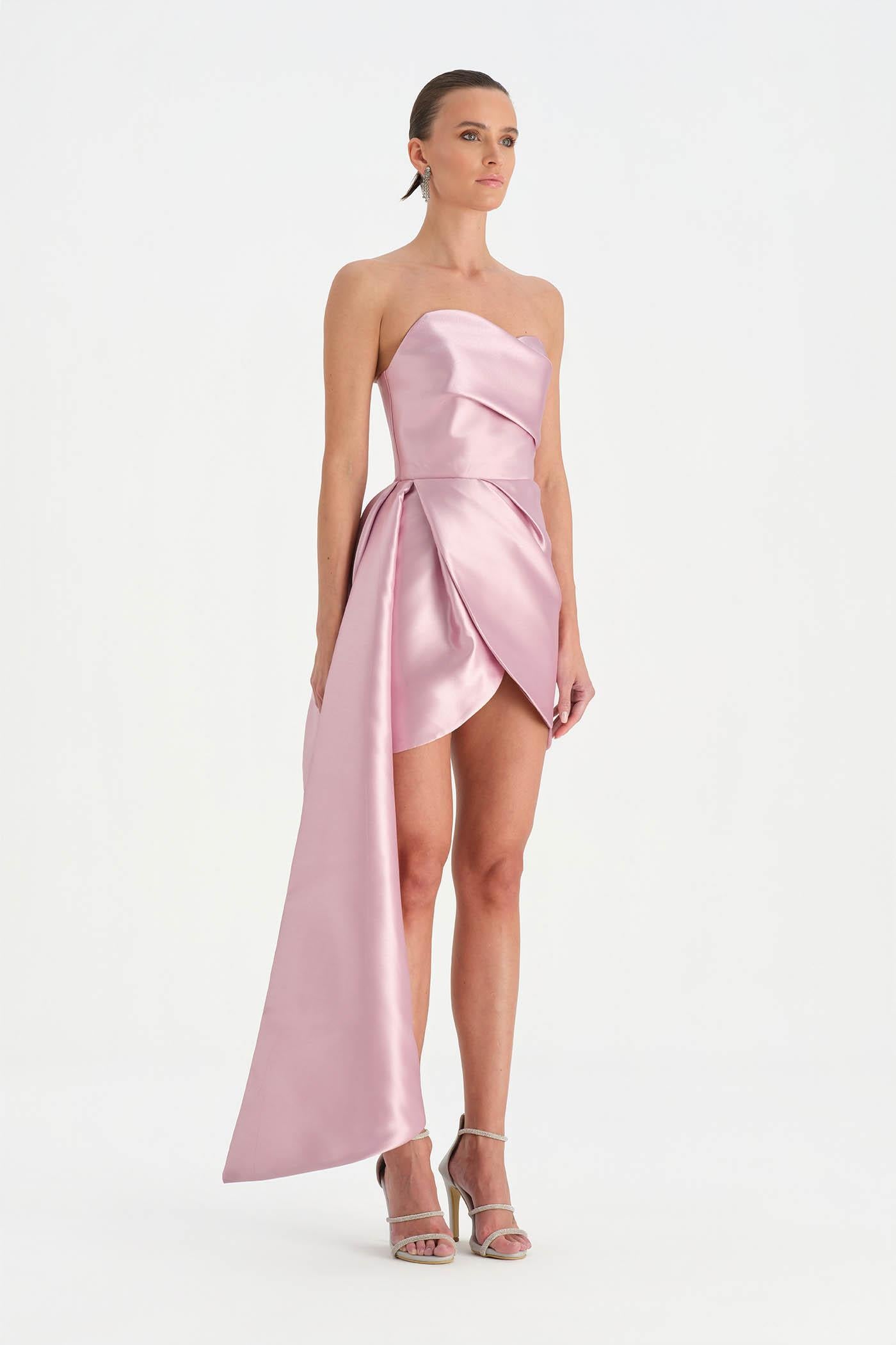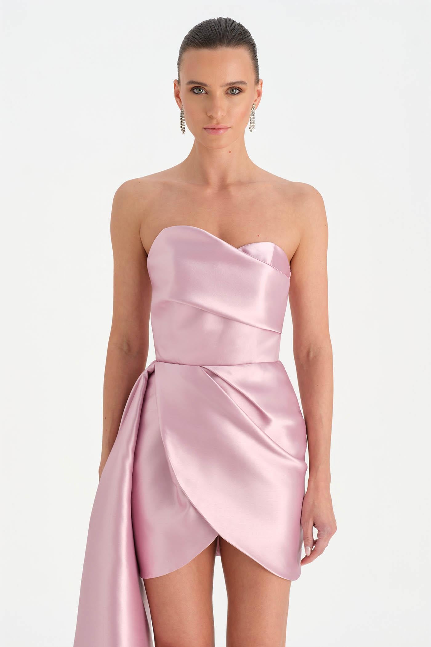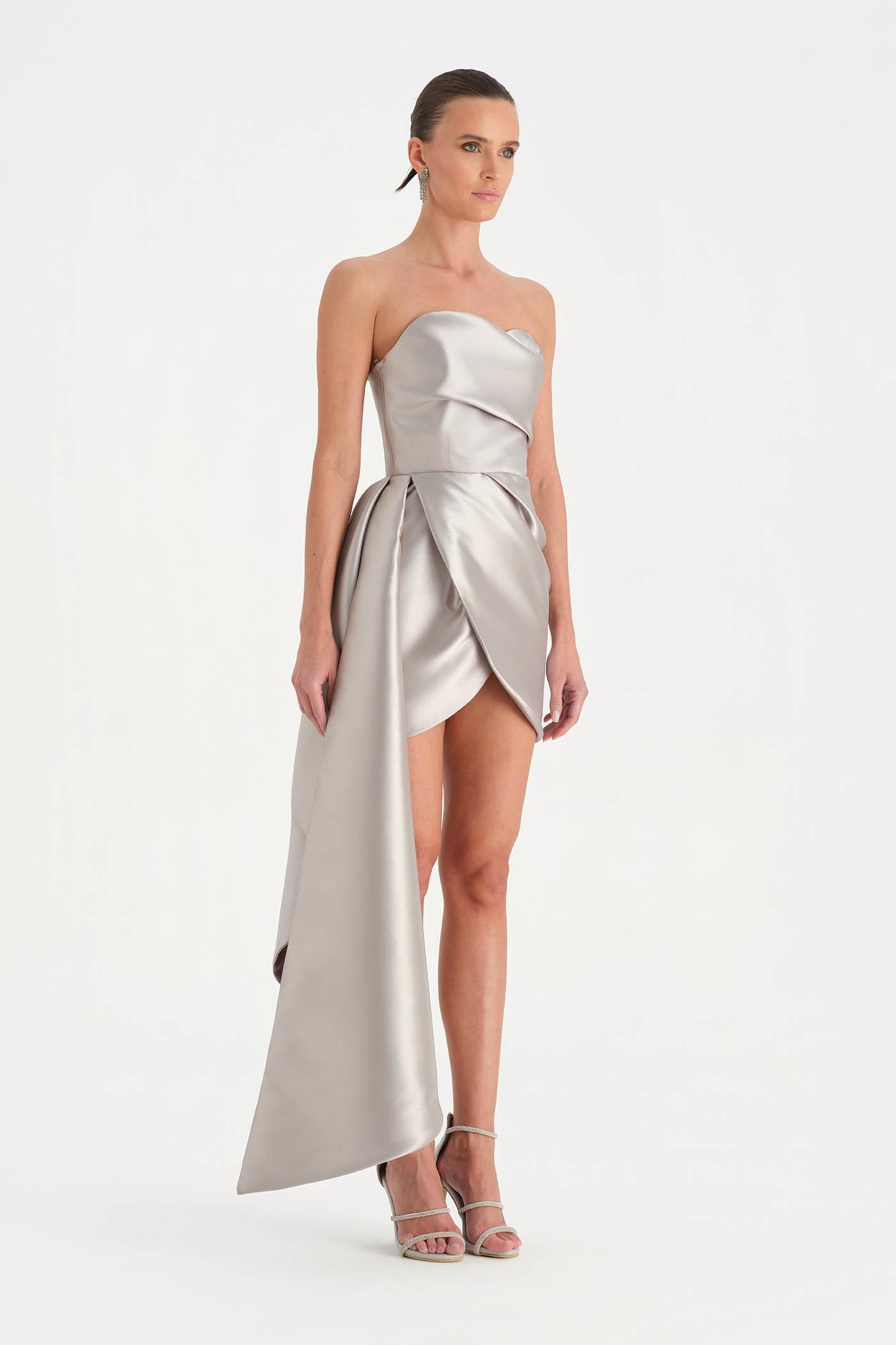 Belden Kuyruklu Mini Kısa Abiye Elbise – 26137C , Modern ve iddialı tasarımıyla dikkat çeken bu mini abiye elbise, straplez kesimi ve heykelsi formuyla güçlü bir siluet sunar. Bel kısmından uzanan kuyruk detayı tasarıma dramatik bir hareket kazandırırken, kısa etek formu dinamik ve modern bir görünüm oluşturur. Vücuda uyum sağlayan yapısı sayesinde özel davetler ve gece organizasyonlarında dikkat çekici bir stil sunar.