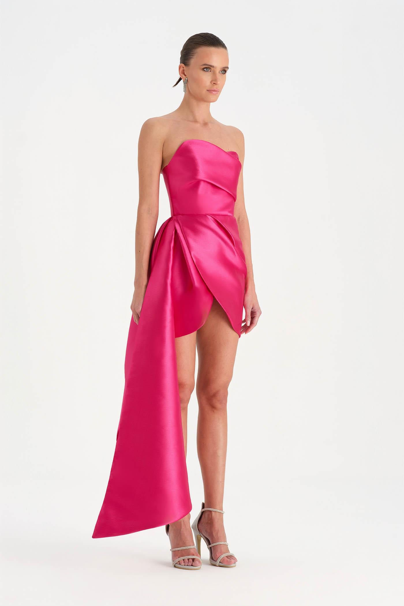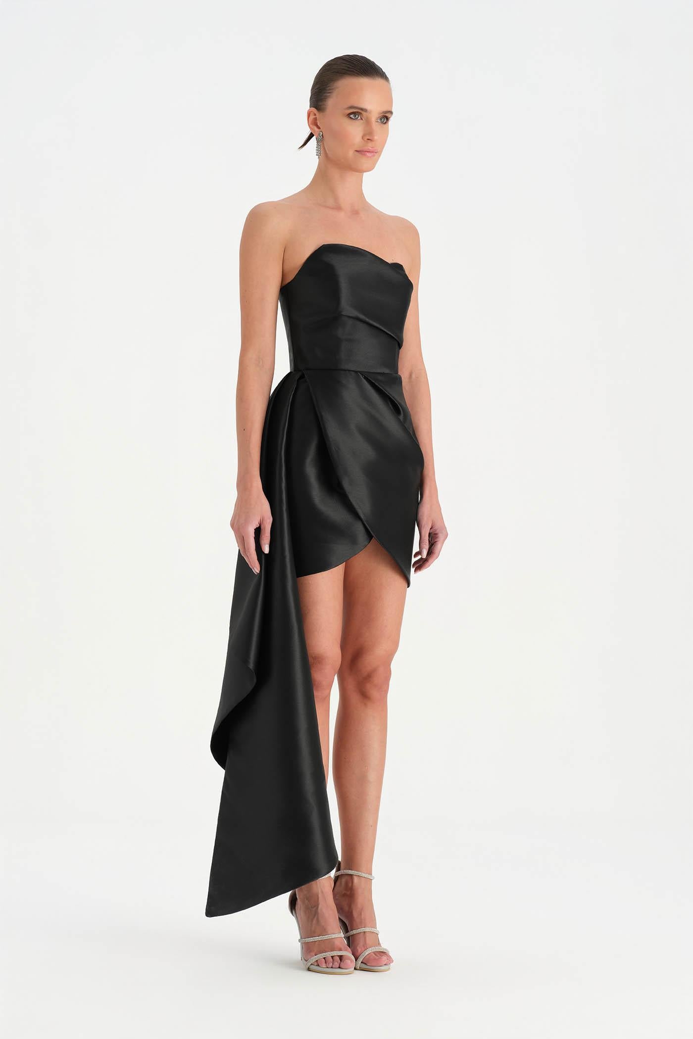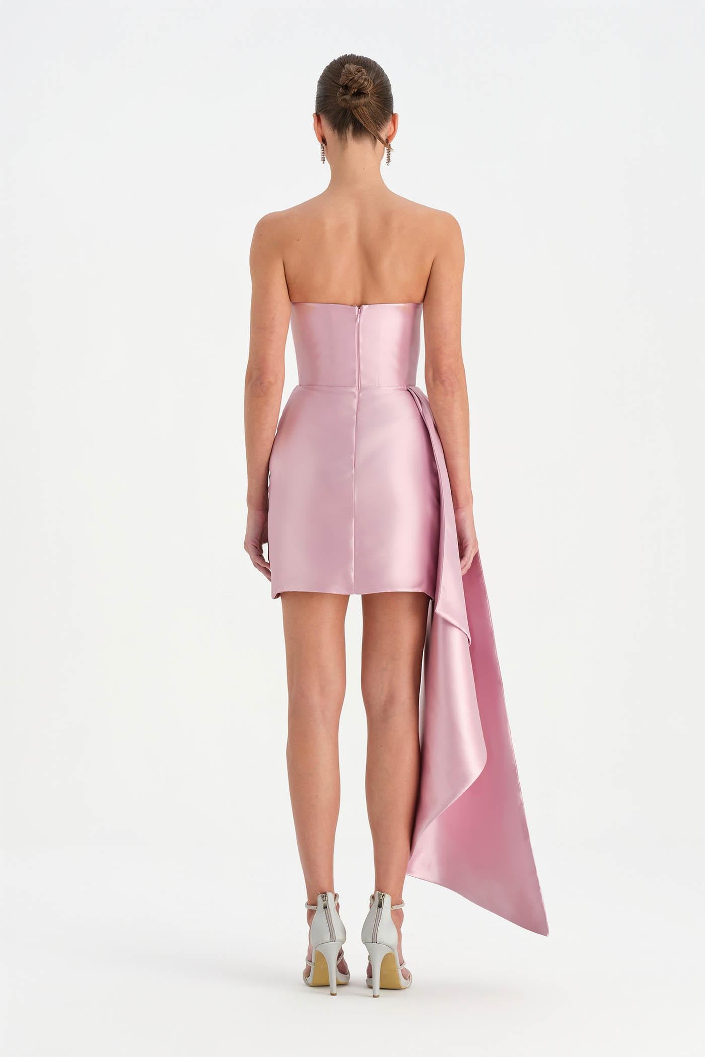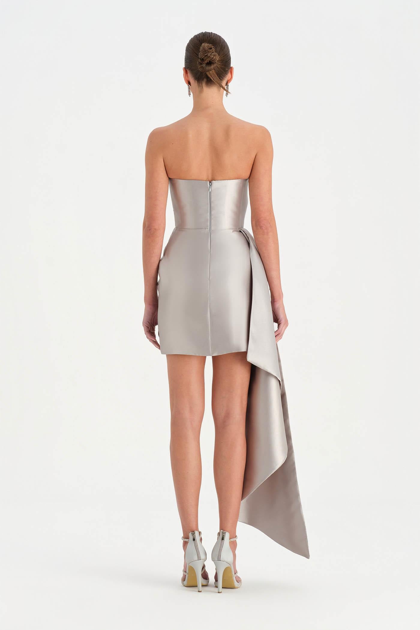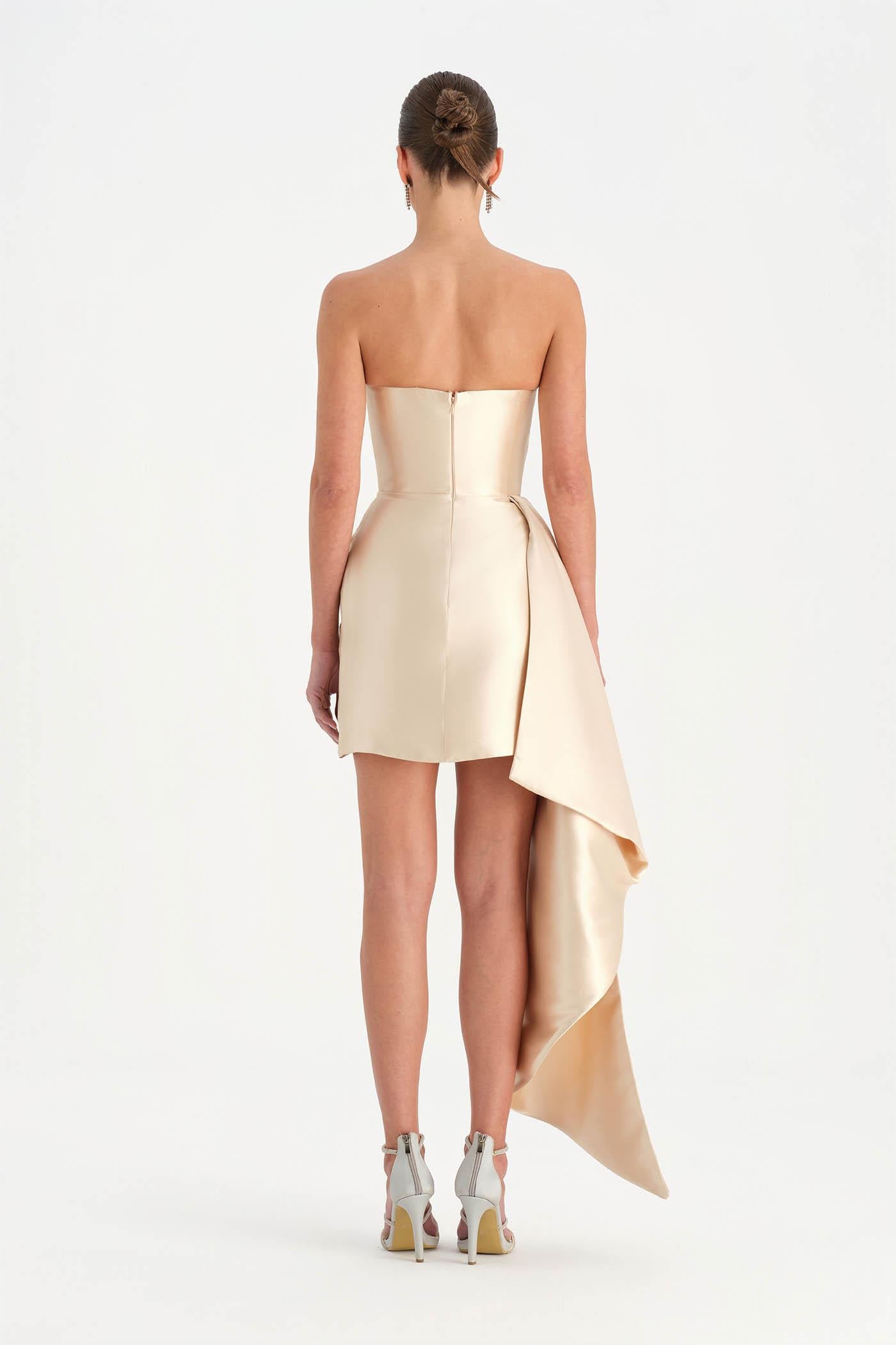 Belden Kuyruklu Mini Kısa Abiye Elbise – 26137C , Modern ve iddialı tasarımıyla dikkat çeken bu mini abiye elbise, straplez kesimi ve heykelsi formuyla güçlü bir siluet sunar. Bel kısmından uzanan kuyruk detayı tasarıma dramatik bir hareket kazandırırken, kısa etek formu dinamik ve modern bir görünüm oluşturur. Vücuda uyum sağlayan yapısı sayesinde özel davetler ve gece organizasyonlarında dikkat çekici bir stil sunar.
