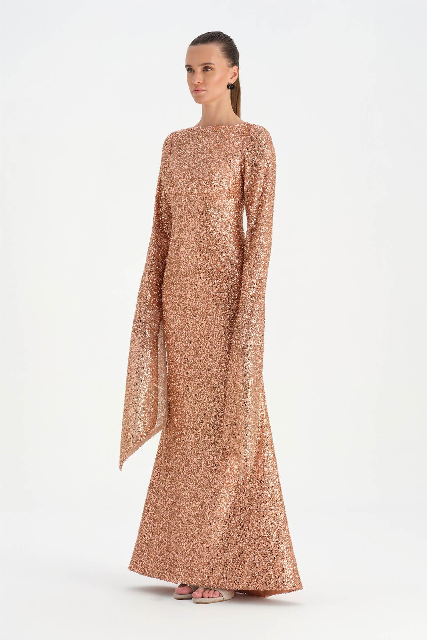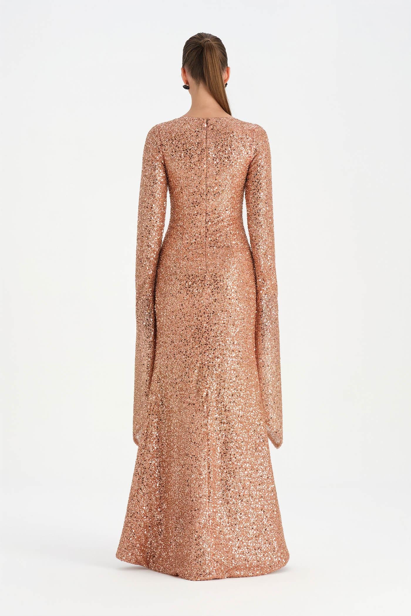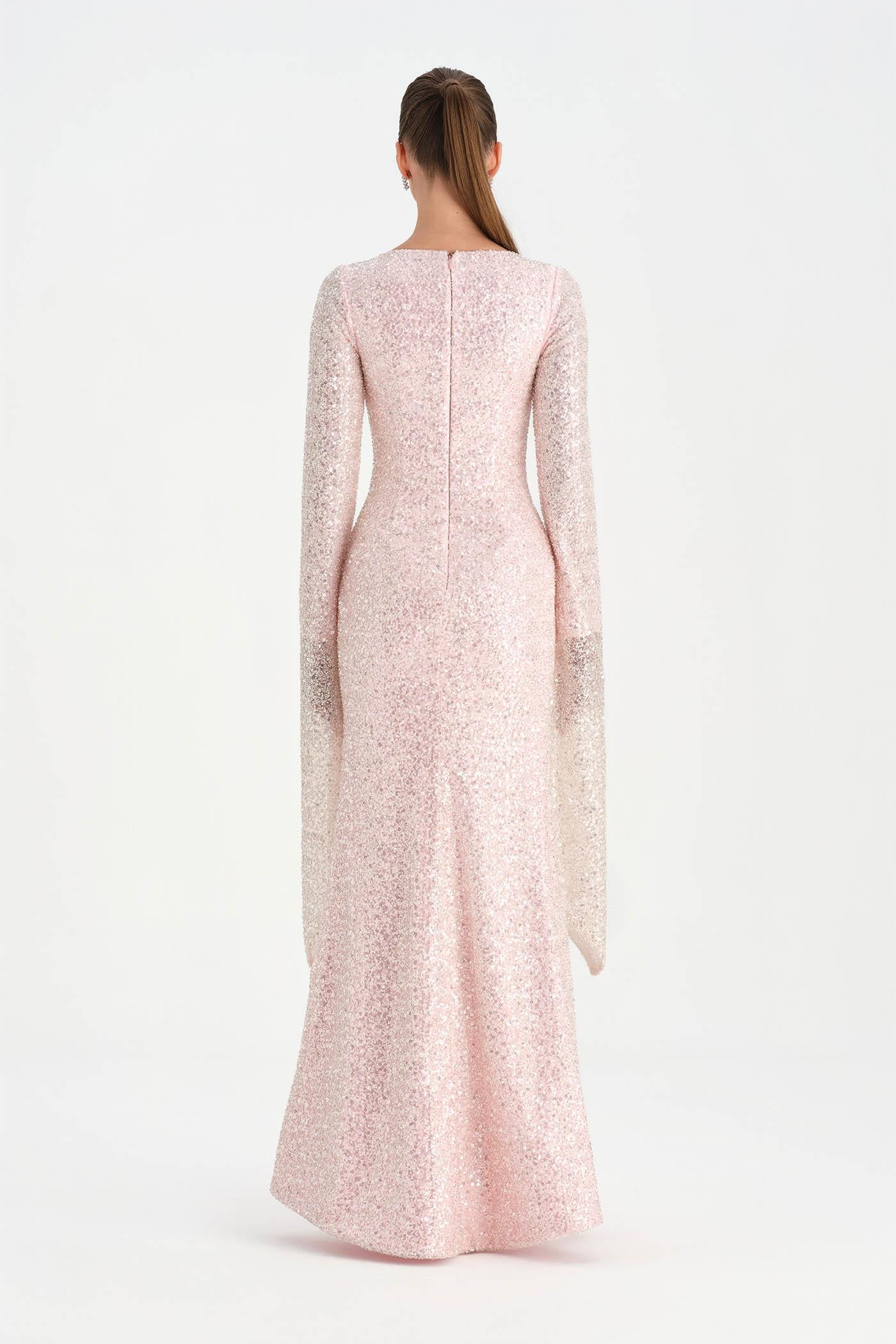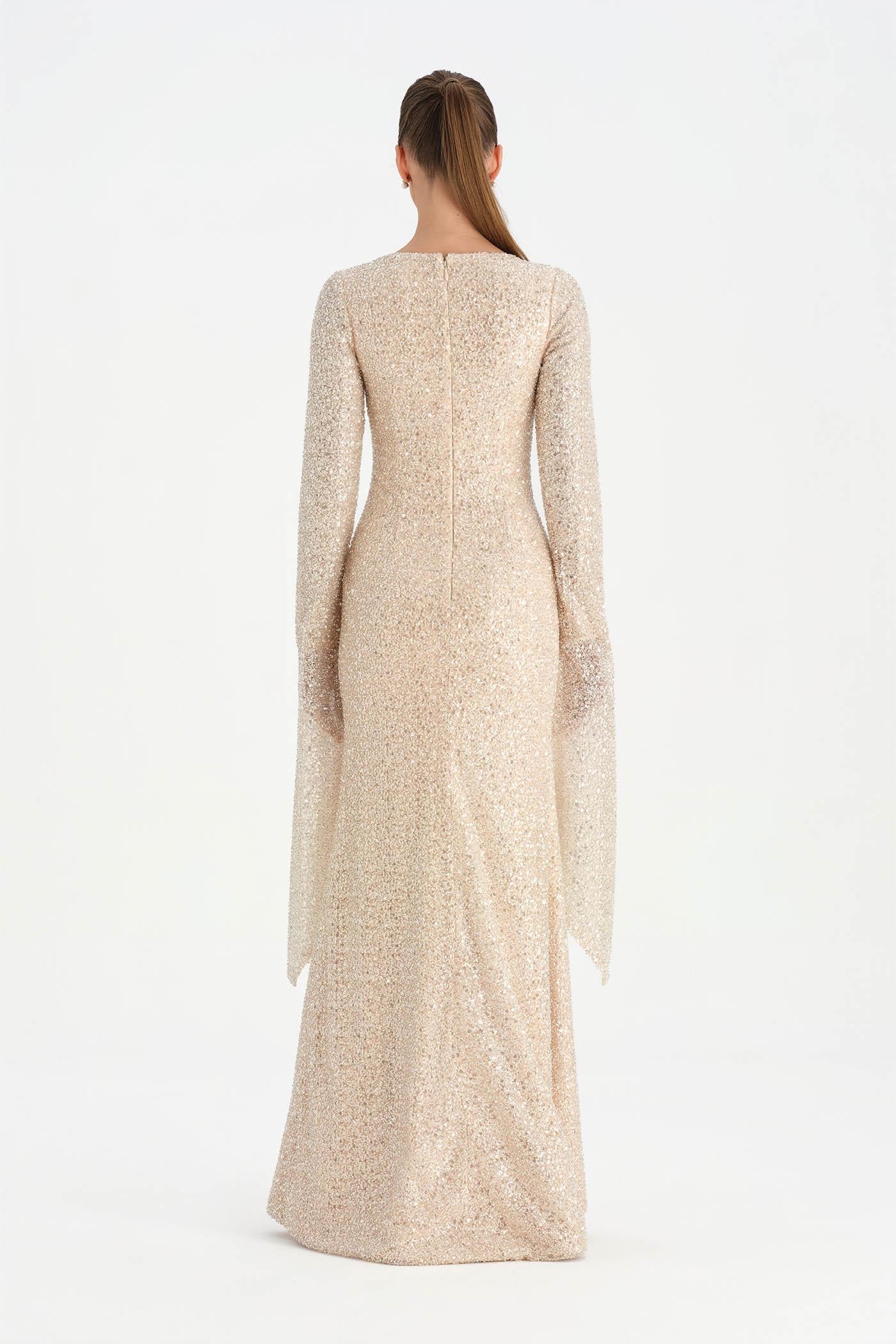 Taşlı Tesettür Abiye Elbise – 26070C , Zarif ve dengeli tasarımıyla öne çıkan bu tesettür abiye elbise, taş işlemeli dokusuyla sofistike bir görünüm sunar. Uzun ve akıcı formu vücut siluetini zarif biçimde tamamlarken, geniş ve pelerin etkisi yaratan kol detayı tasarıma özgün bir karakter kazandırır. Işıltılı dokusu ve sade çizgileriyle özel davetler ve şık organizasyonlar için zarif ve etkileyici bir seçenek oluşturur.