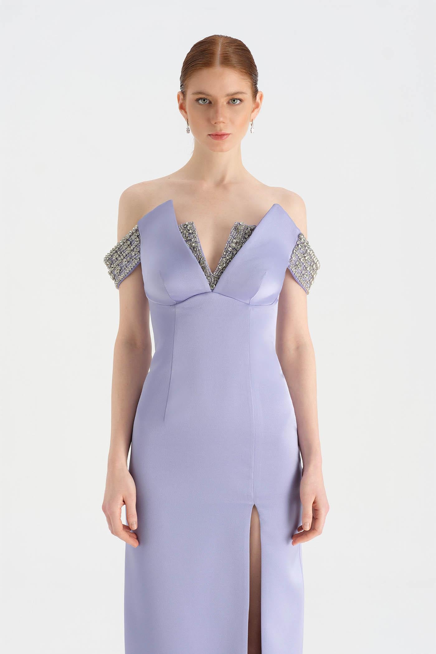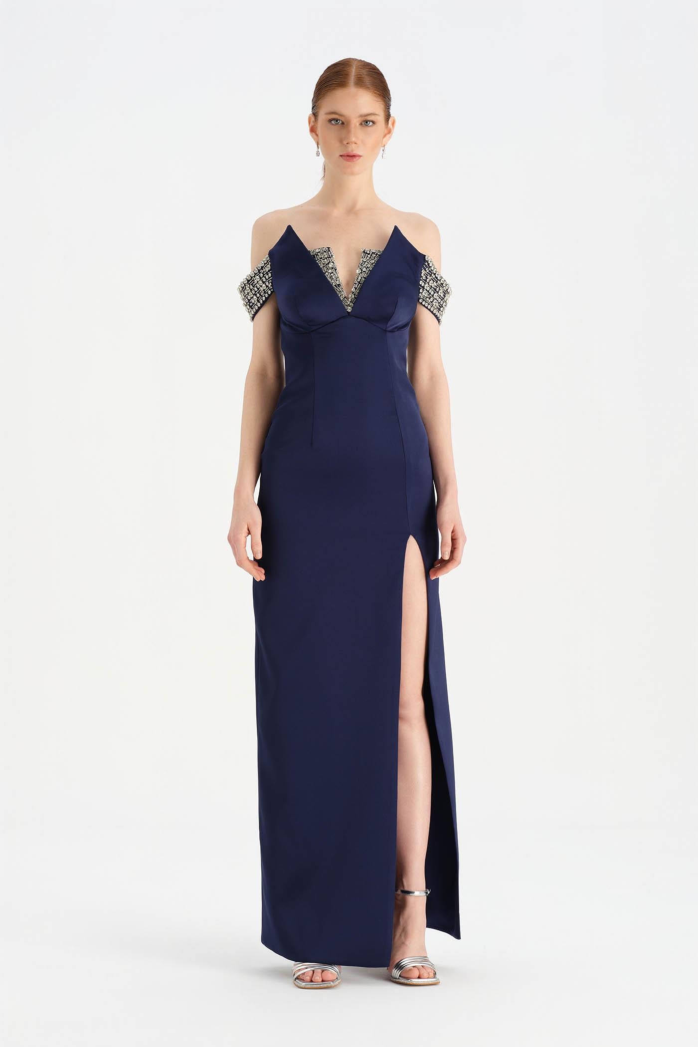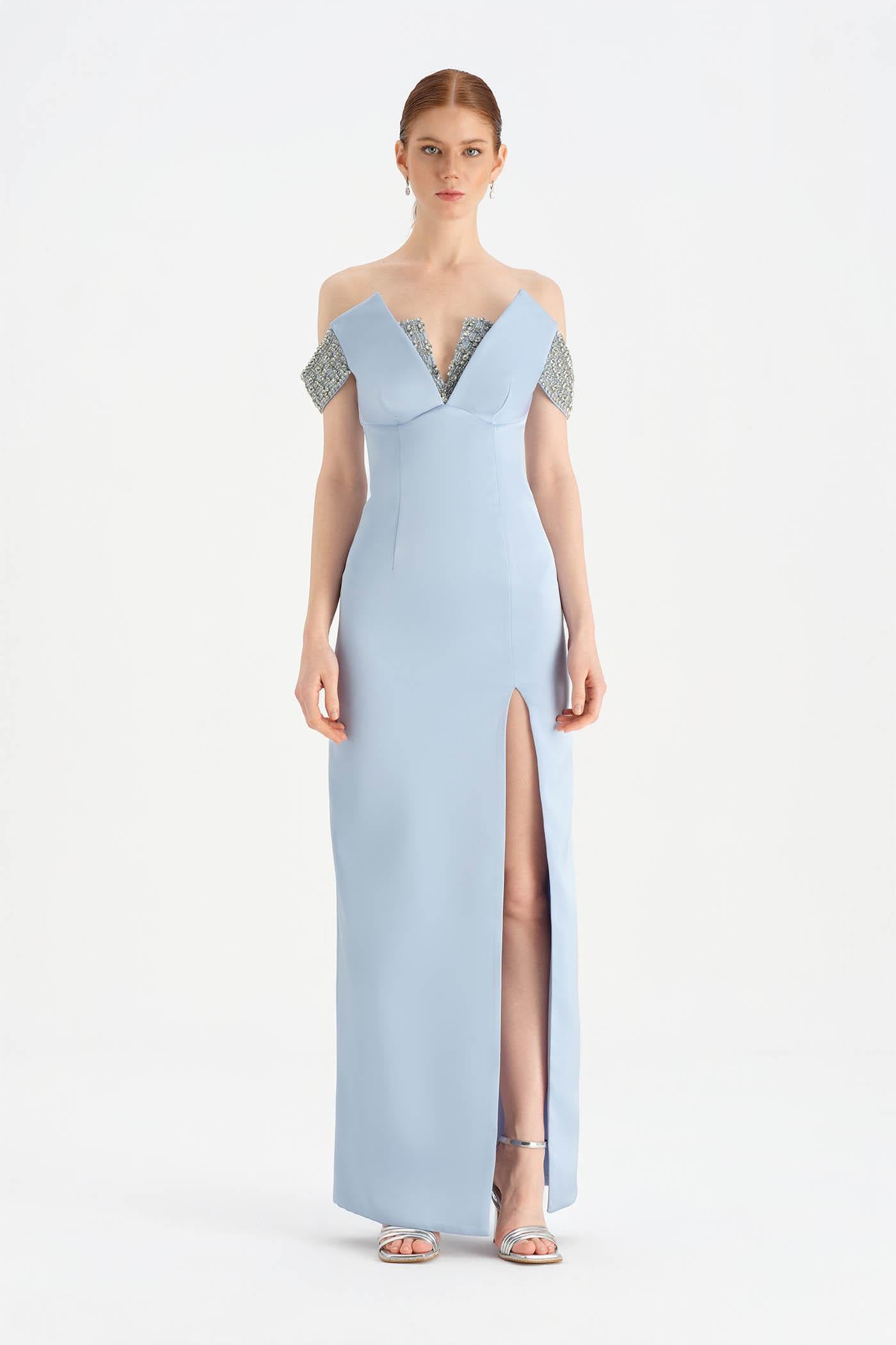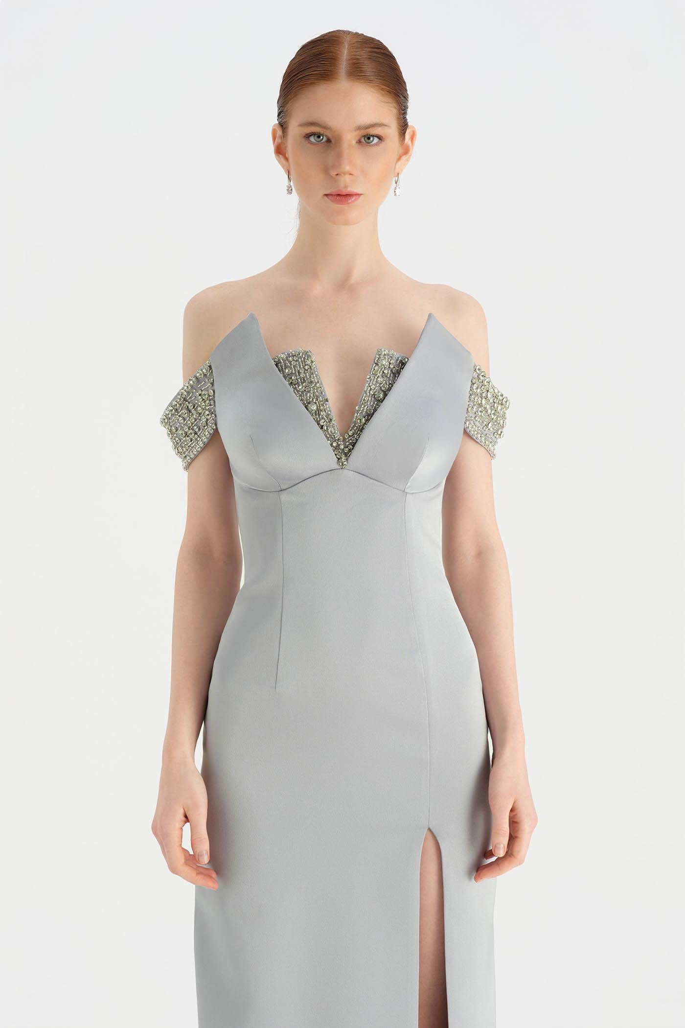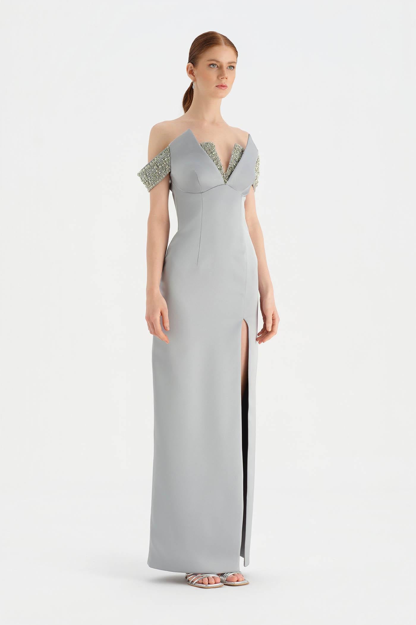Düşük Omuzlu Yırtmaçlı Taş İşlemeli Abiye Elbise - 26063C