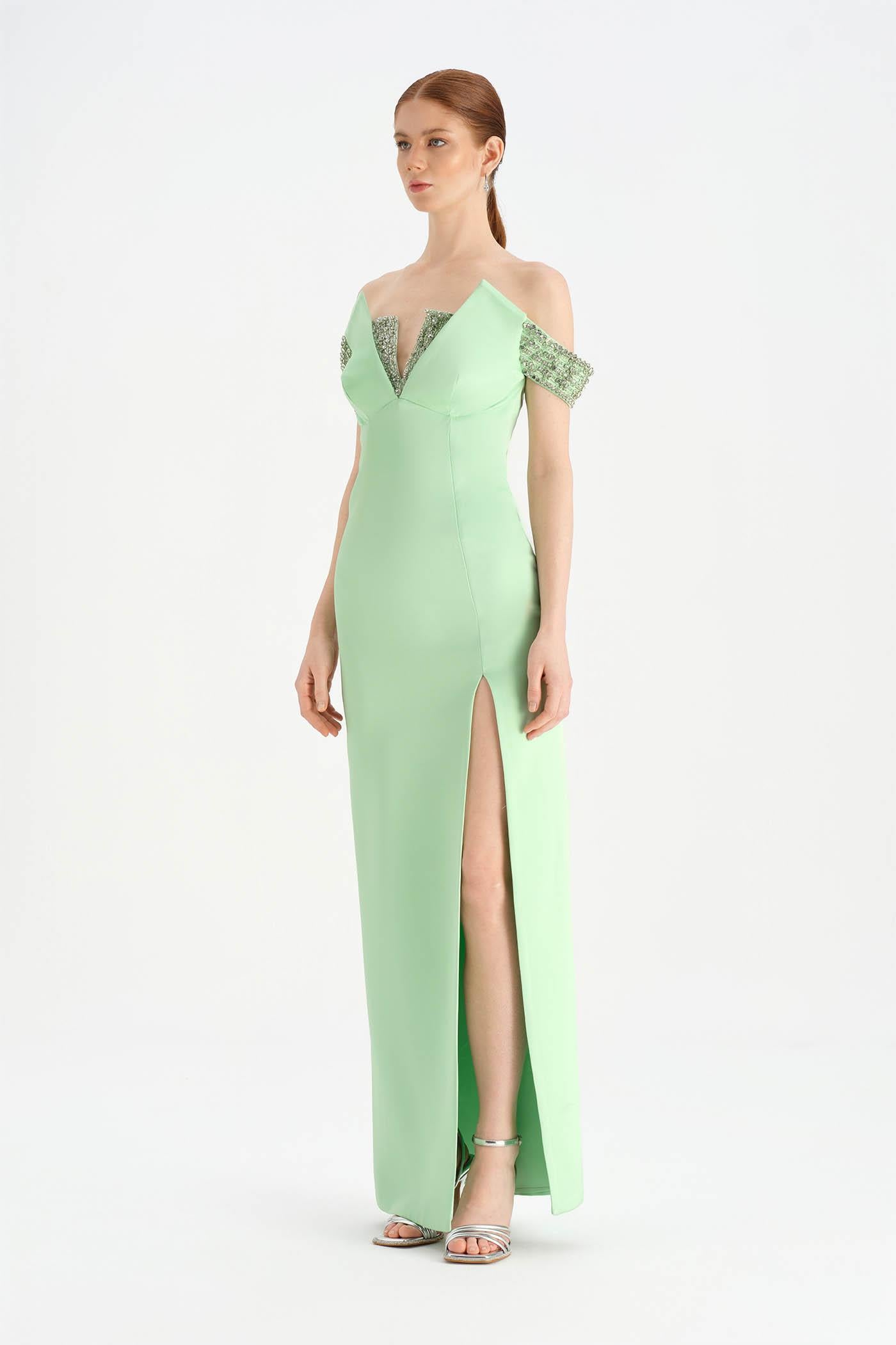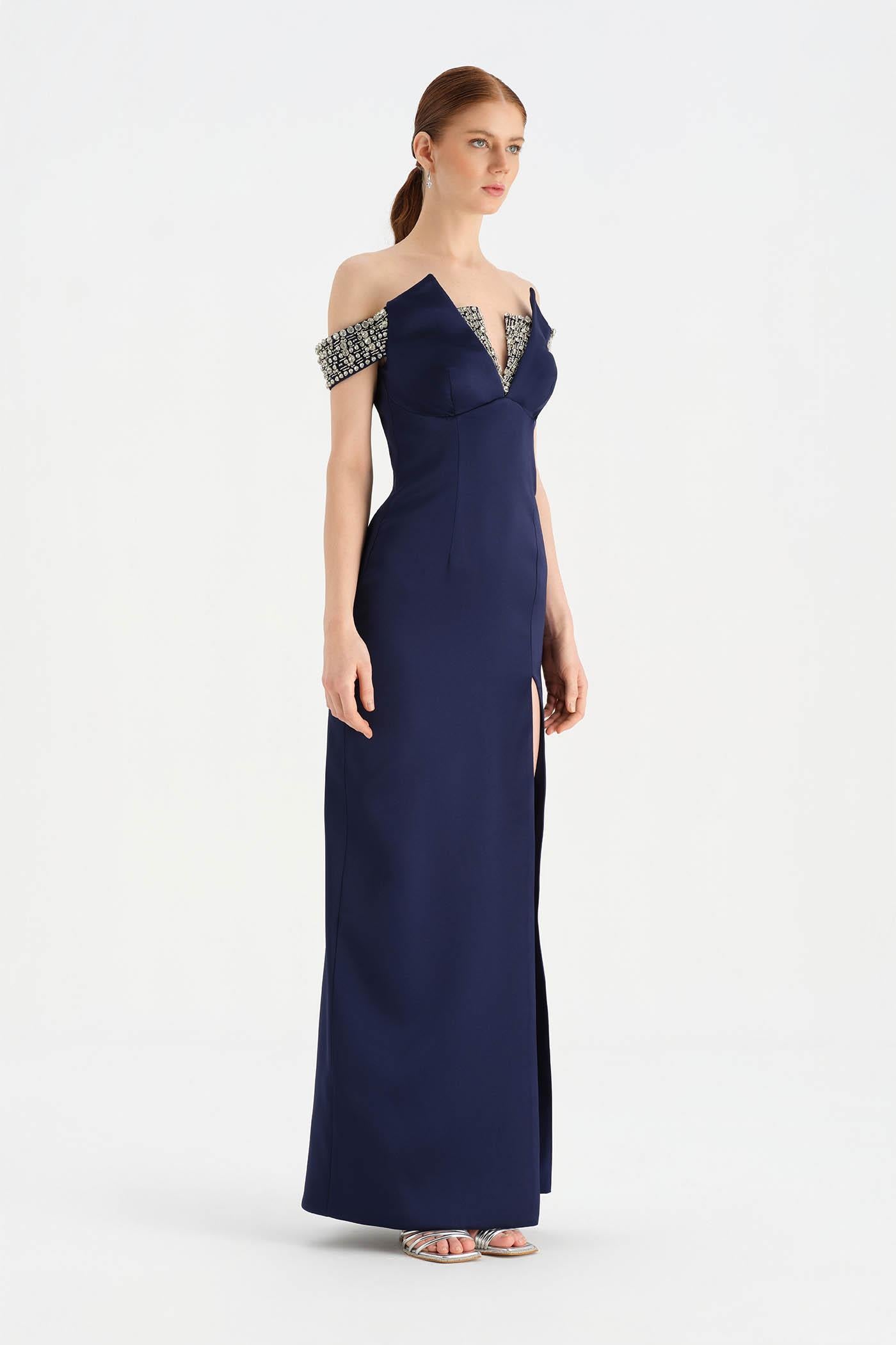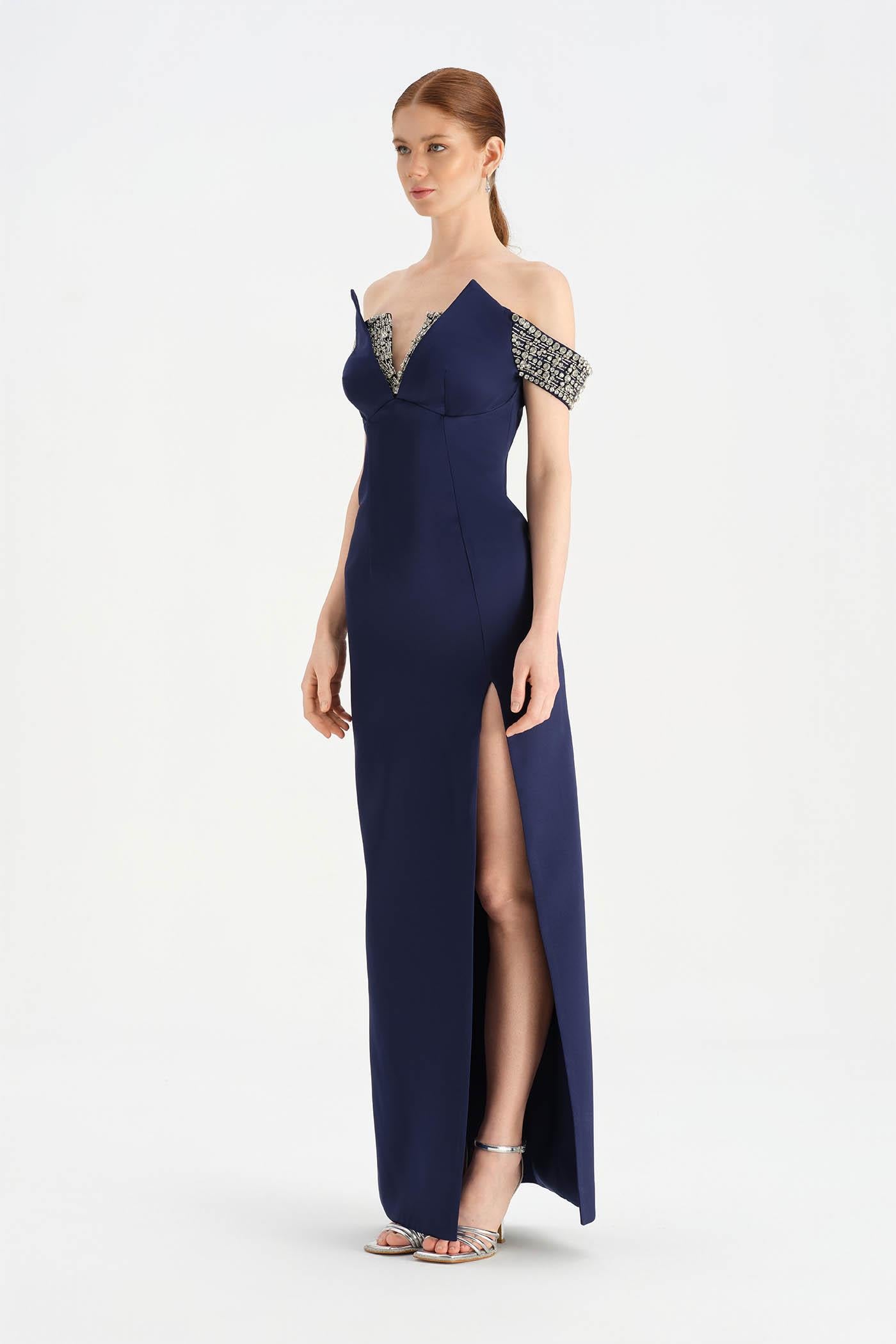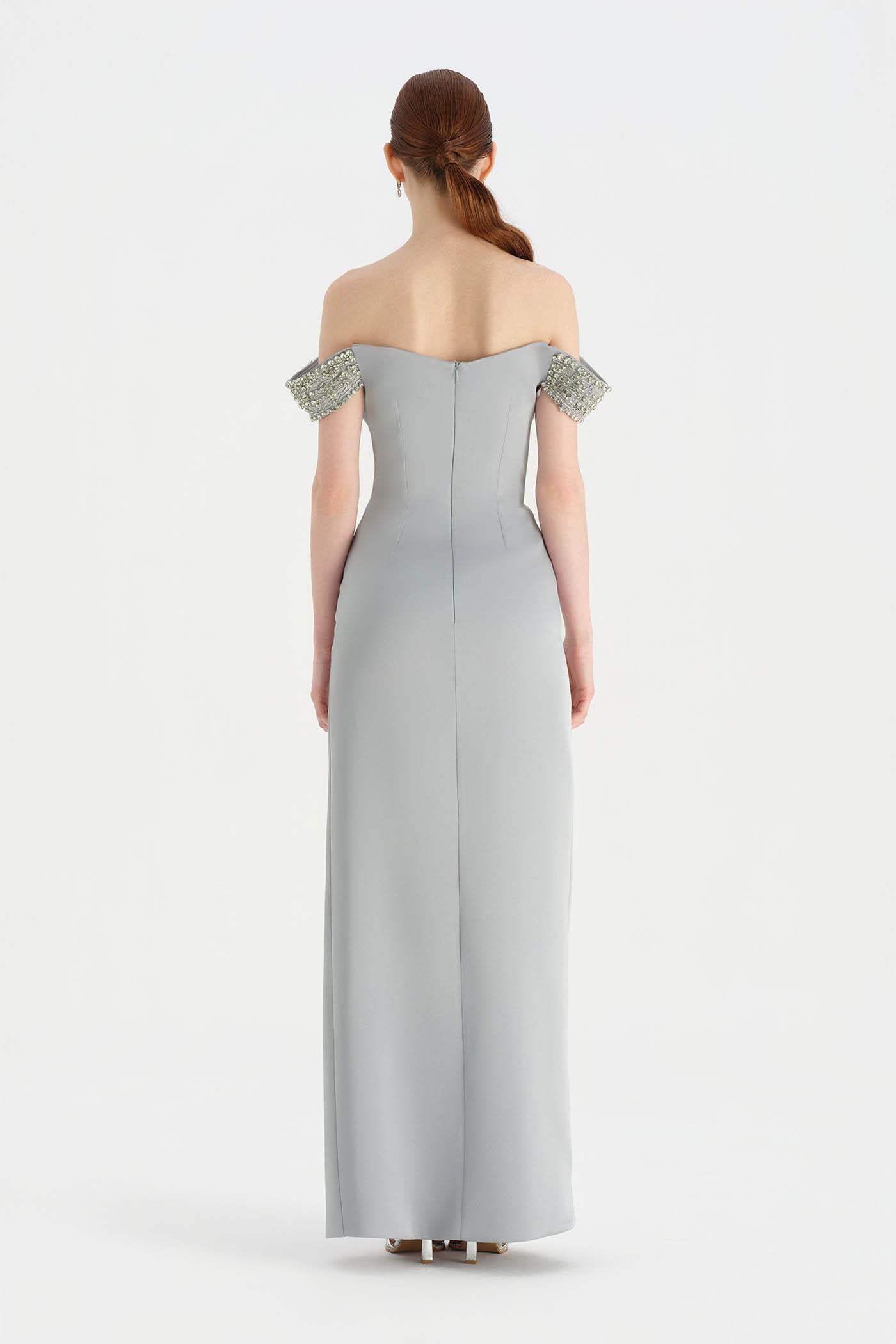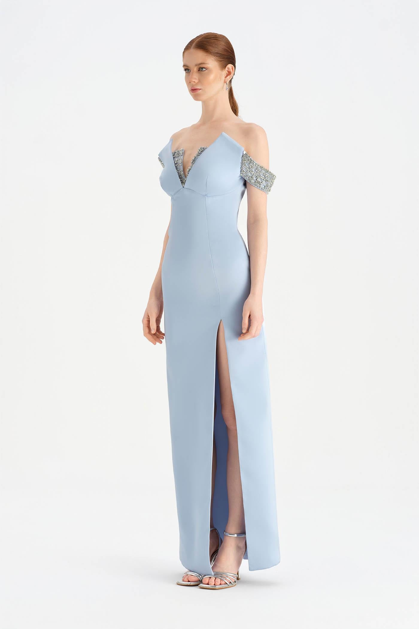 Düşük Omuzlu Yırtmaçlı Taş İşlemeli Abiye Elbise - 26063C