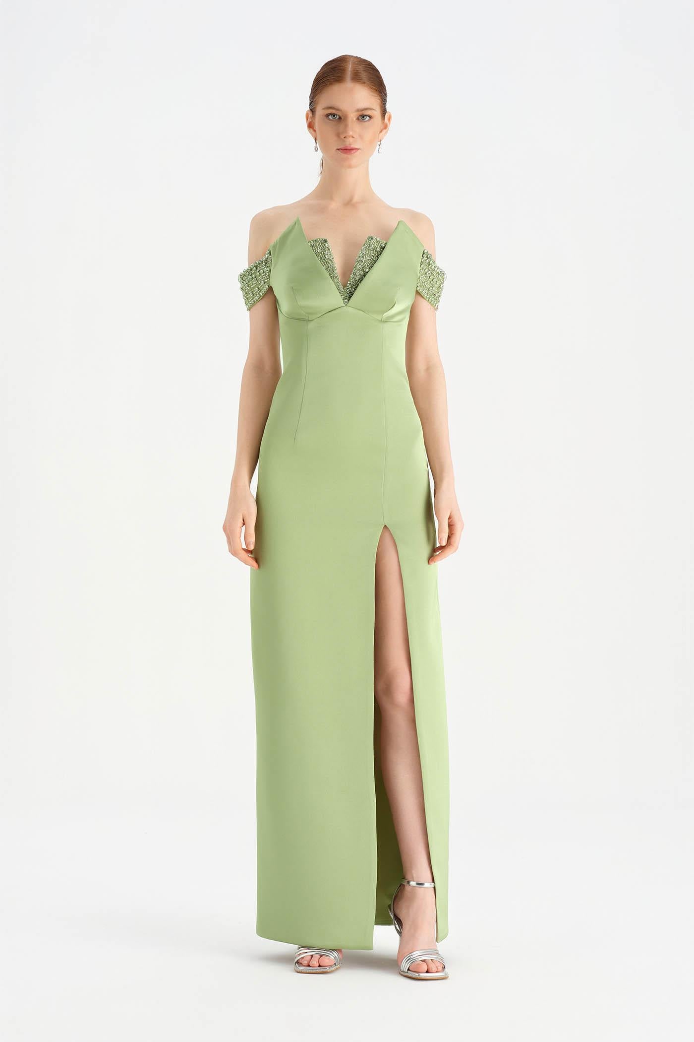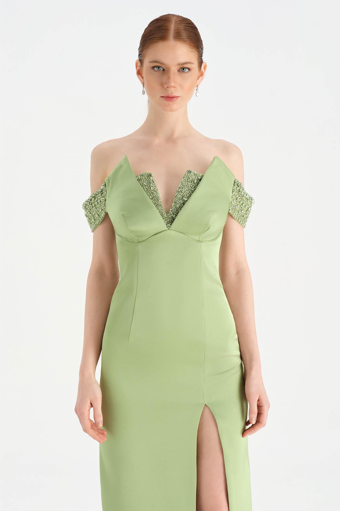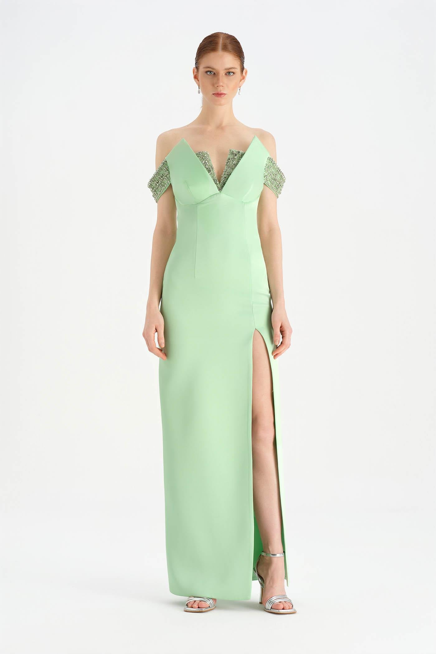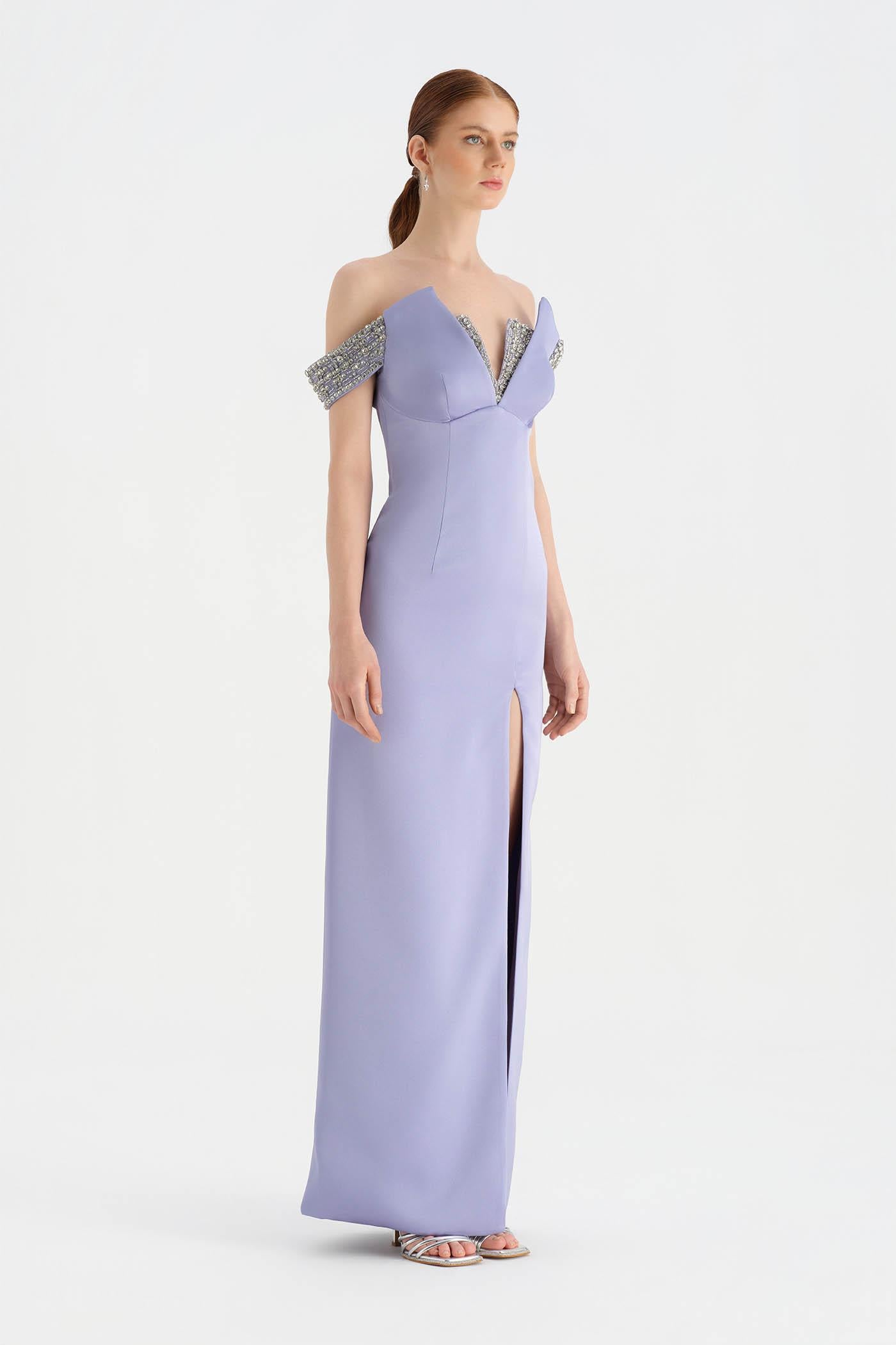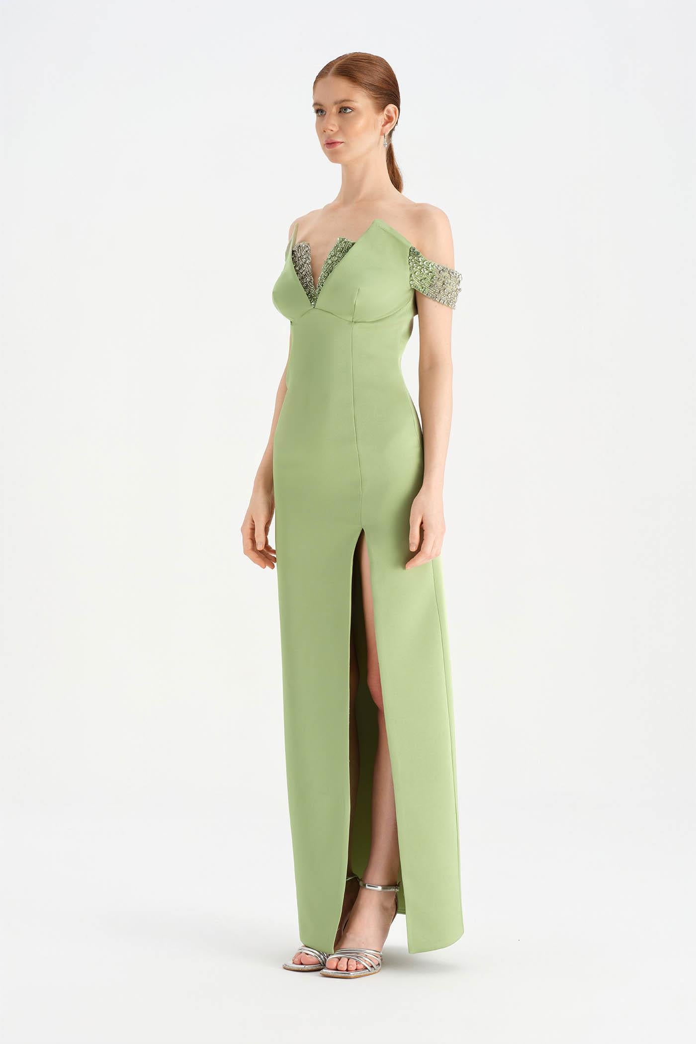 Düşük Omuzlu Yırtmaçlı Taş İşlemeli Abiye Elbise - 26063C