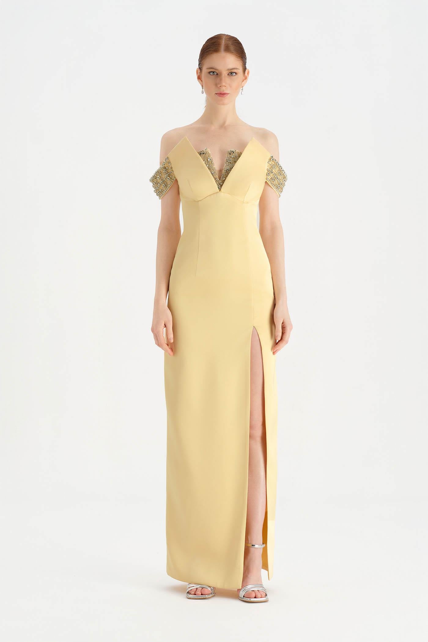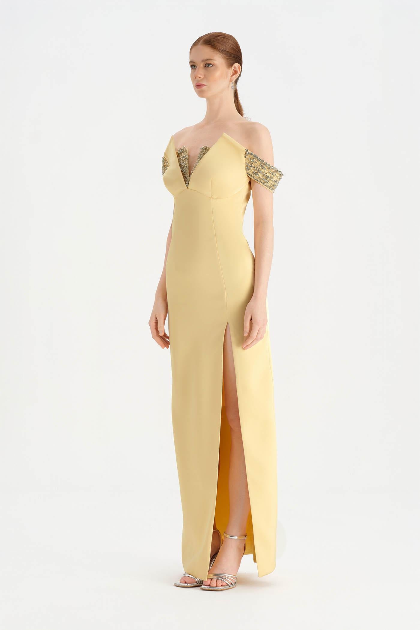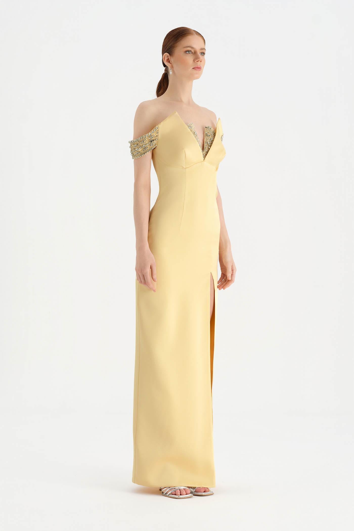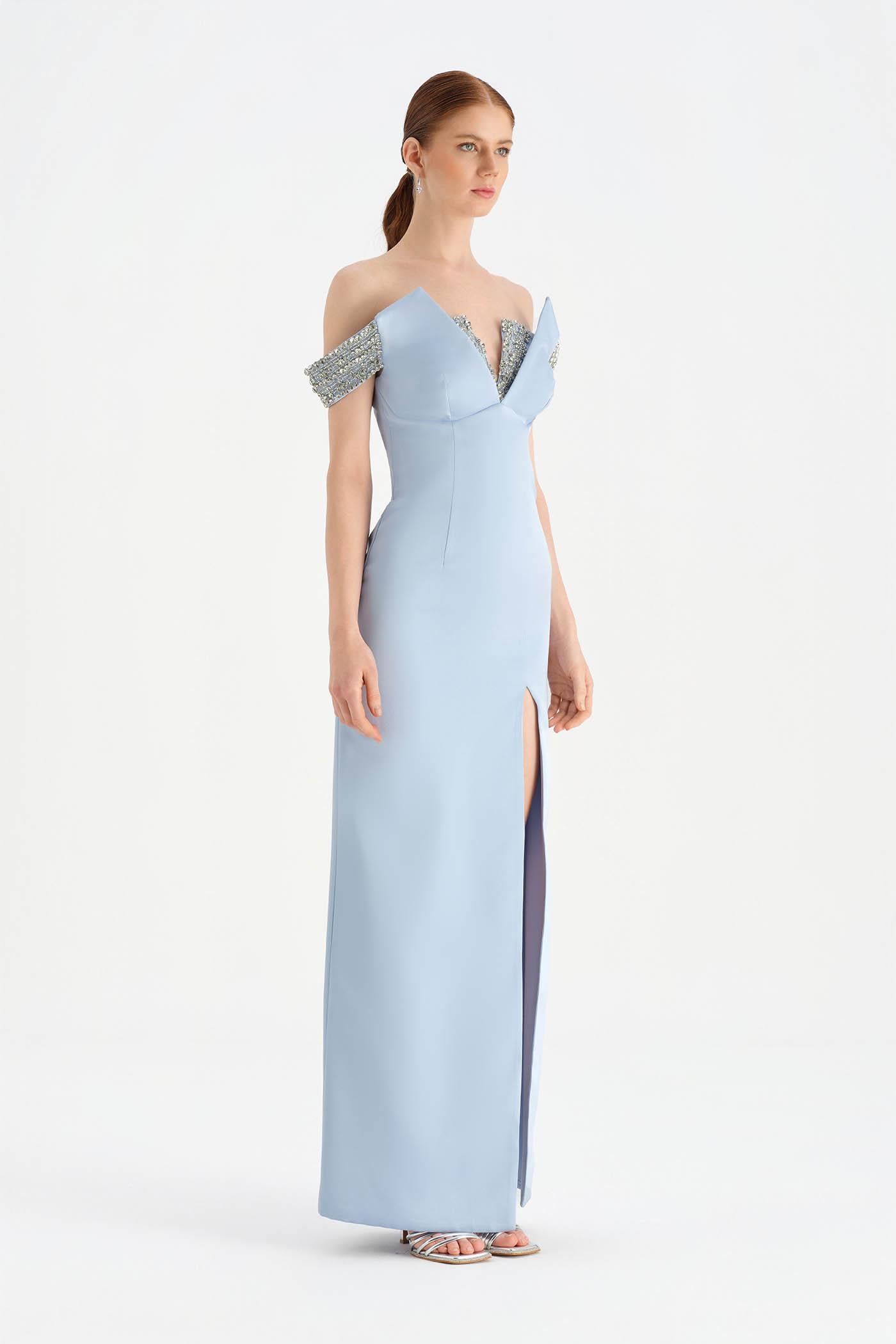 Düşük Omuzlu Yırtmaçlı Taş İşlemeli Abiye Elbise - 26063C