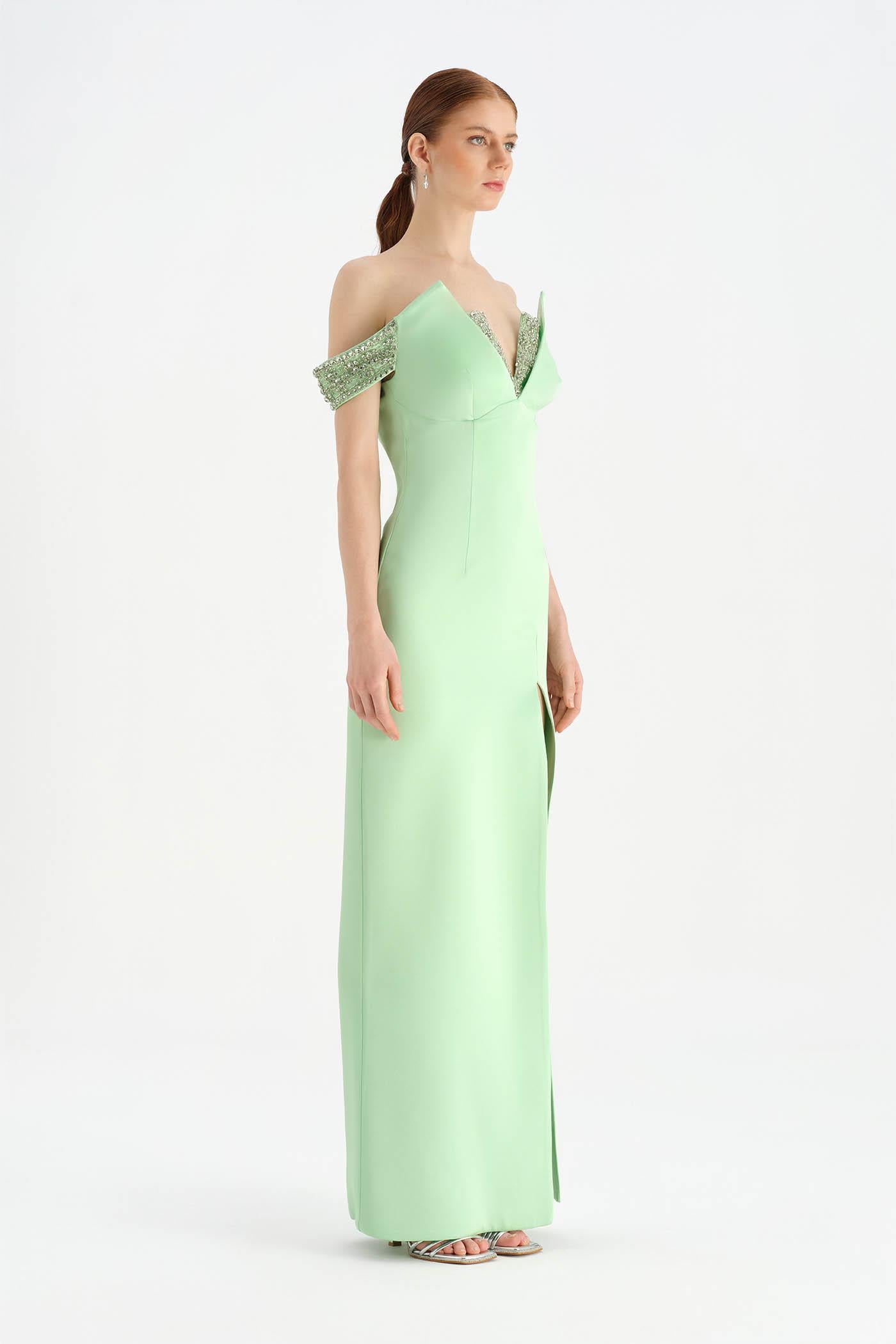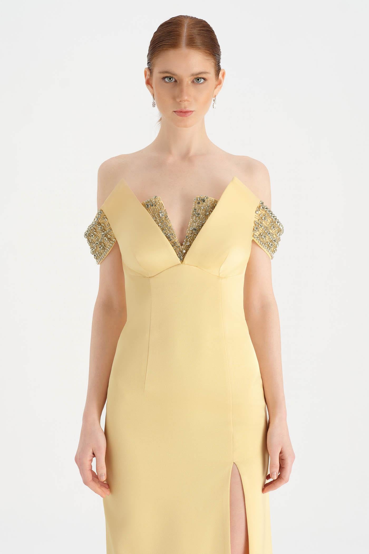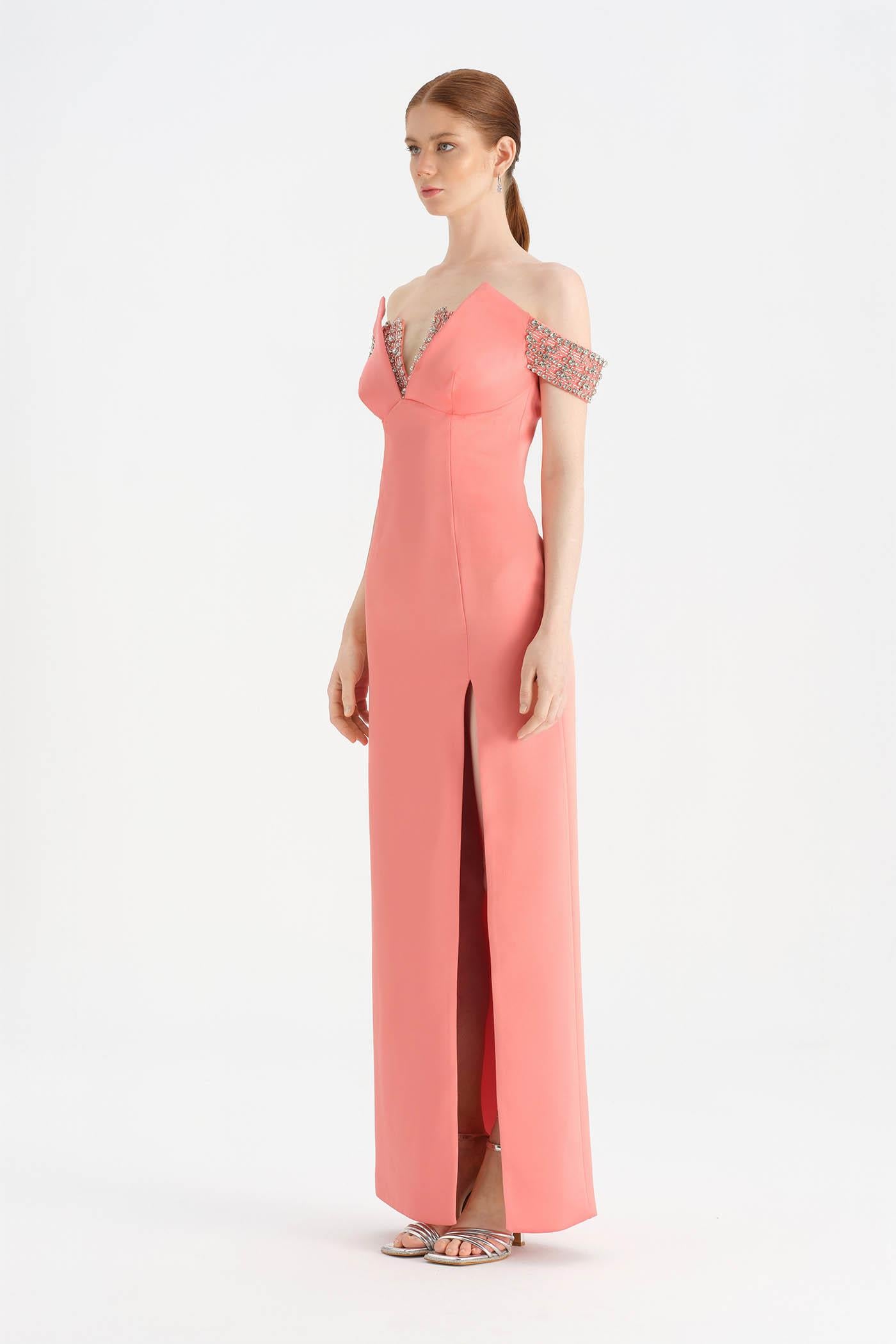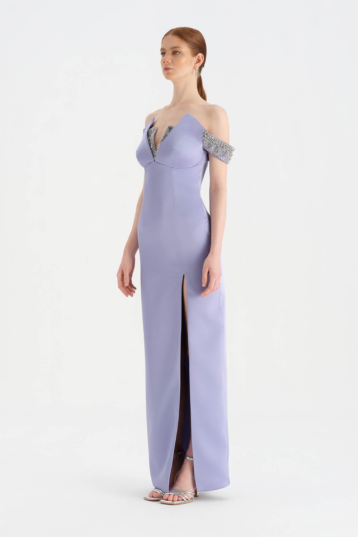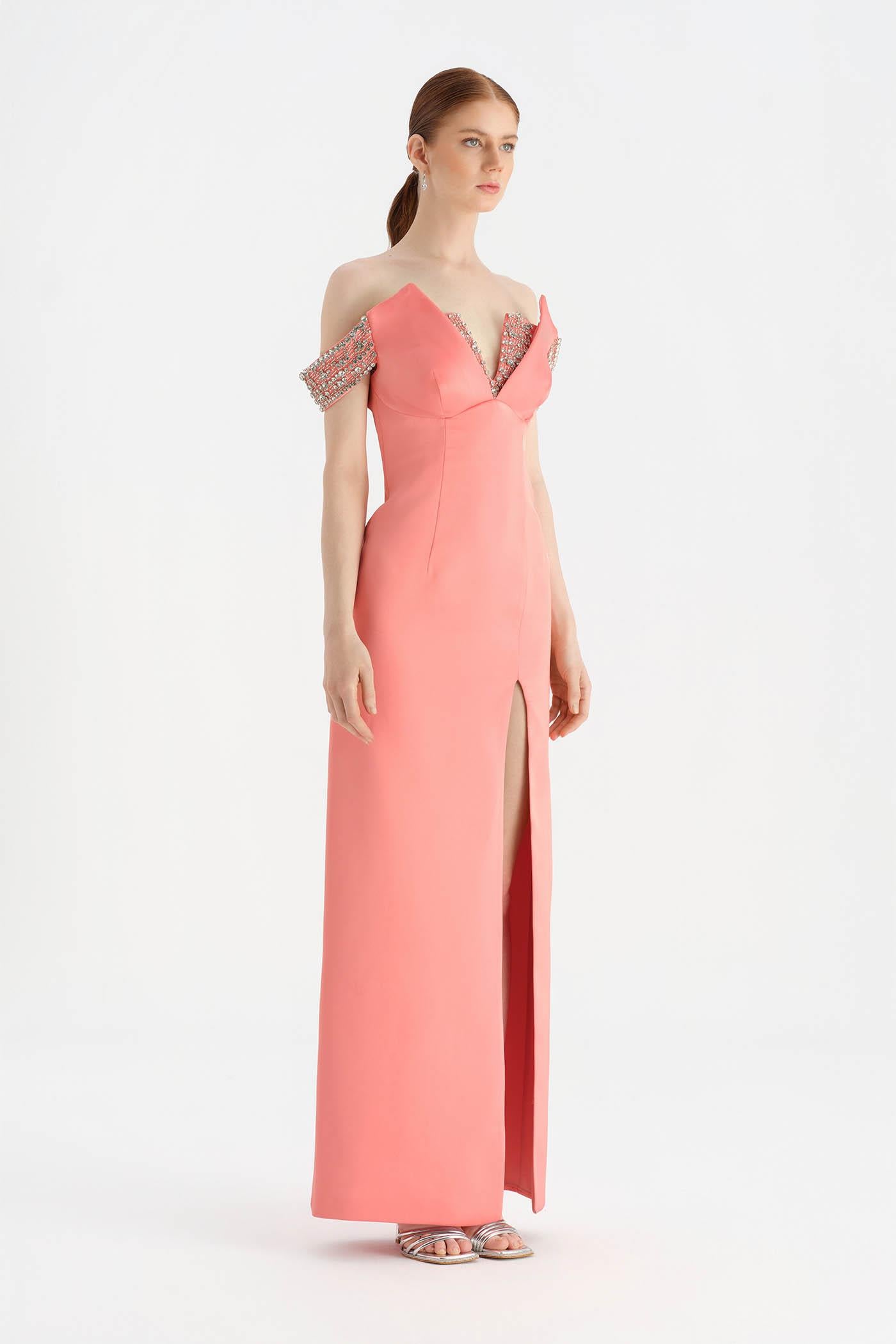 Düşük Omuzlu Yırtmaçlı Taş İşlemeli Abiye Elbise - 26063C