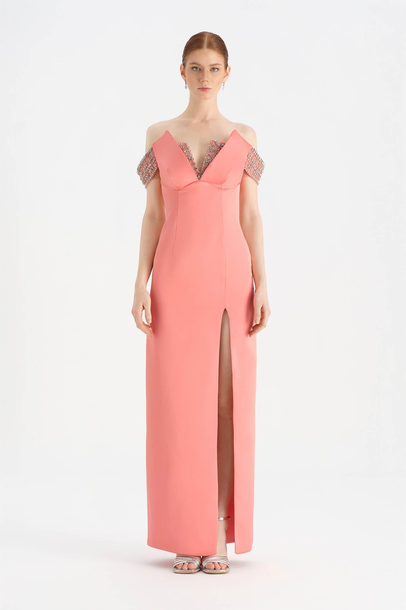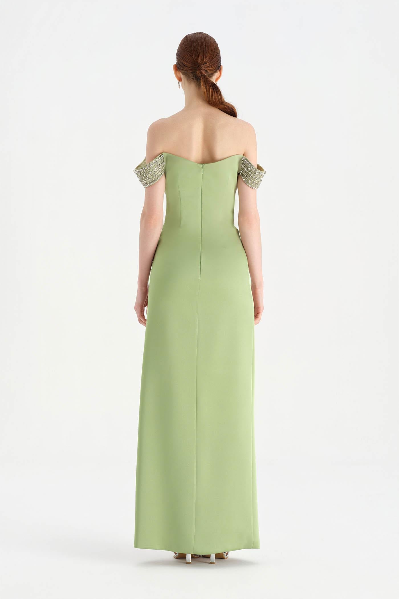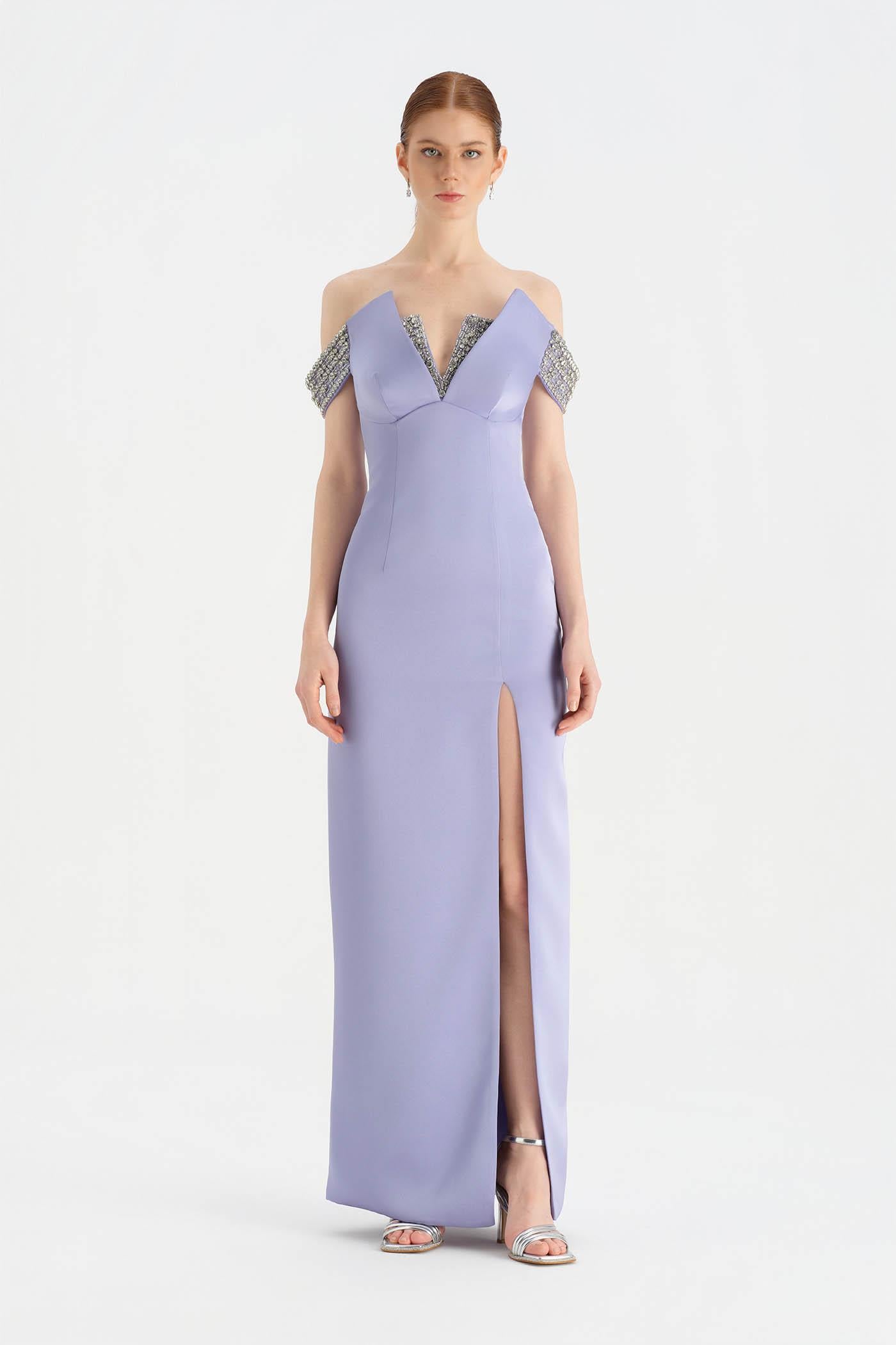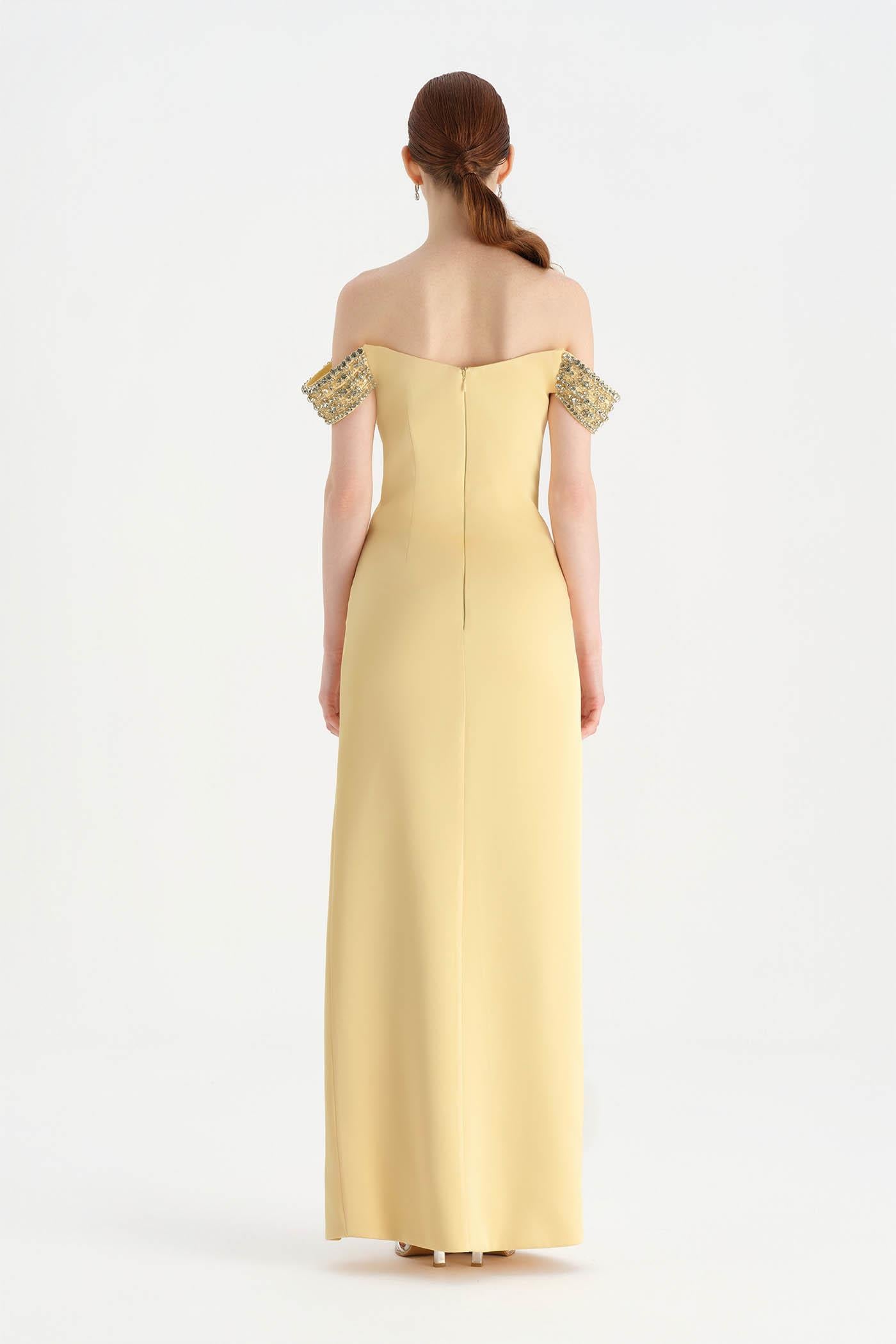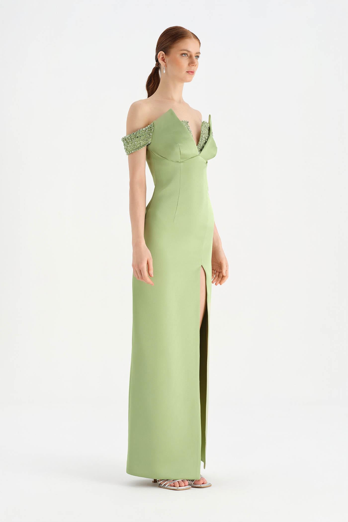 Düşük Omuzlu Yırtmaçlı Taş İşlemeli Abiye Elbise - 26063C