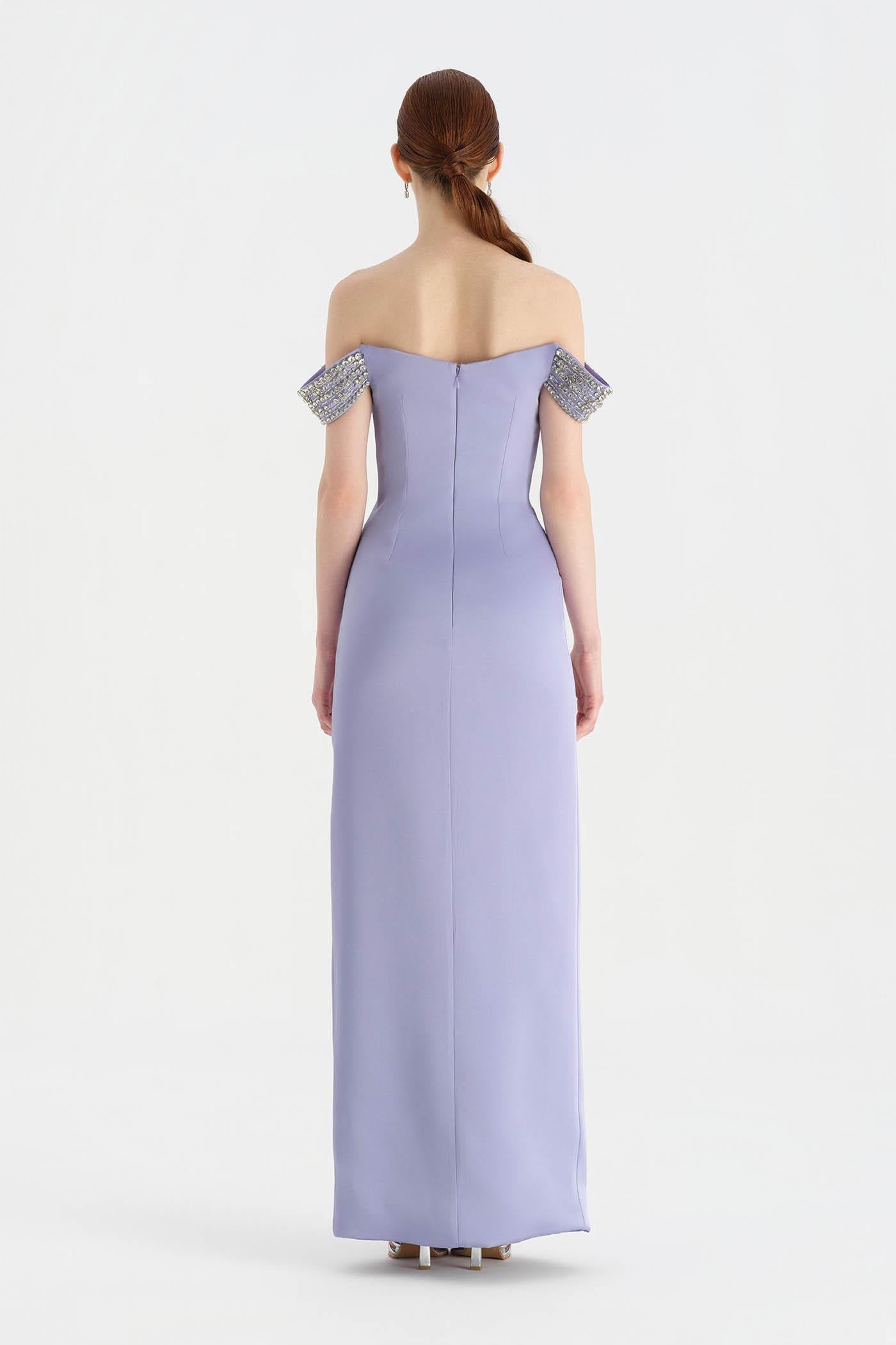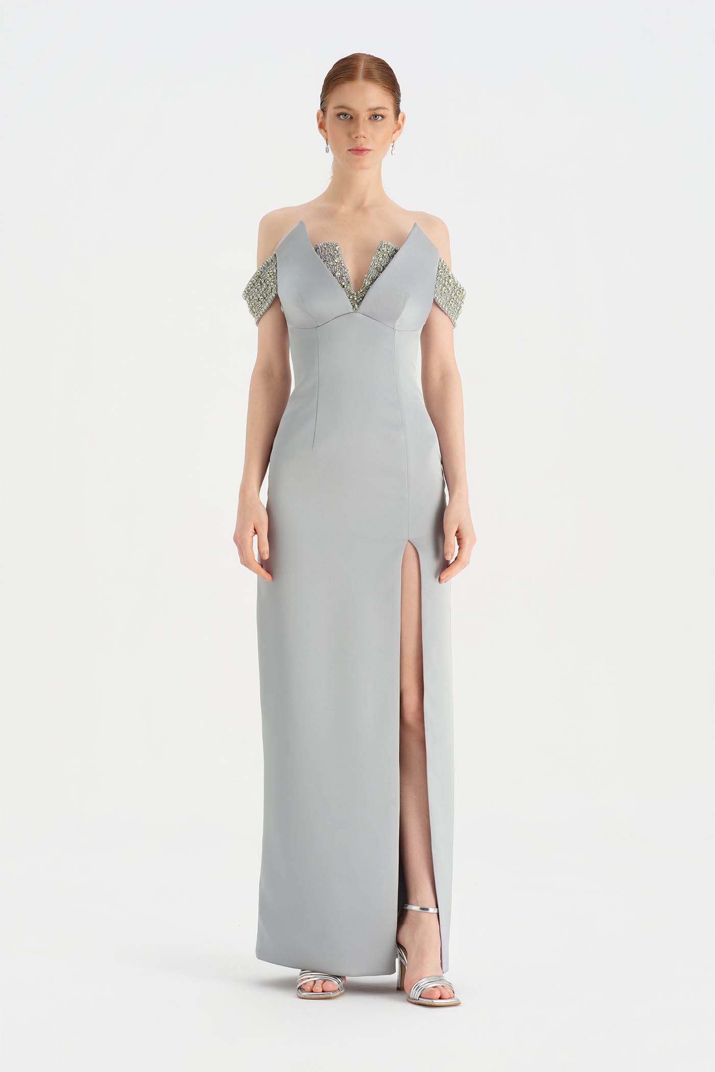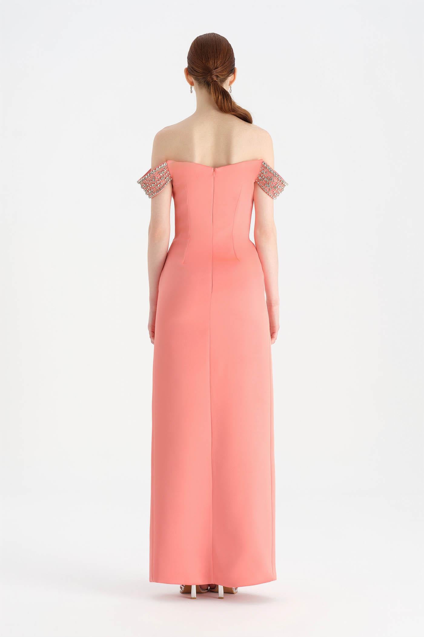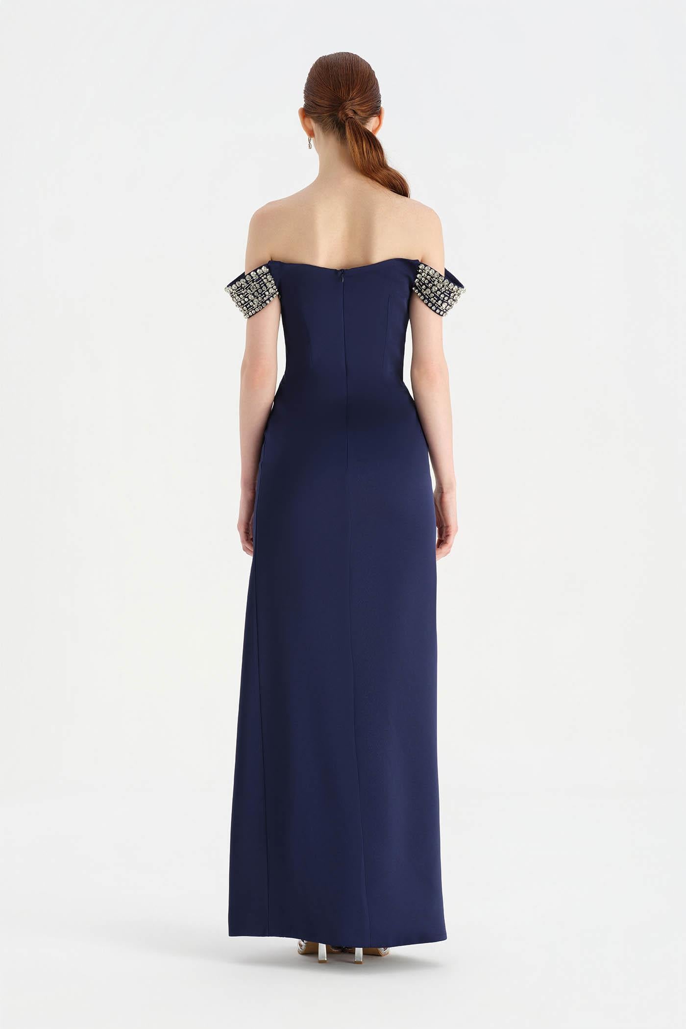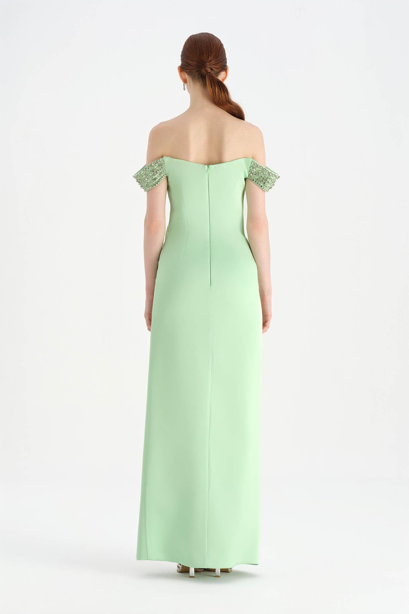 Düşük Omuzlu Yırtmaçlı Taş İşlemeli Abiye Elbise - 26063C
