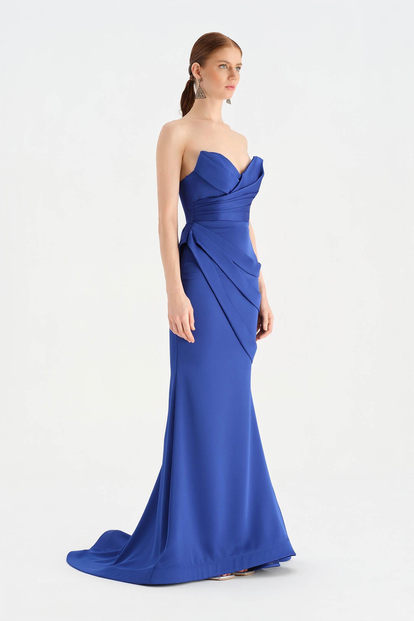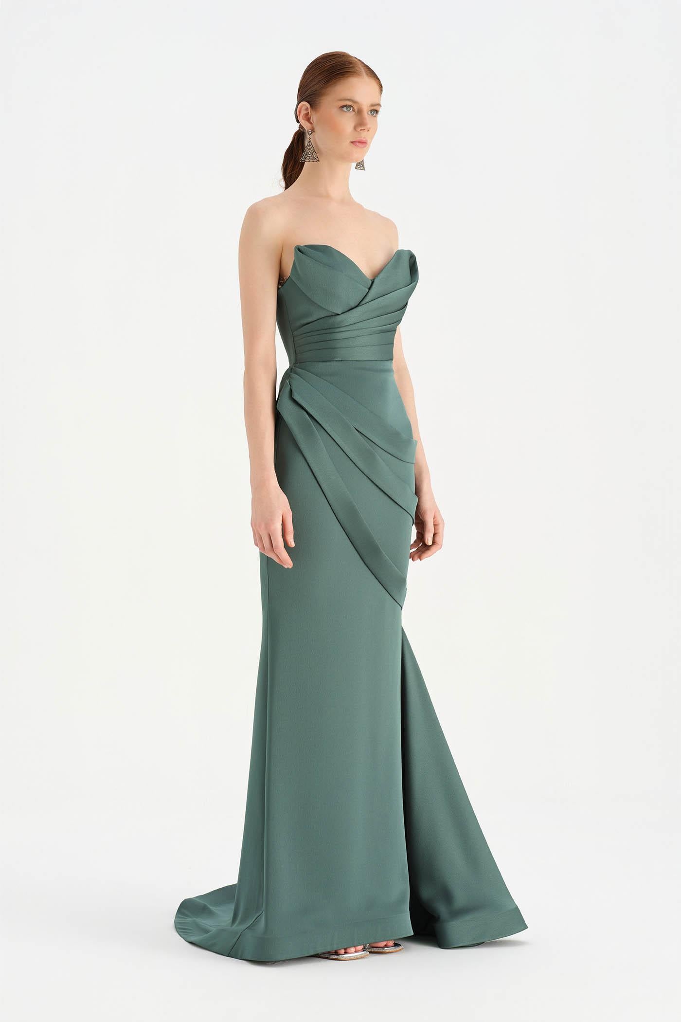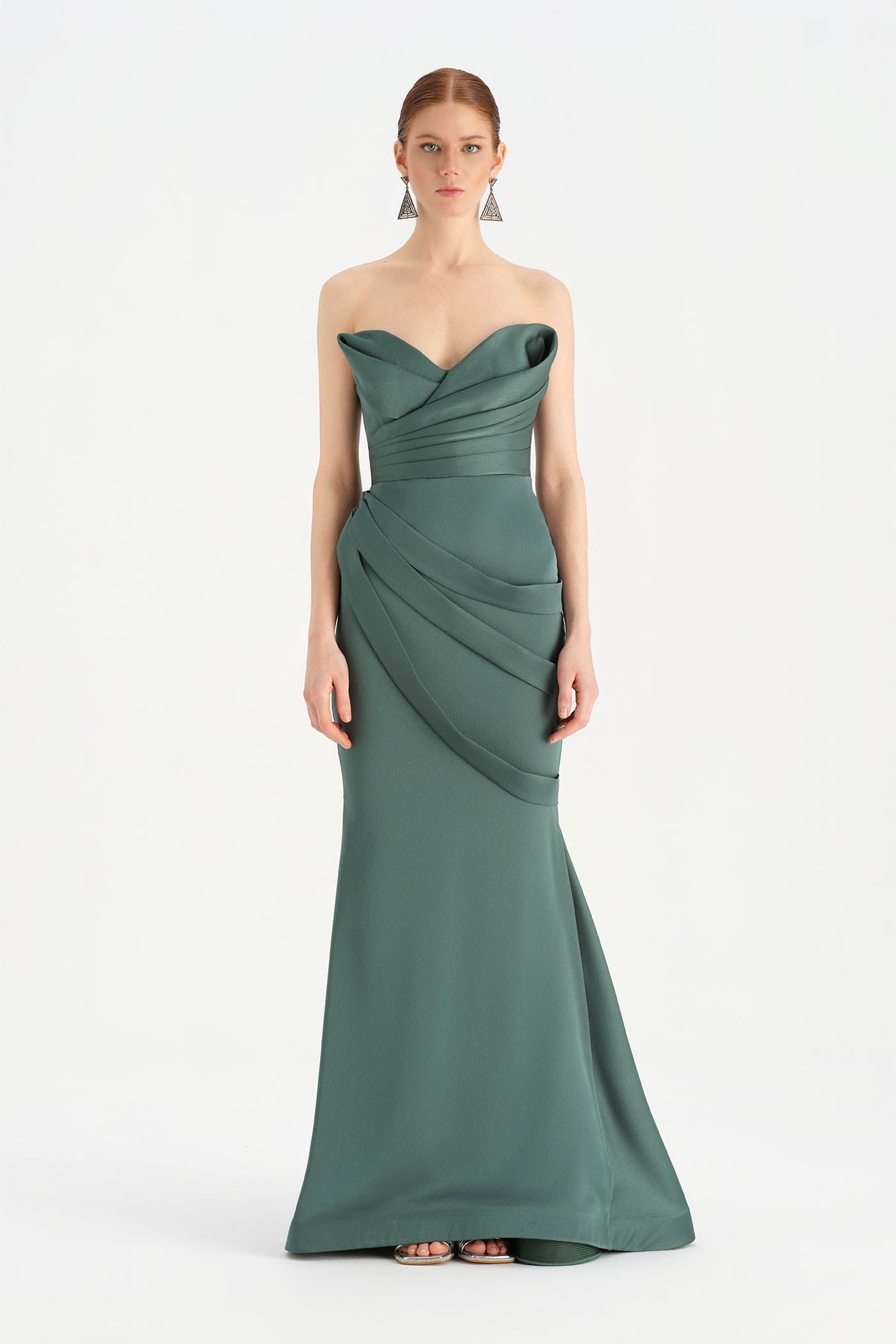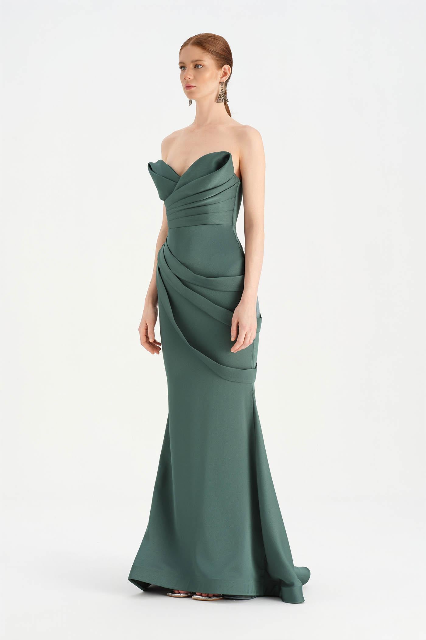 Bant Detaylı Drapeli Balık Abiye Elbise – 26021C , Zarif balık kesimi ve modern drape detaylarıyla tasarlanan bu abiye elbise, feminen ve güçlü bir siluet sunar. Straplez yaka formu üst bedeni zarif bir şekilde vurgularken, bel çevresindeki bant ve drape detayları tasarıma hareket kazandırır. Vücuda uyum sağlayan formu ve etek kısmındaki akıcı yapı sayesinde yürüyüşe zarafet katan bu model, özel davetler ve seçkin organizasyonlar için etkileyici bir gece elbisesi olarak öne çıkar.