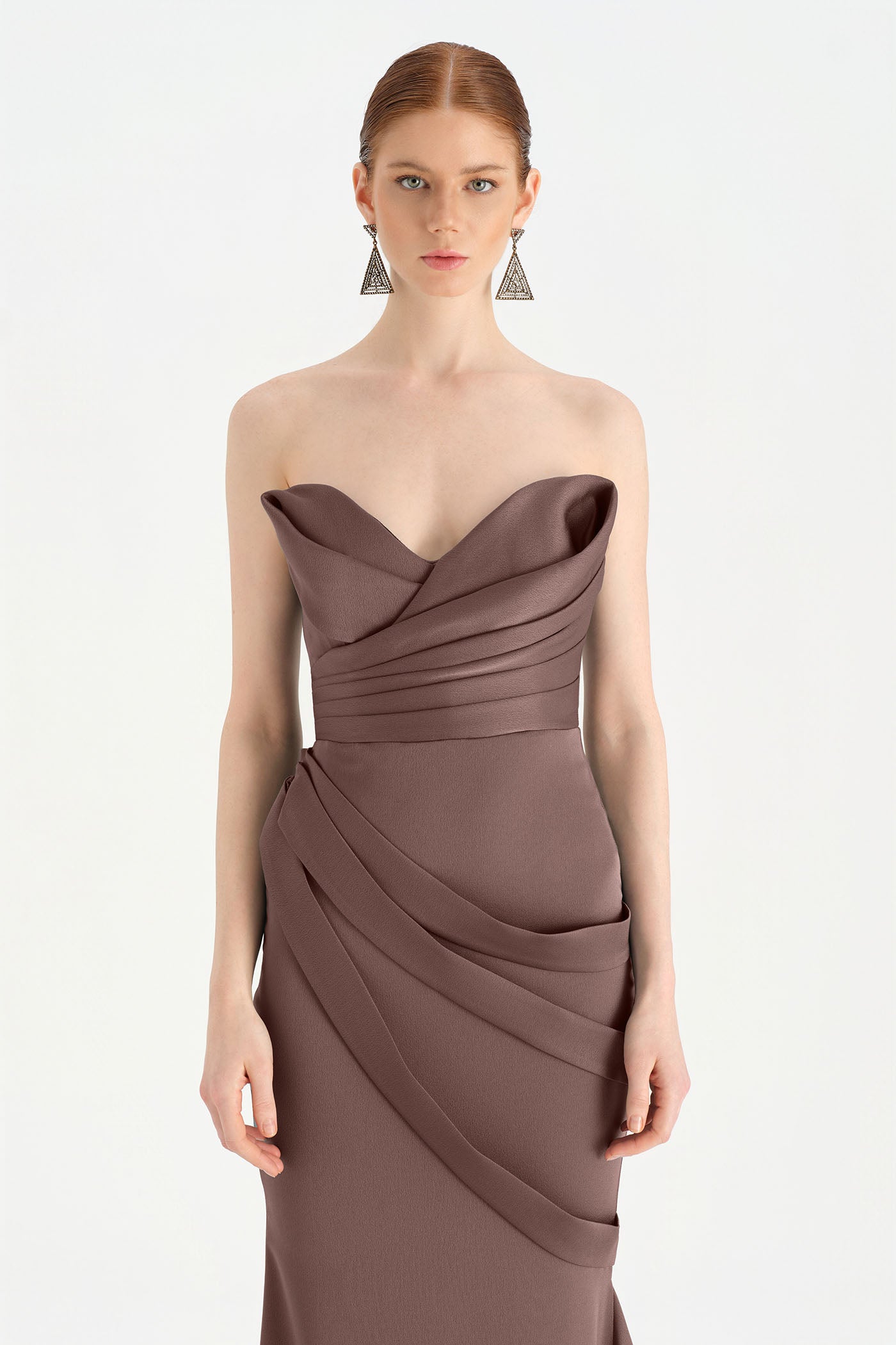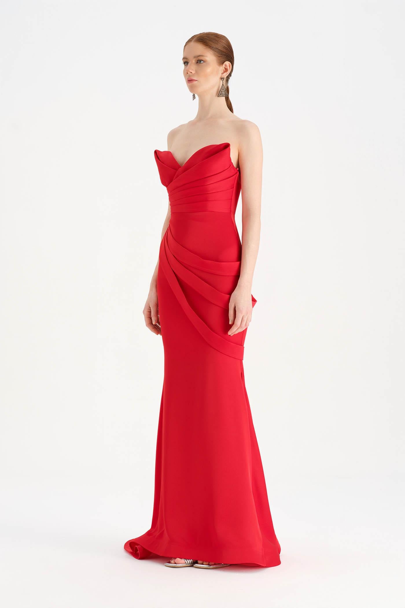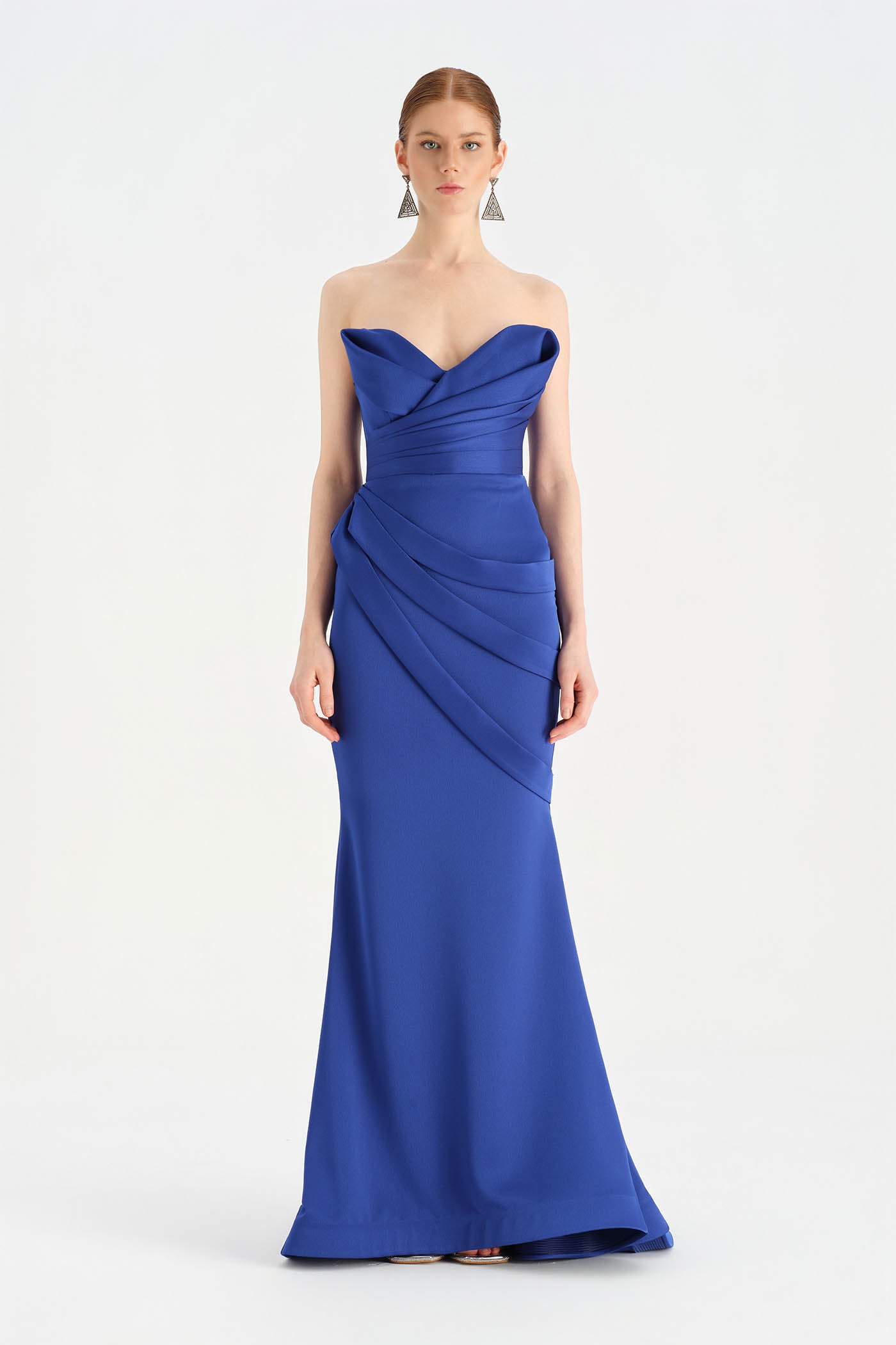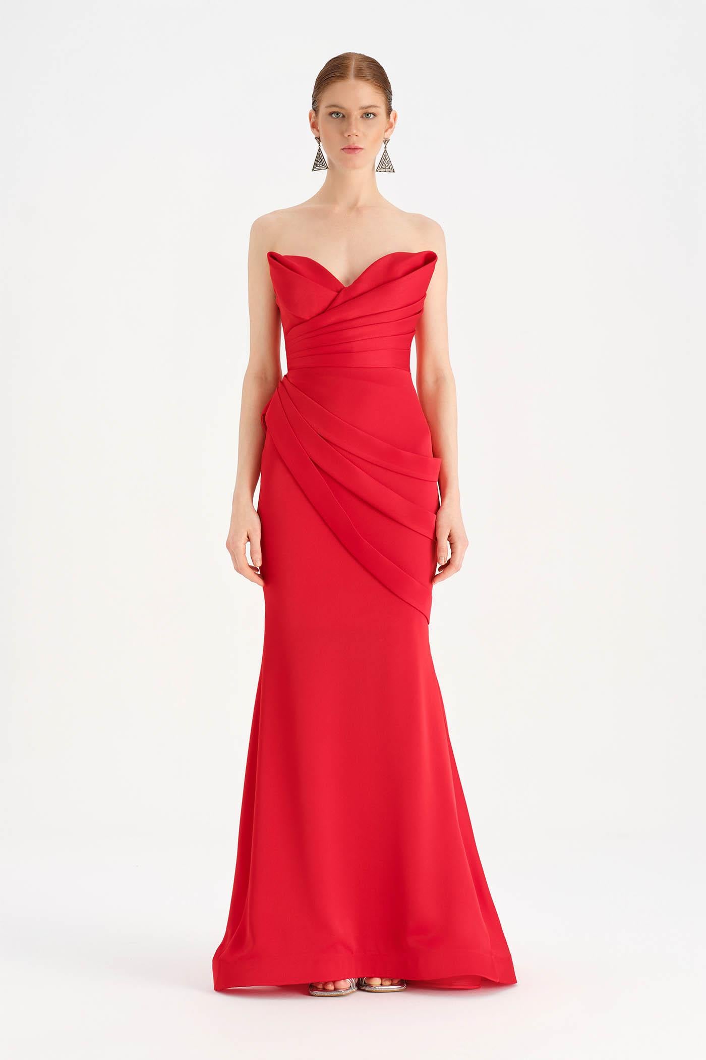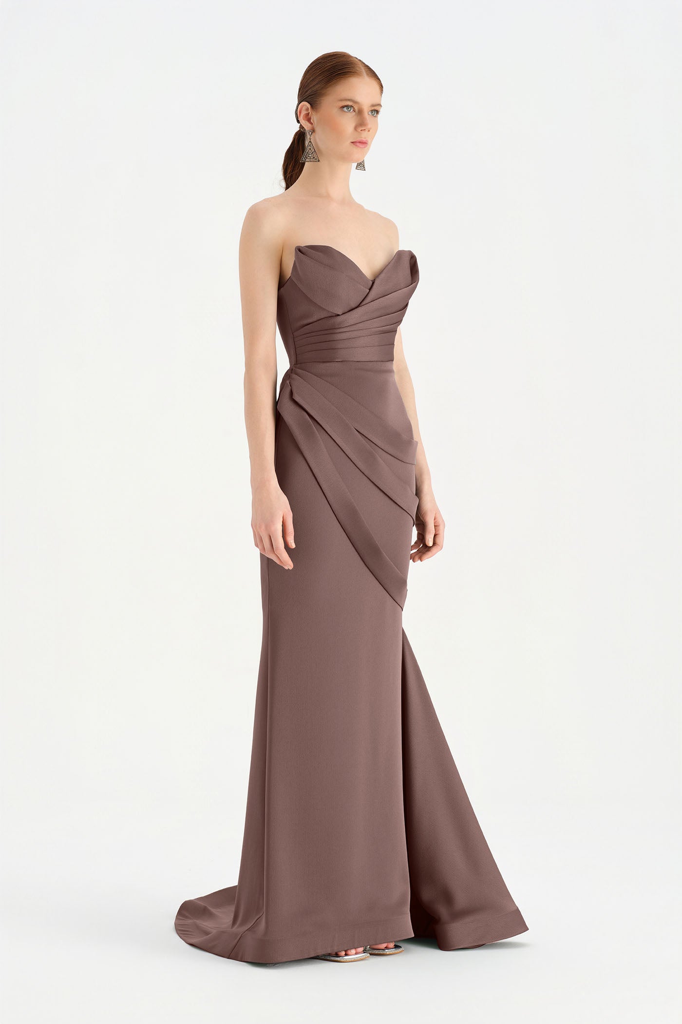 Bant Detaylı Drapeli Balık Abiye Elbise – 26021C , Zarif balık kesimi ve modern drape detaylarıyla tasarlanan bu abiye elbise, feminen ve güçlü bir siluet sunar. Straplez yaka formu üst bedeni zarif bir şekilde vurgularken, bel çevresindeki bant ve drape detayları tasarıma hareket kazandırır. Vücuda uyum sağlayan formu ve etek kısmındaki akıcı yapı sayesinde yürüyüşe zarafet katan bu model, özel davetler ve seçkin organizasyonlar için etkileyici bir gece elbisesi olarak öne çıkar.