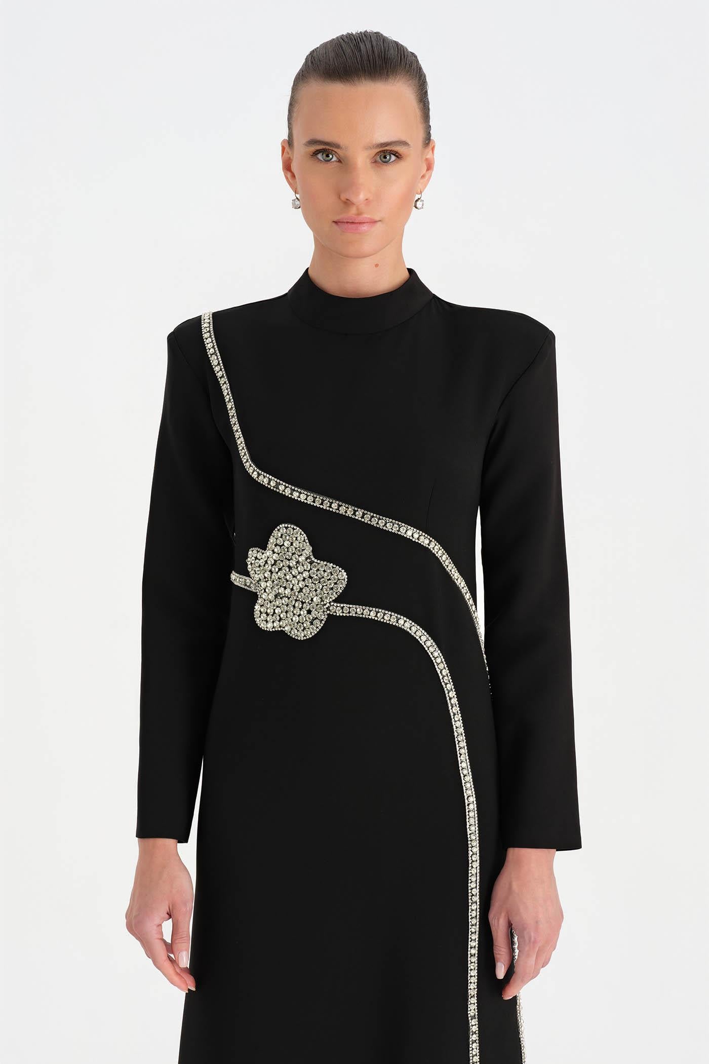 Taş İşlemeli Tesettür Abiye Elbise – 26186C , Zarif ve sade tasarımıyla öne çıkan bu tesettür abiye elbise, modern çizgileri ince taş işlemeleriyle tamamlar. Gövde boyunca uzanan taş detayları ve merkezde yer alan işlemeli motif tasarıma sofistike bir karakter kazandırır. Uzun kollu ve akıcı formu sayesinde dengeli ve zarif bir siluet sunan bu model, özel davetler ve şık organizasyonlar için şıklığı ve sadeliği bir arada sunar.