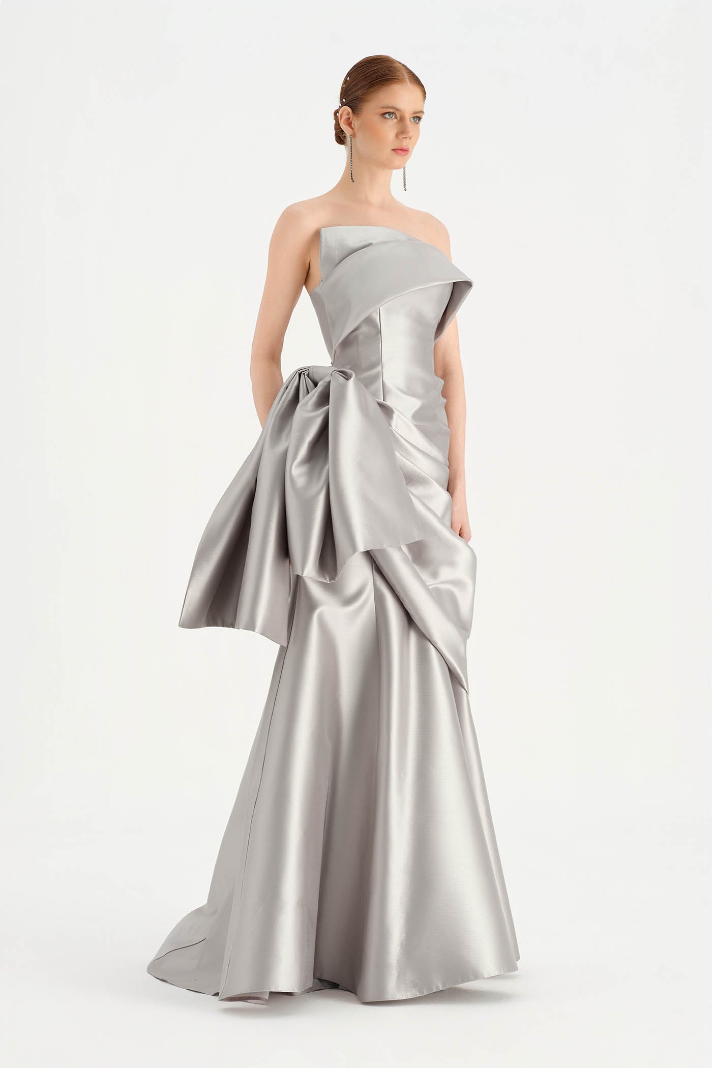Beli Fiyonk Detaylı Drapeli Straplez Abiye Elbise – 26085C , Zarif ve heykelsi tasarımıyla öne çıkan bu abiye elbise, straplez kesimi ve akıcı drape detaylarıyla sofistike bir siluet sunar. Bel kısmında yer alan büyük fiyonk detayı tasarıma güçlü ve dikkat çekici bir karakter kazandırırken, vücuda uyum sağlayan formu zarif bir duruş oluşturur. Uzun ve akıcı etek yapısıyla özel davetler ve gece organizasyonları için etkileyici bir stil sunar.