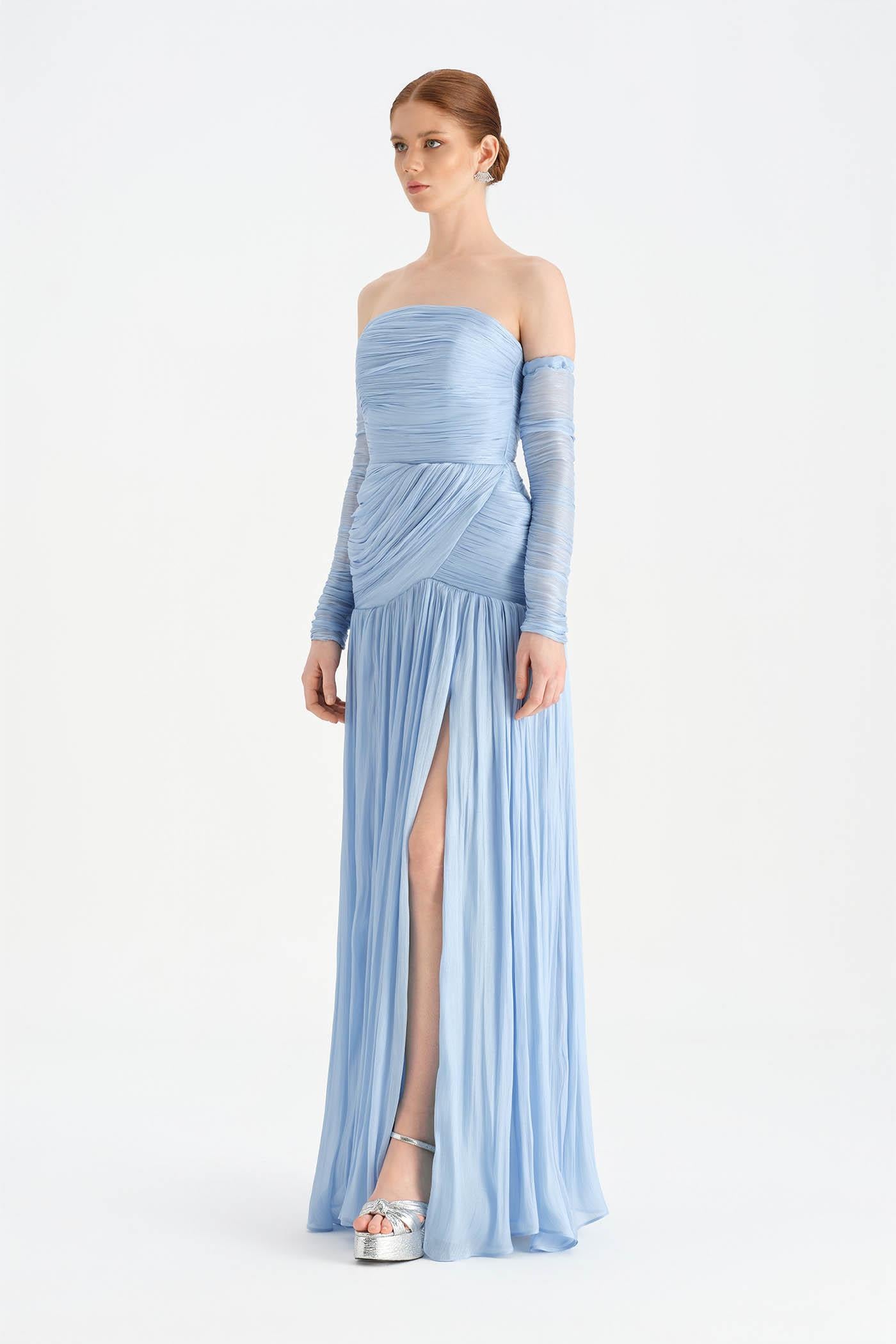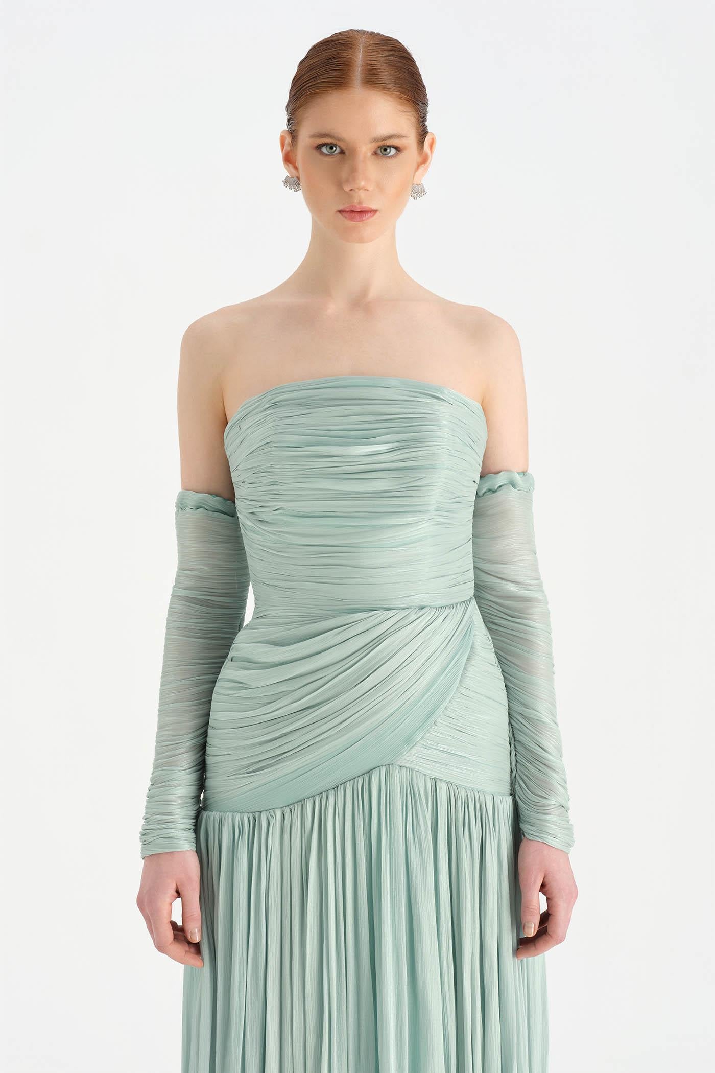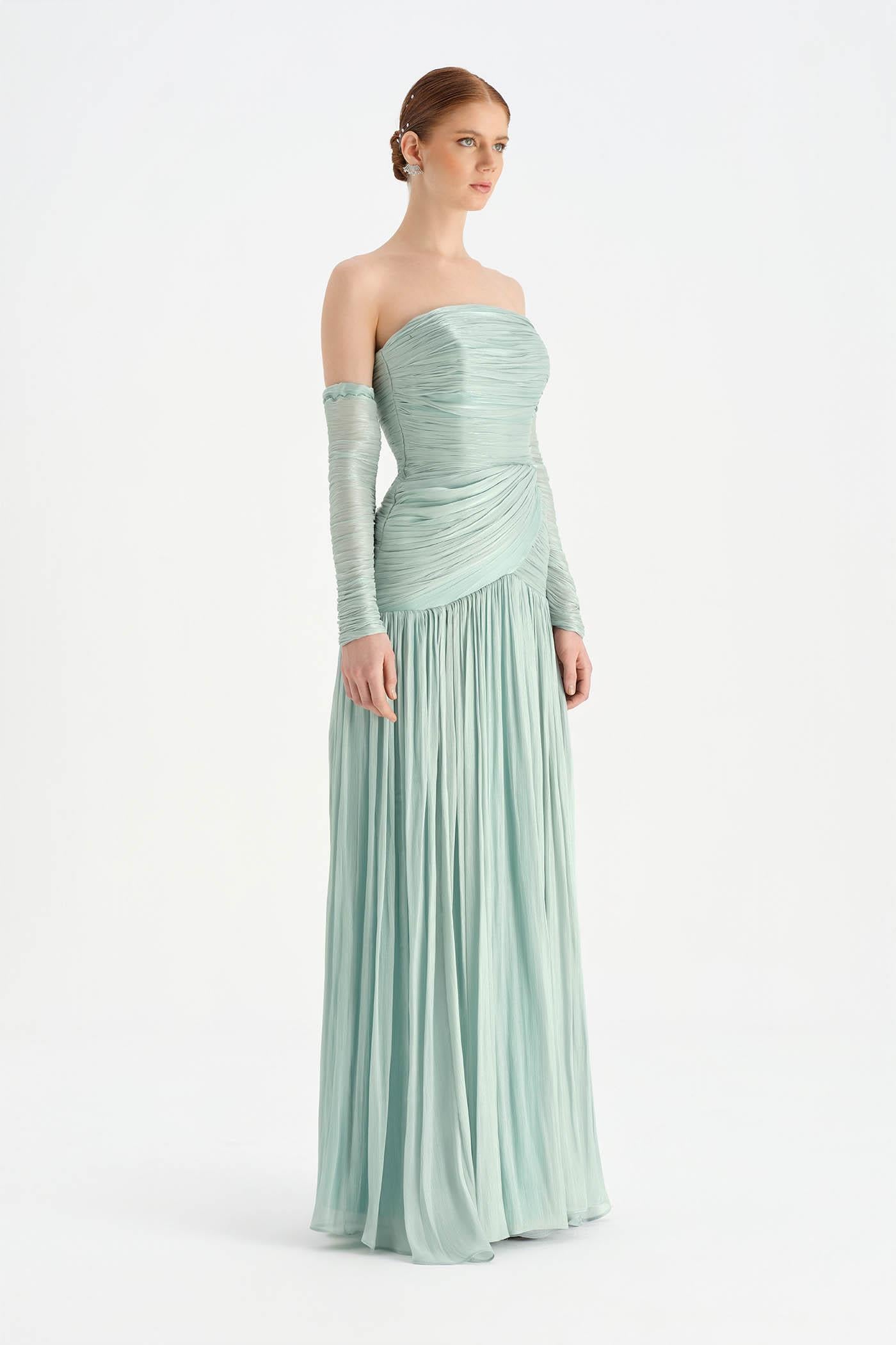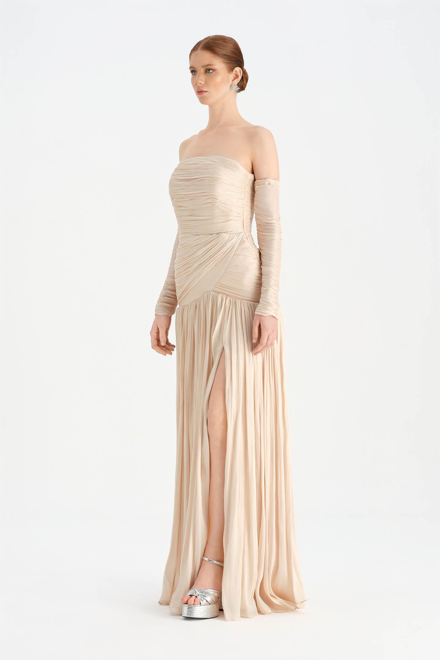 Drapeli Piliseli Uzun Kollu Straplez Abiye Elbise - 26091C