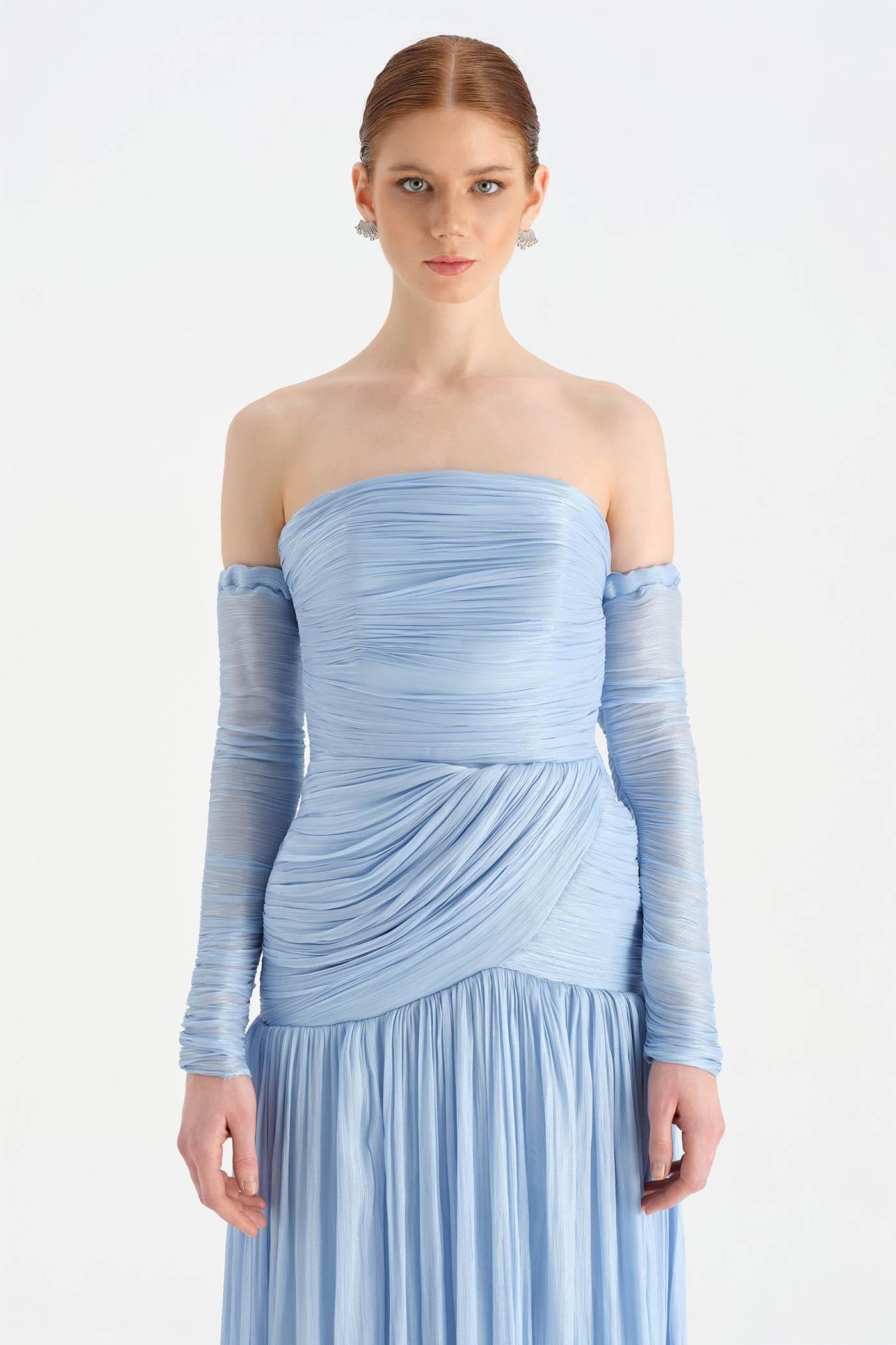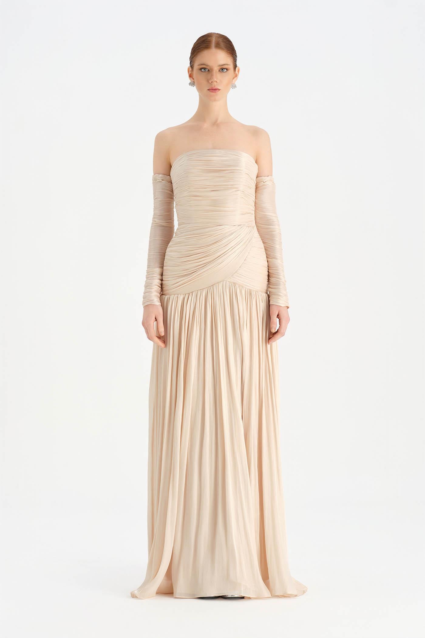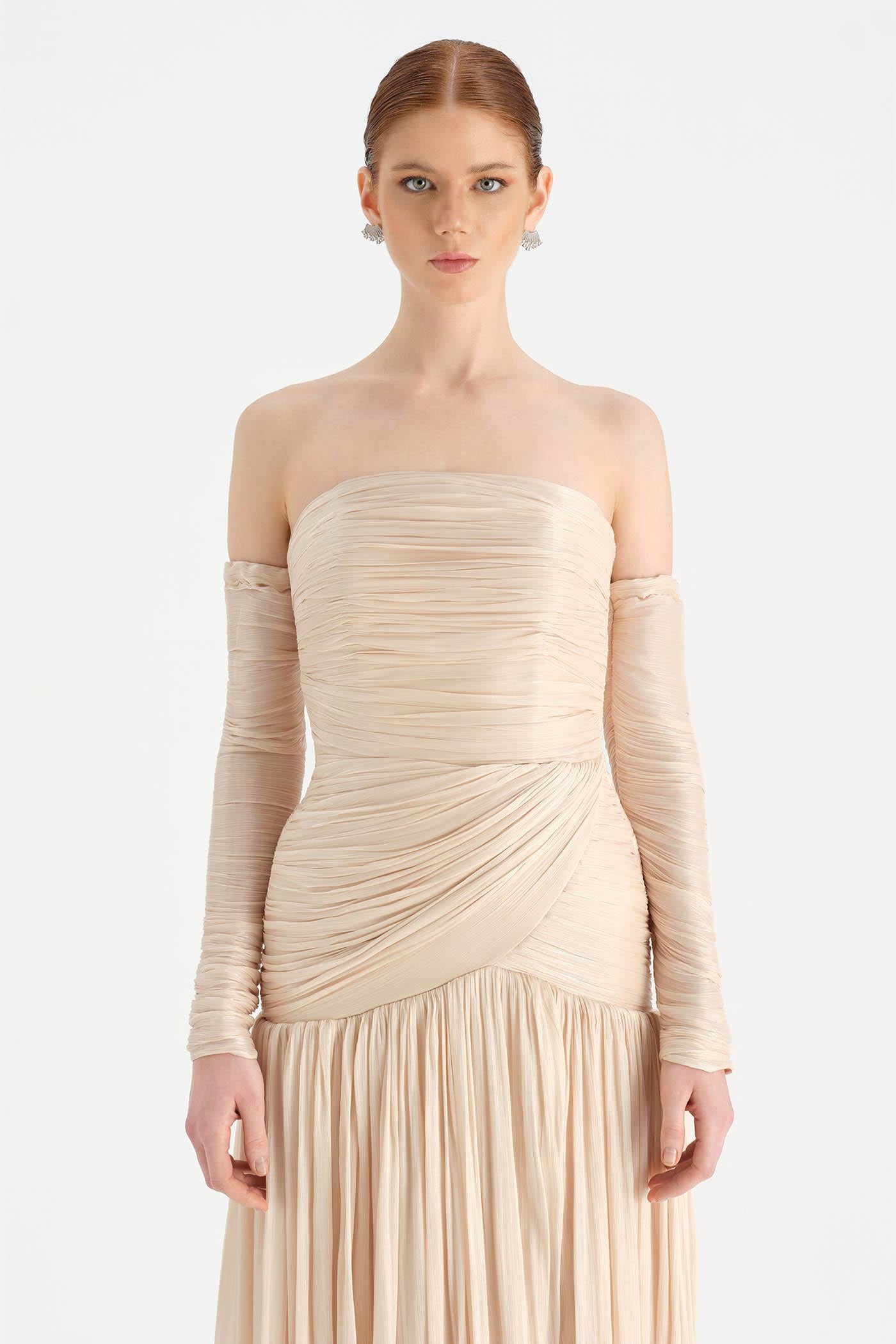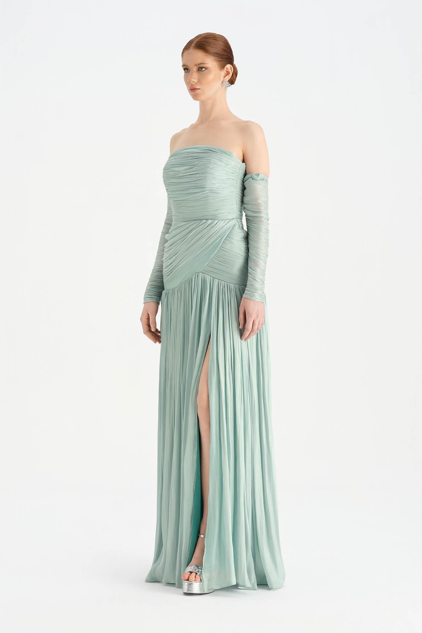 Drapeli Piliseli Uzun Kollu Straplez Abiye Elbise - 26091C