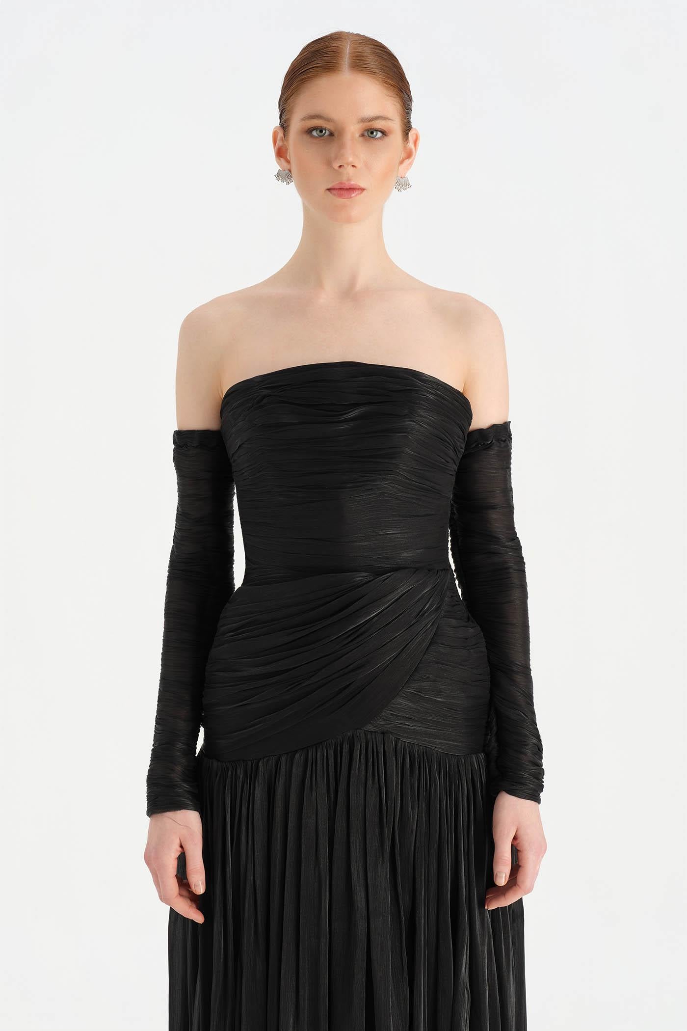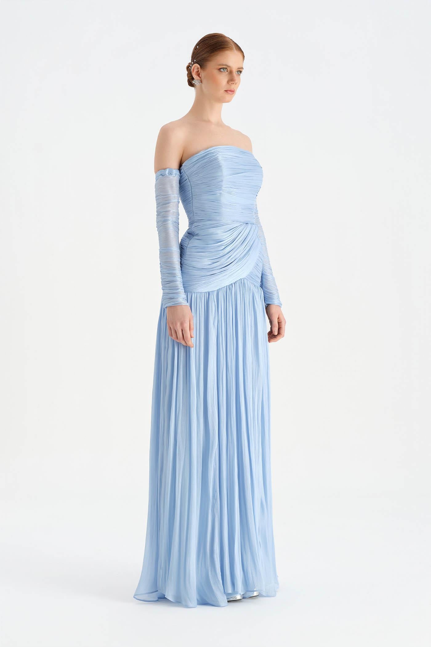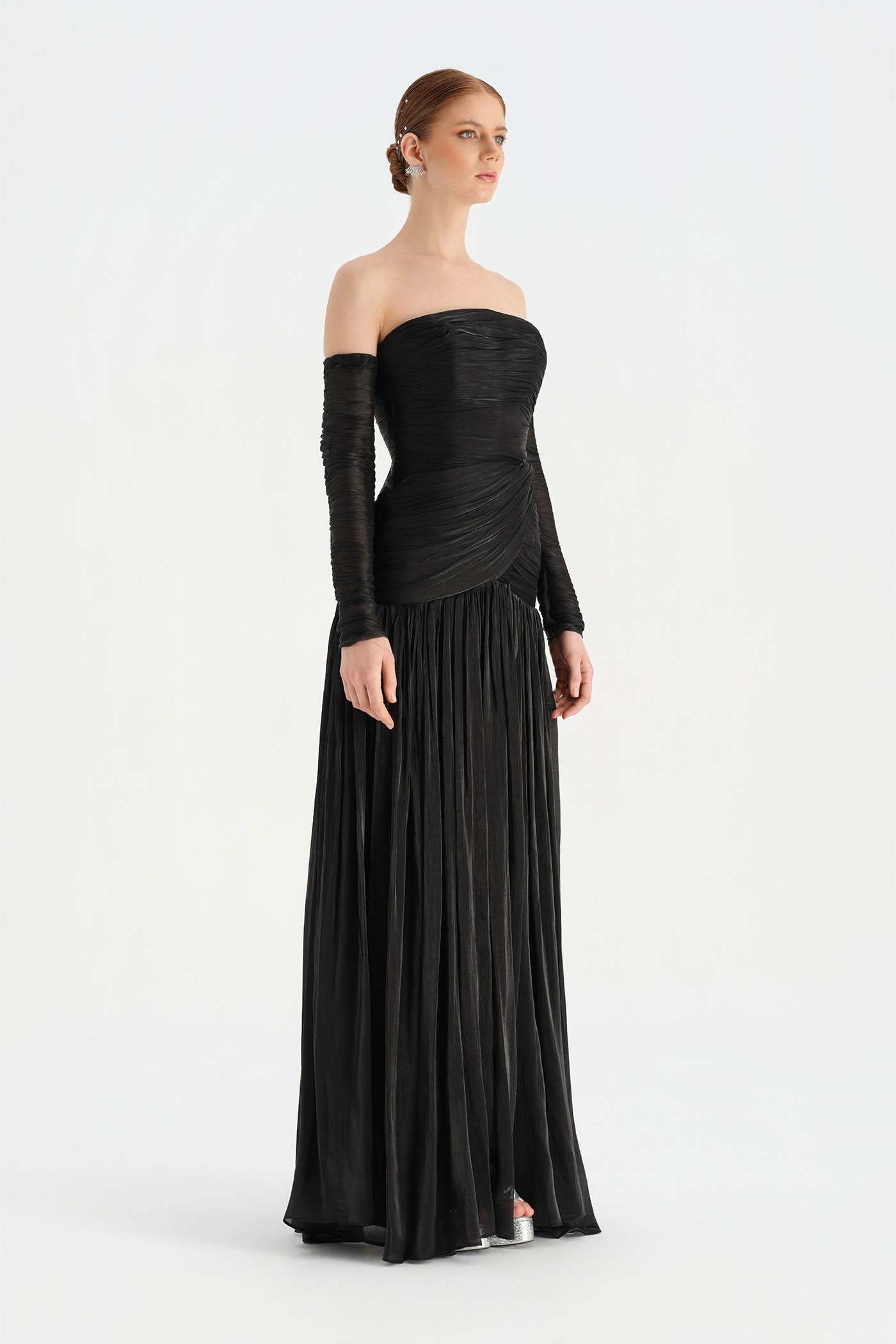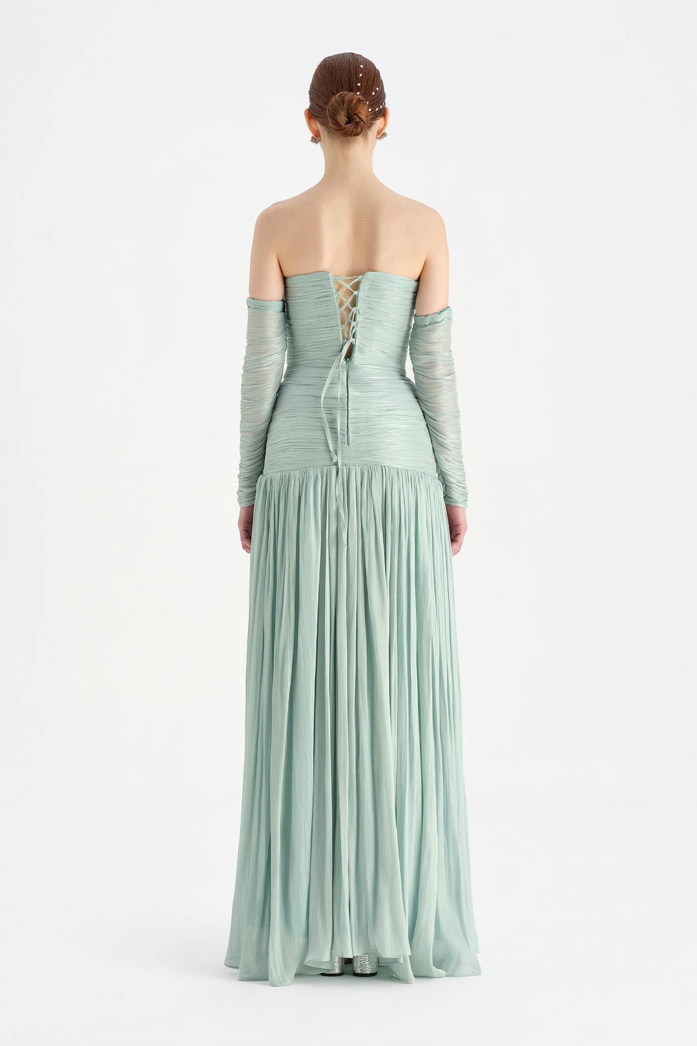 Drapeli Piliseli Uzun Kollu Straplez Abiye Elbise - 26091C