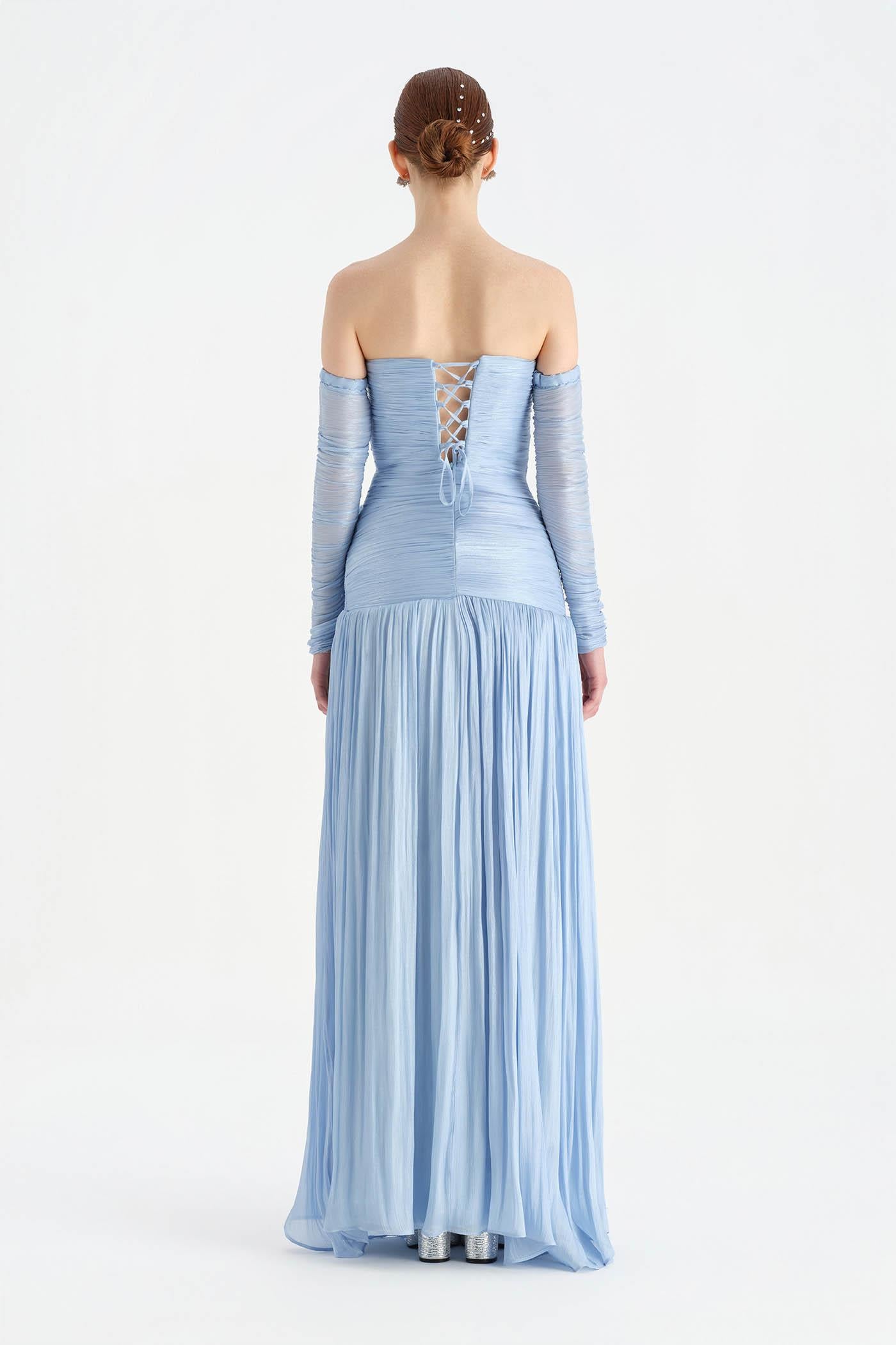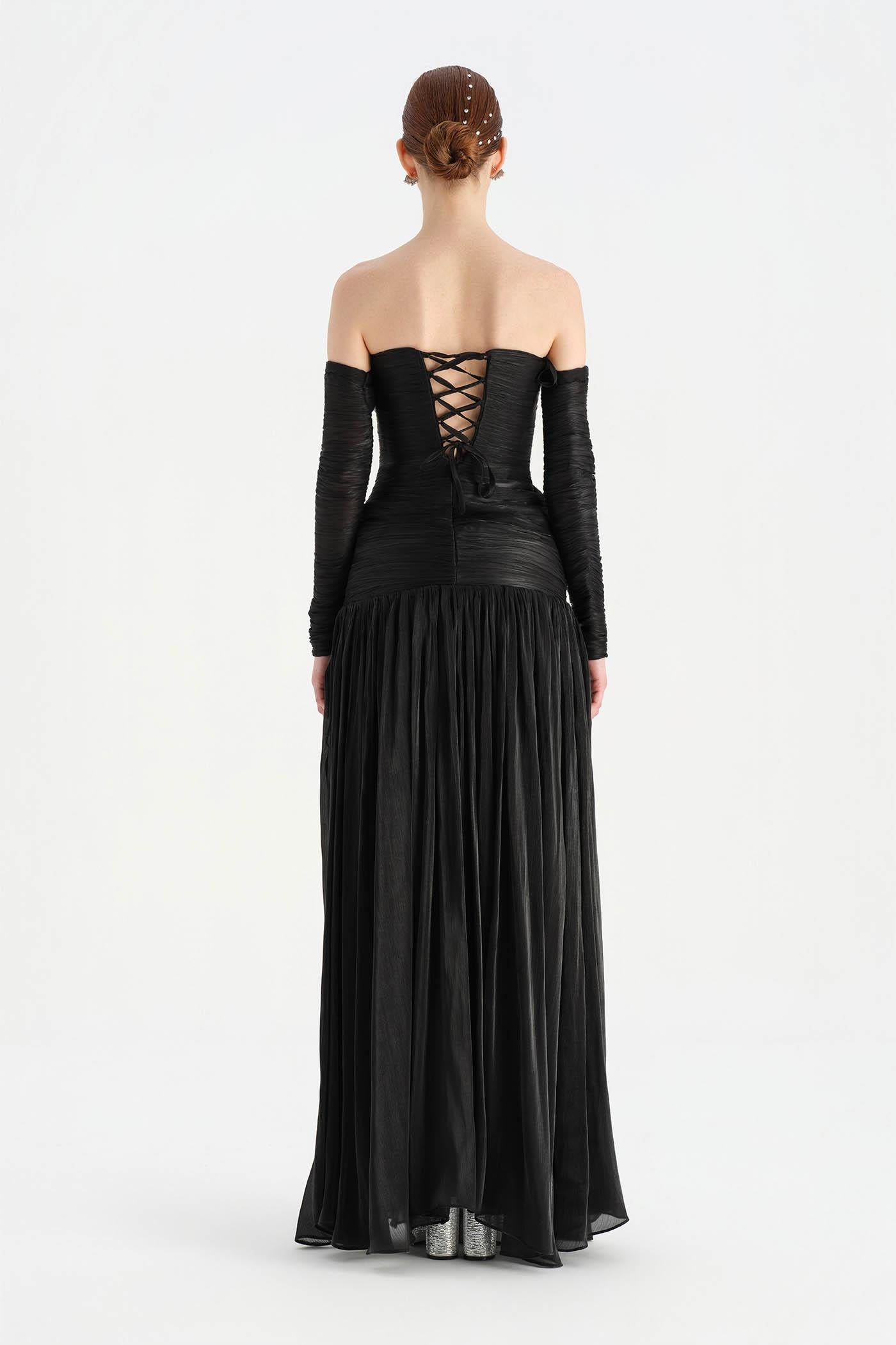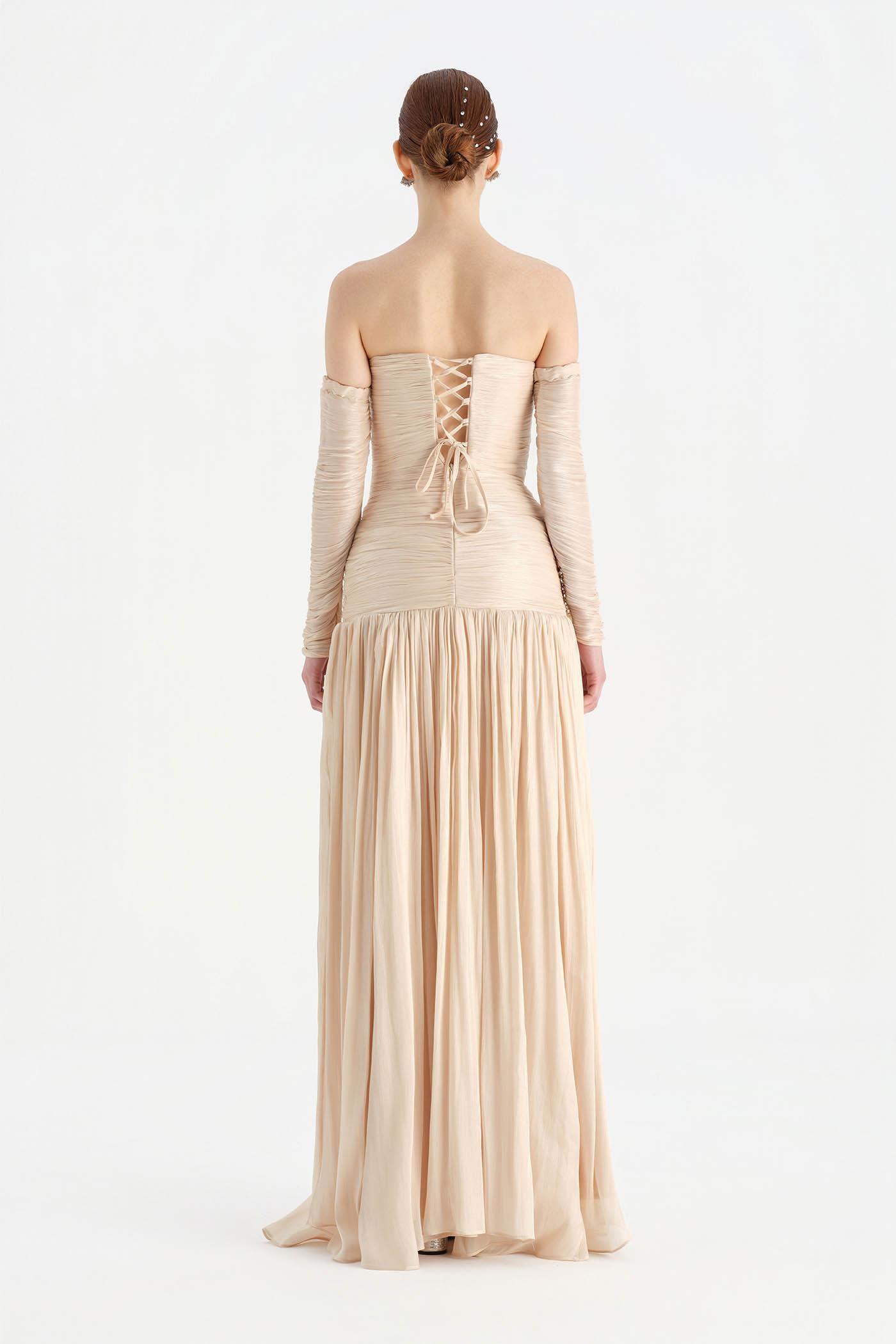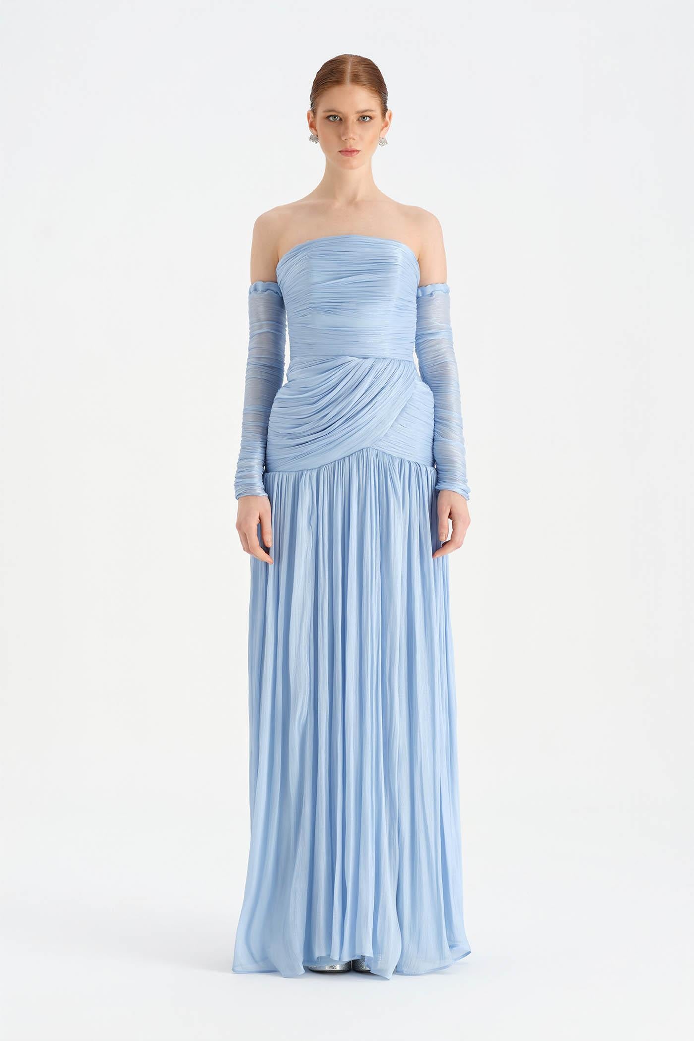 Drapeli Piliseli Uzun Kollu Straplez Abiye Elbise - 26091C